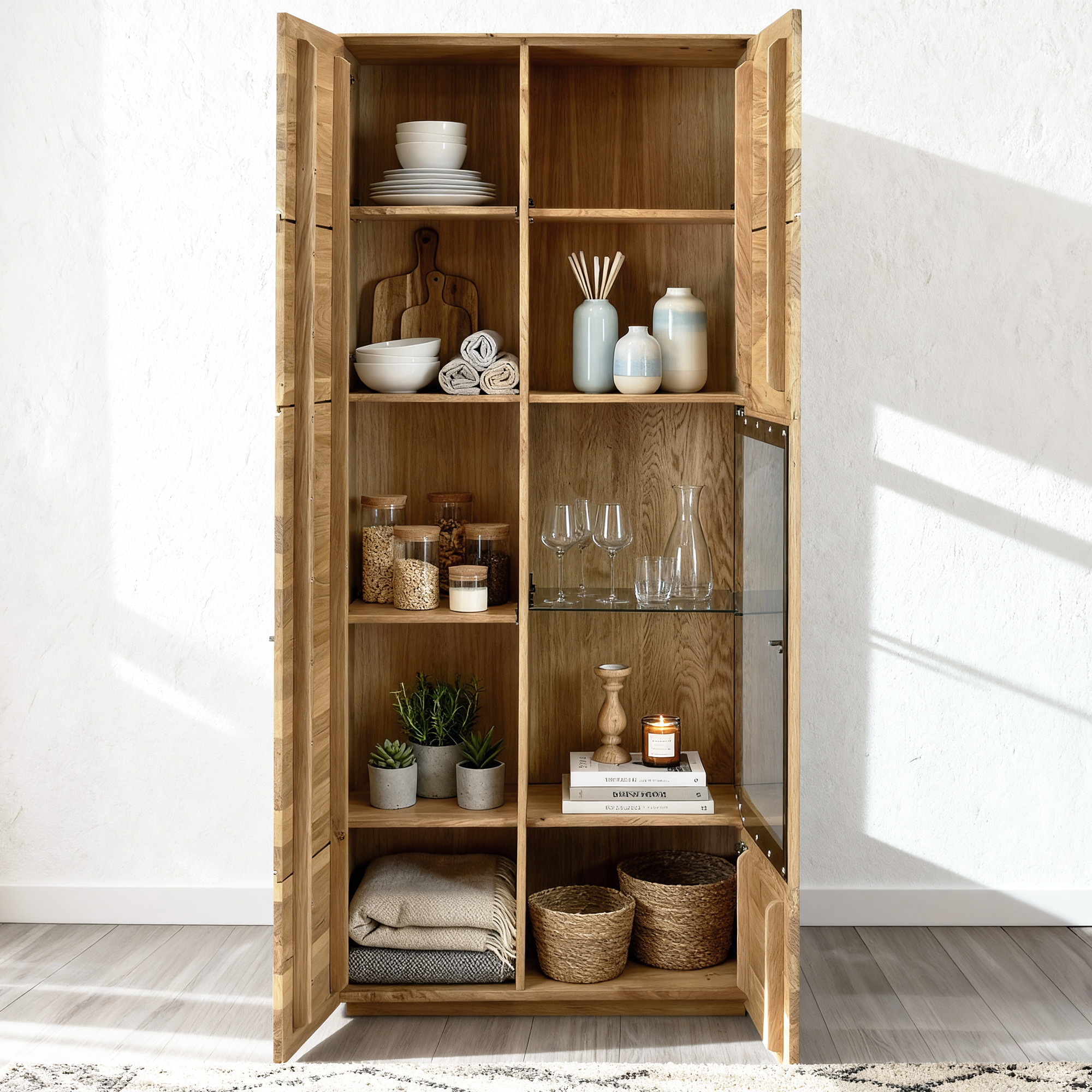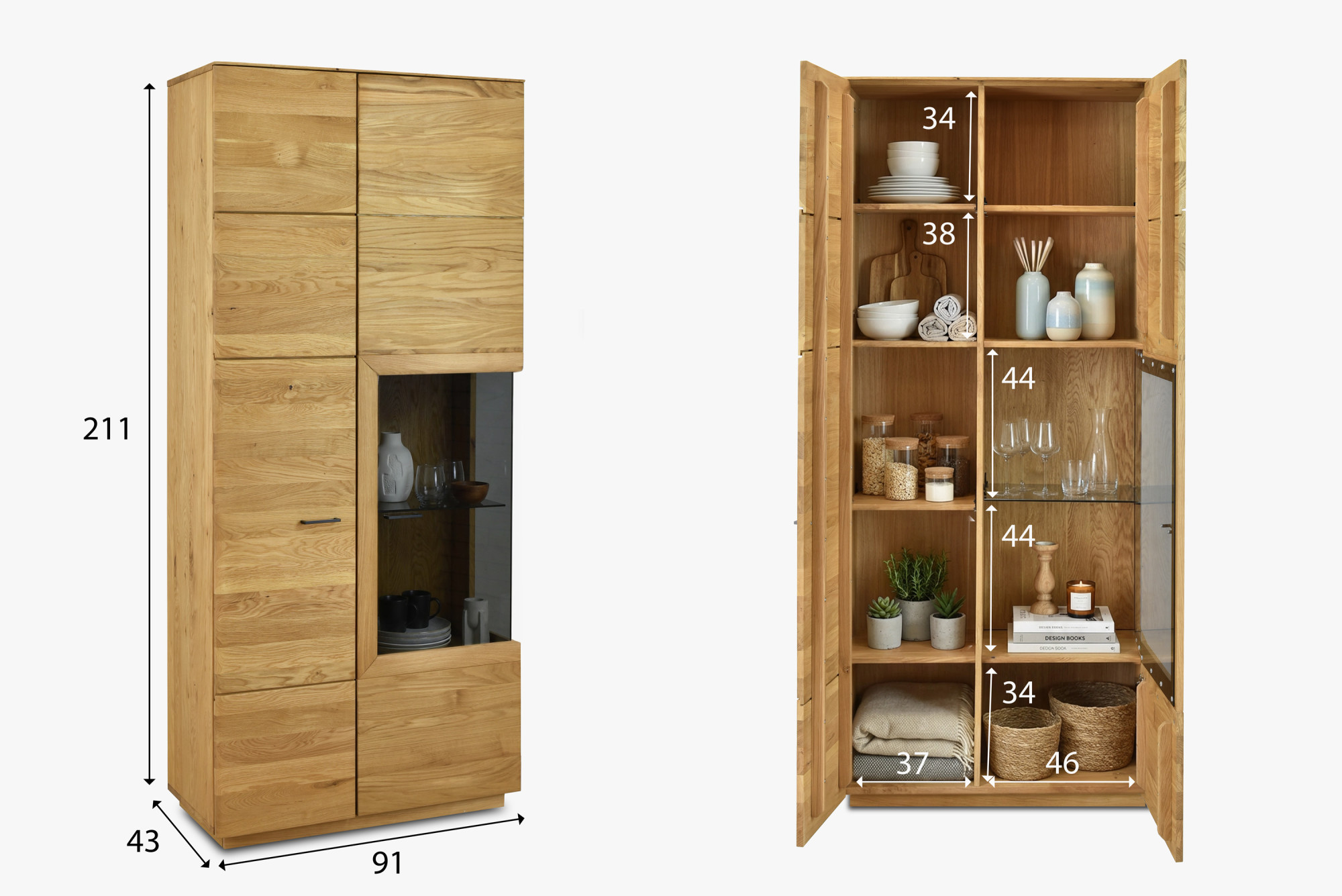 Im geöffneten Zustand ist der Innenraum praktisch auf zwei Hälften mit vielen Abstellflächen aufgeteilt. Die Vitrine verfügt über ein Glasfachbrett und mehrere Holzregale für maximale Variabilität. Die Kollektion Bosco bringt moderne Möbel aus Naturholz mit charakteristischen sanft abgerundeten Kanten, die ein luxuriöses und elegantes Erscheinungsbild schaffen. Alle Stücke werden vollständig montiert geliefert. Die Oberfläche ist mit Öl in der Farbe Natural Oak behandelt, das die natürliche Holzmaserung hervorhebt. Die einzelnen Stücke der Kollektion können miteinander kombiniert werden, um ein harmonisches Interieur zu schaffen.