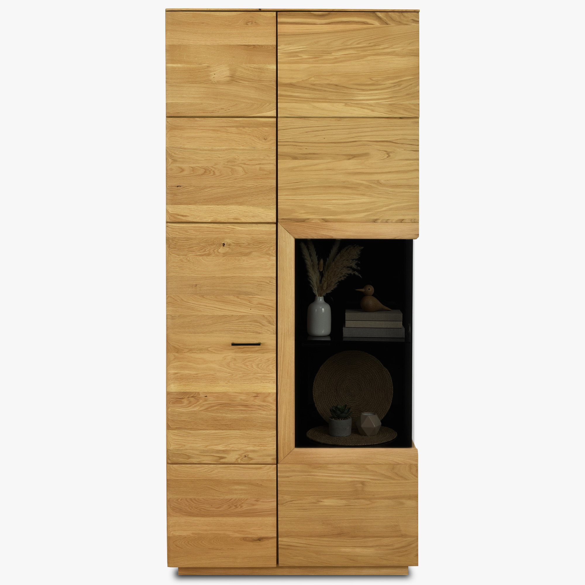 Wir präsentieren Ihnen die hohe Eichenvitrine aus der Kollektion Bosco, die zum Blickfang in Ihrem Wohnzimmer oder Esszimmer wird. Diese zweitürige Vitrine aus massivem Eichenholz mit den Gesamtmaßen 211 cm Höhe und 91 cm Breite bietet großzügigen Stauraum für Ihre Lieblingsgegenstände. Die Vitrine ist mit zwei Türen ausgestattet – eine ist vollständig aus Holz für versteckte Aufbewahrung, die andere ist teilweise mit schwarzem Glas verglast, was eine elegante Präsentation Ihrer Schätze, Porzellan oder Dekoration ermöglicht.
