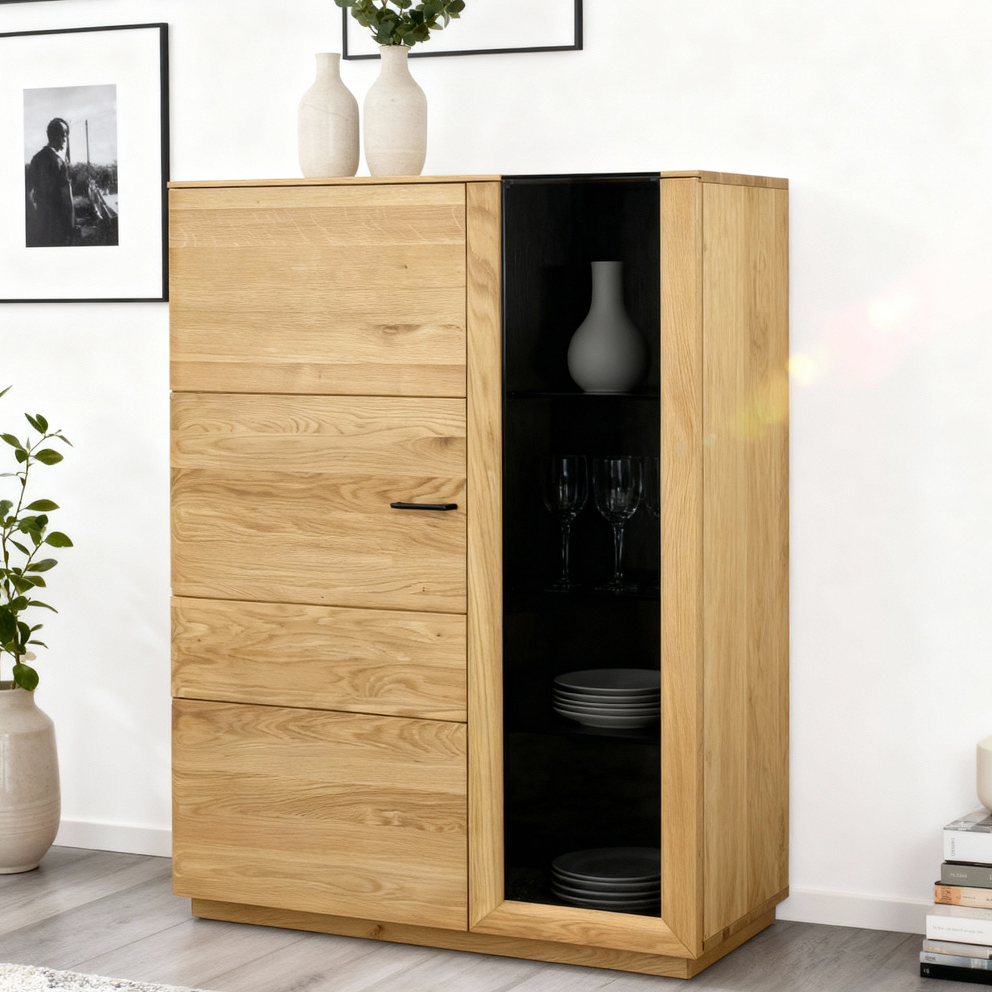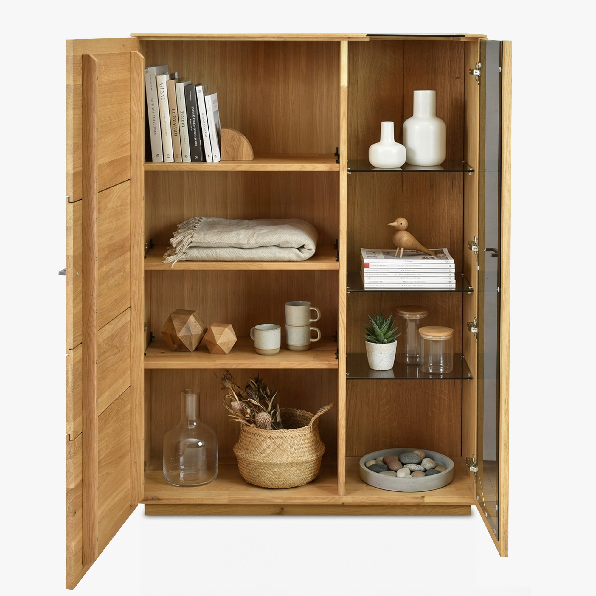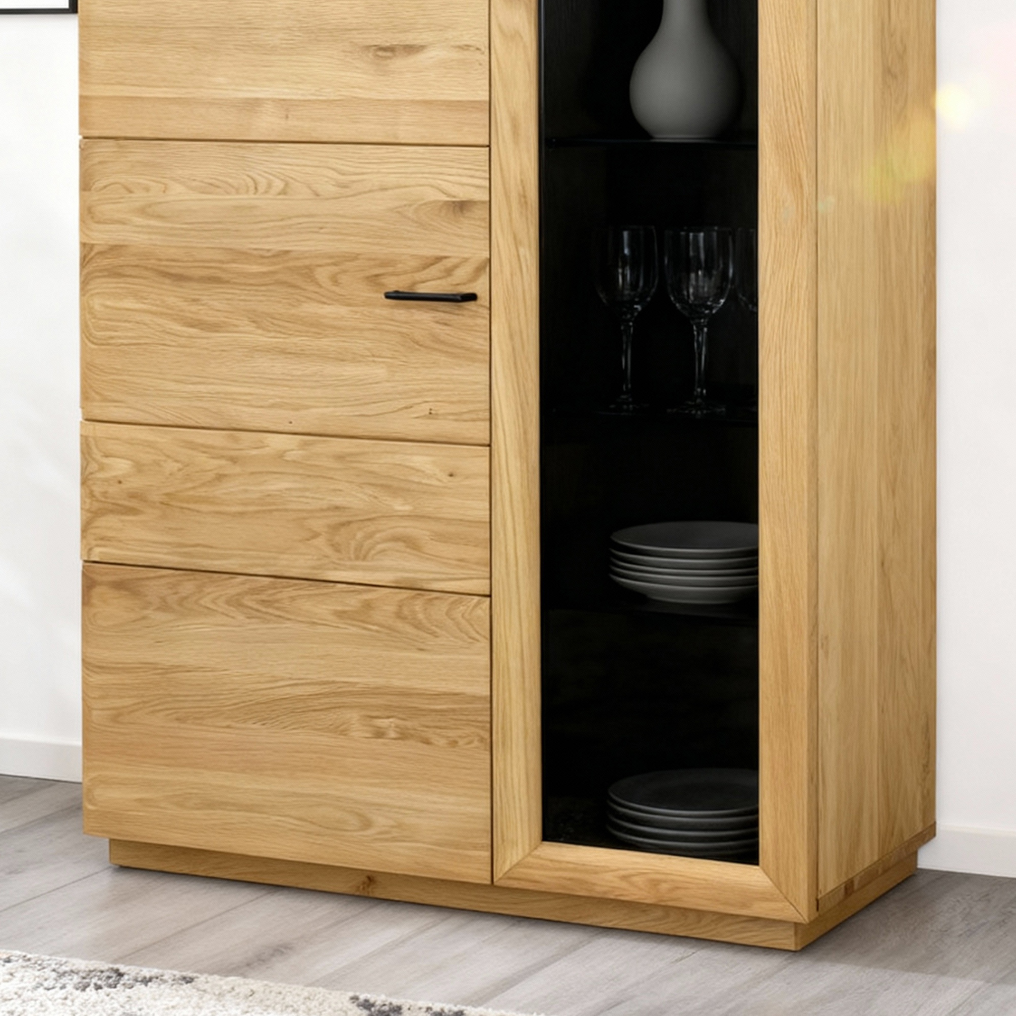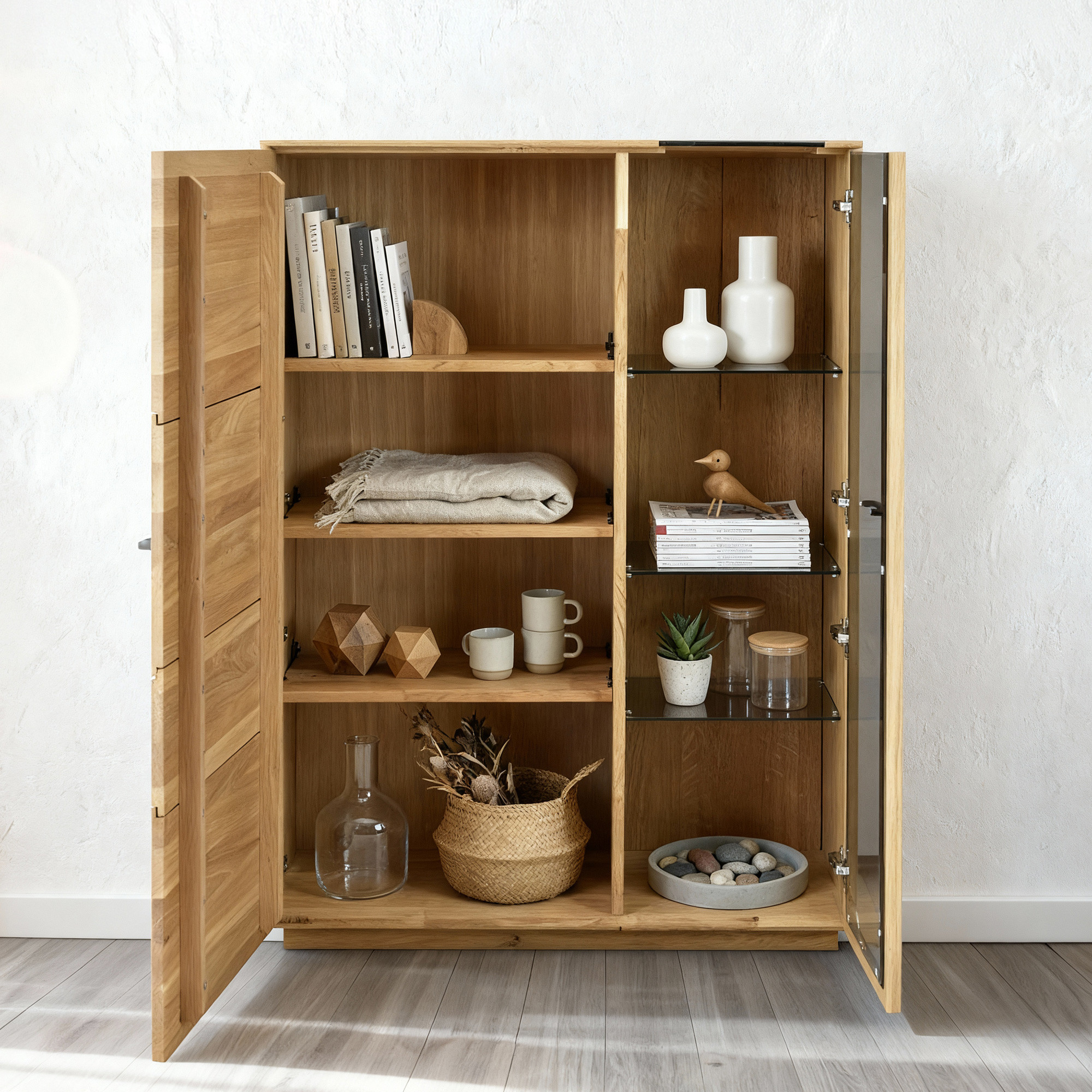 Suchen Sie eine elegante Eichenvitrine, die Praktikabilität mit zeitlosem Design verbindet? Wir präsentieren Ihnen eine zweiturige Vitrine aus der Kollektion Bosco, hergestellt aus massivem Eichenholz. Mit einer Höhe von 141 cm und einer Breite von 101 cm ist diese Vitrine die ideale Wahl für das Wohnzimmer, den Essbereich oder den Flur. Die Vitrine verfügt über zwei Türen – eine vollständig aus Holz für diskrete Aufbewahrung, die andere ist teilweise mit schwarzem Glas verglast, was eine stilvolle Präsentation Ihres Porzellans, Glases oder Ihrer Dekoration ermöglicht.
