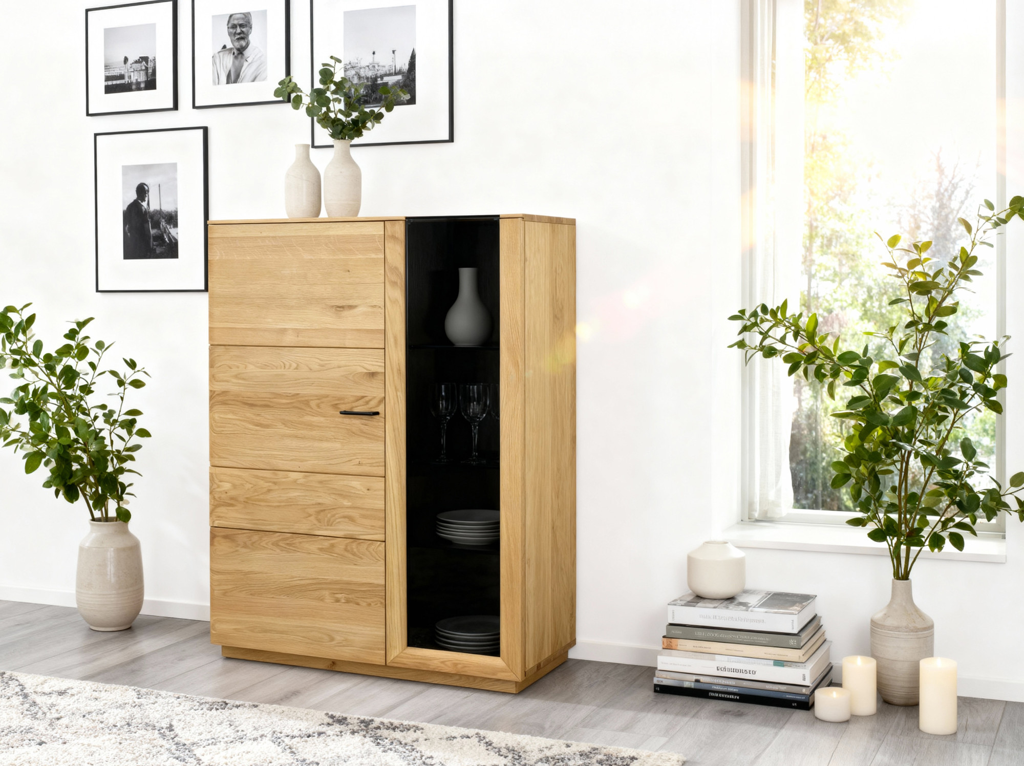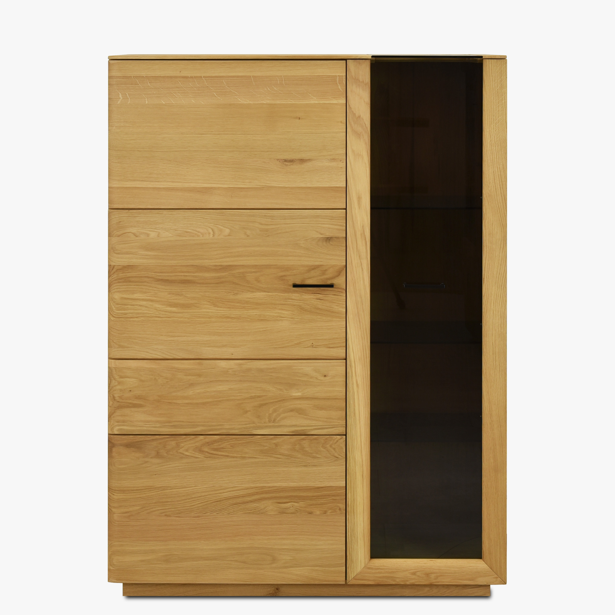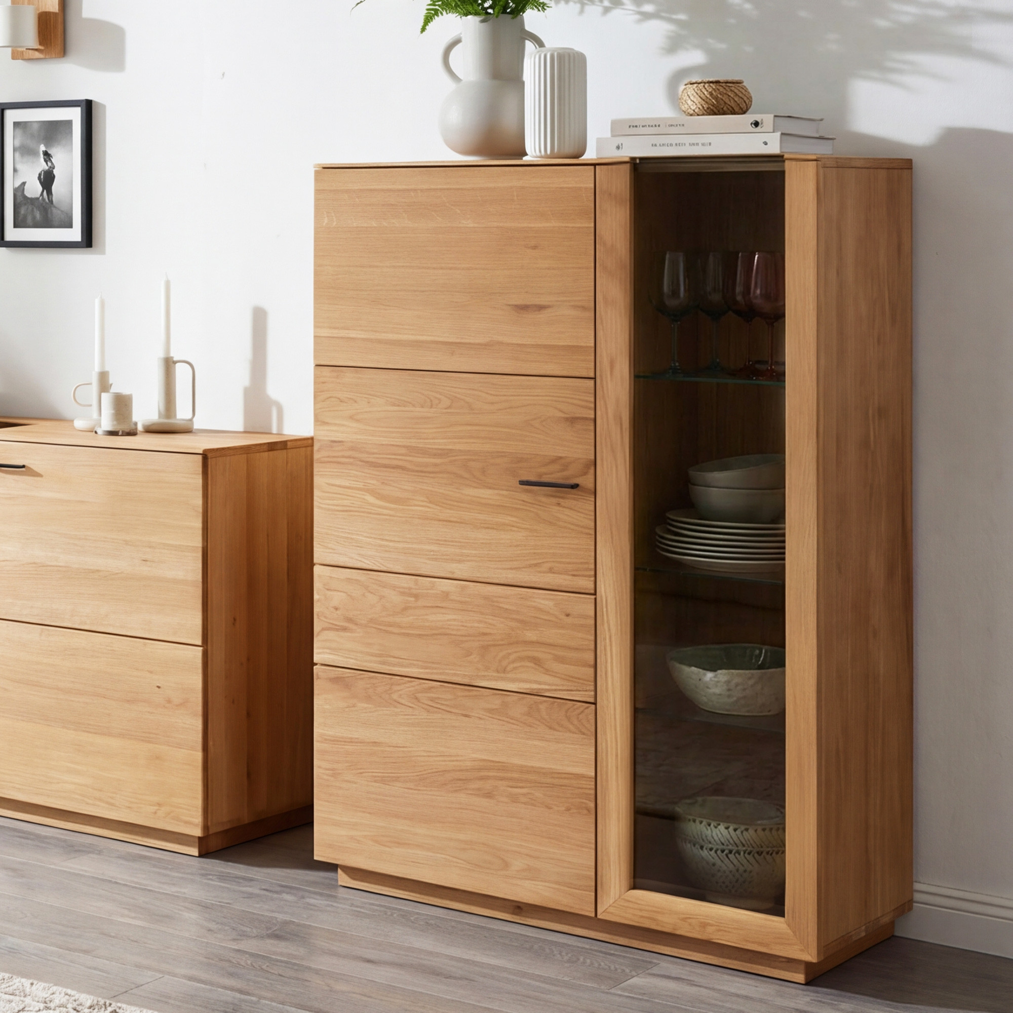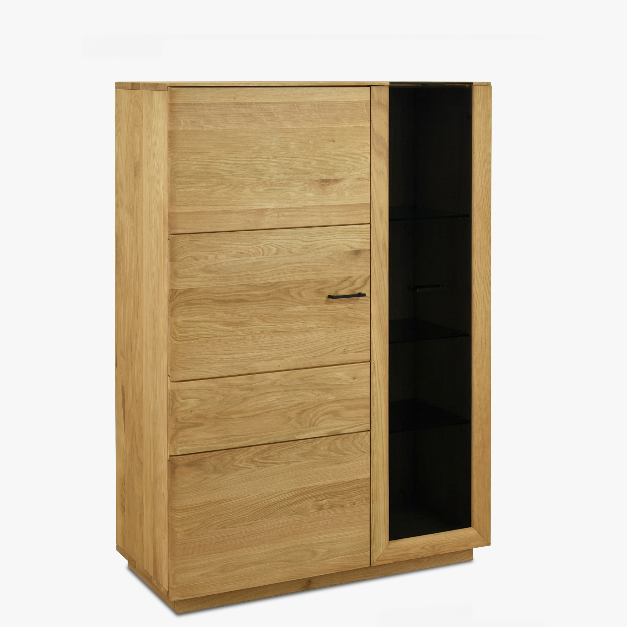 Suchen Sie eine elegante Eichenvitrine, die Praktikabilität mit zeitlosem Design verbindet? Wir präsentieren Ihnen eine zweiturige Vitrine aus der Kollektion Bosco, hergestellt aus massivem Eichenholz. Mit einer Höhe von 141 cm und einer Breite von 101 cm ist diese Vitrine die ideale Wahl für das Wohnzimmer, den Essbereich oder den Flur. Die Vitrine verfügt über zwei Türen – eine vollständig aus Holz für diskrete Aufbewahrung, die andere ist teilweise mit schwarzem Glas verglast, was eine stilvolle Präsentation Ihres Porzellans, Glases oder Ihrer Dekoration ermöglicht.
