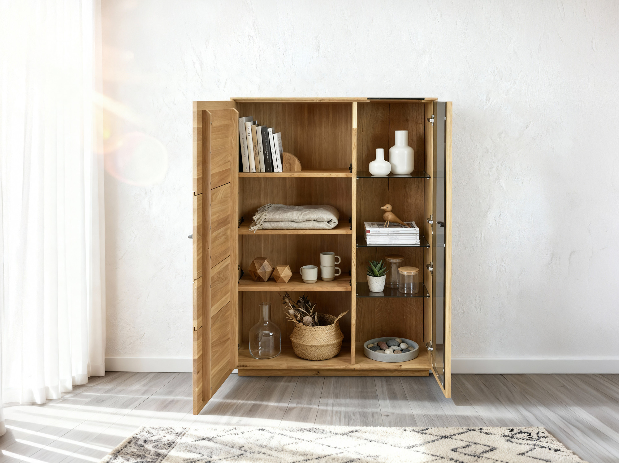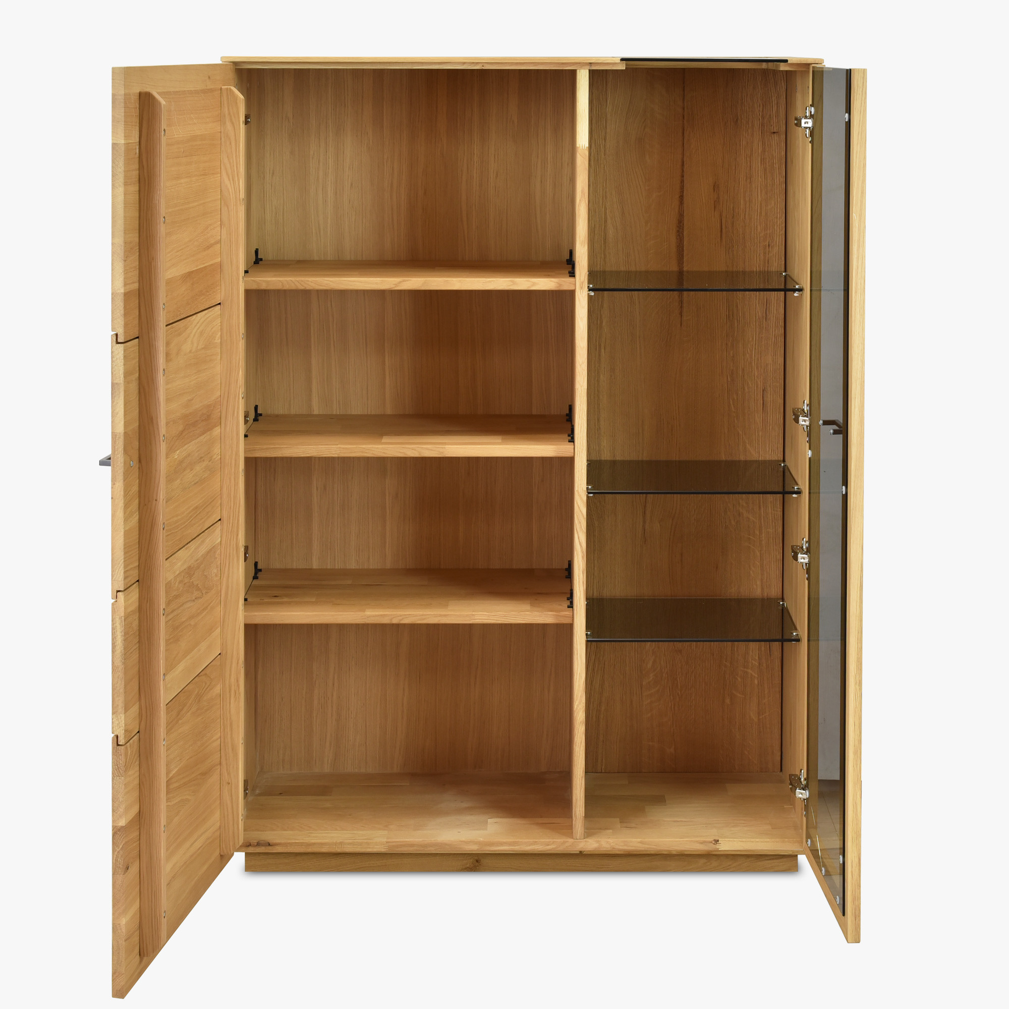 Der Innenraum der Vitrine ist beim Öffnen praktisch in zwei Hälften geteilt mit vielen Ablageflächen. Es steht ein Glasboden und mehrere Holzregale für eine variable Anordnung zur Verfügung. Die Kollektion Bosco bietet moderne Möbel aus Naturholz mit typischen leicht abgerundeten Kanten und Abschlüssen, die das Möbelstück luxuriös und elegant wirken lassen. Alle Stücke werden vollständig montiert geliefert, sodass eine aufwendige Montage entfällt. Die Oberfläche ist mit Öl in der Farbe Eiche Natur behandelt, das die natürliche Holzstruktur schön hervorhebt. Die Kollektionsteile sind miteinander kombinierbar.