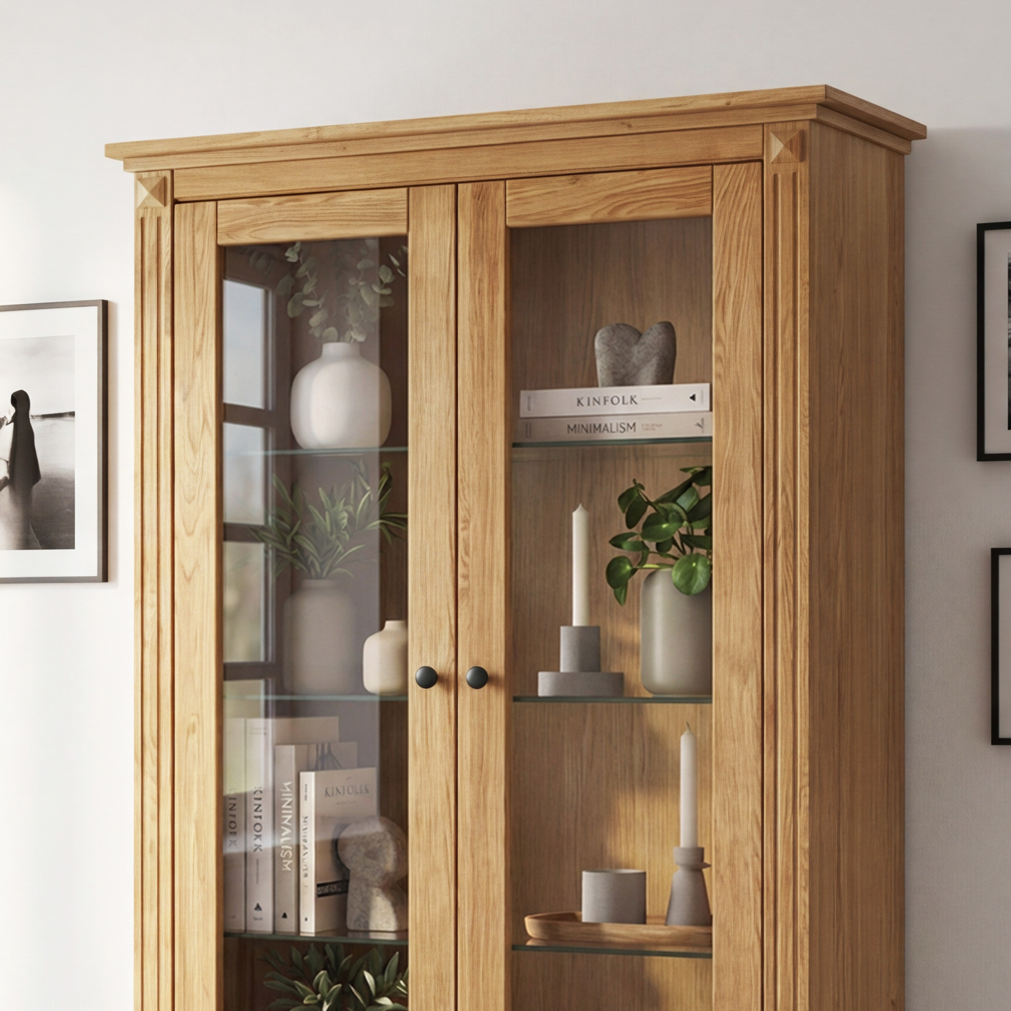 Die vorderen Türen und die obere Platte sind aus massivem Eichenholz gefertigt, die Seiten und der Korpus bestehen aus hochwertiger Eichfurnier. Die Oberfläche ist sorgfältig mit dänischem Livos-Öl behandelt, das die natürliche Holzstruktur betont und langanhaltenden Schutz bietet. Türen und Schubladen sind mit einem Soft-Close-Mechanismus für ein leises und sanftes Schließen ausgestattet. Minimalistische metallene Griffe in Schwarz ergänzen elegant den rustikalen Charakter des Möbels. Feine Fräsungen an den Seiten der Front unterstreichen das skandinavische Design mit klaren Linien. Die Holzvitrine steht auf Eichenfüßen, wird komplett montiert geliefert und kann mit weiteren Möbelstücken der Gaja-Kollektion kombiniert werden.