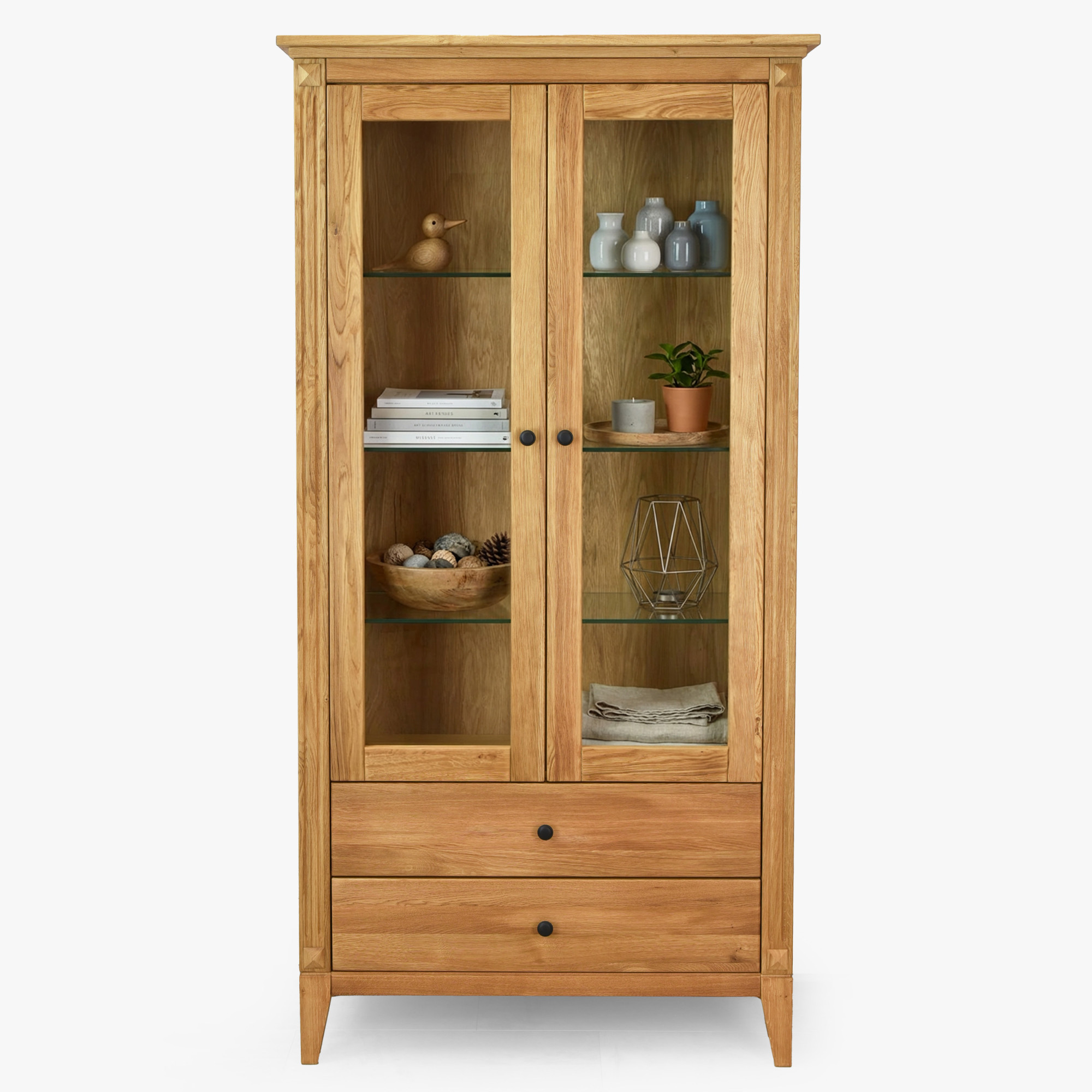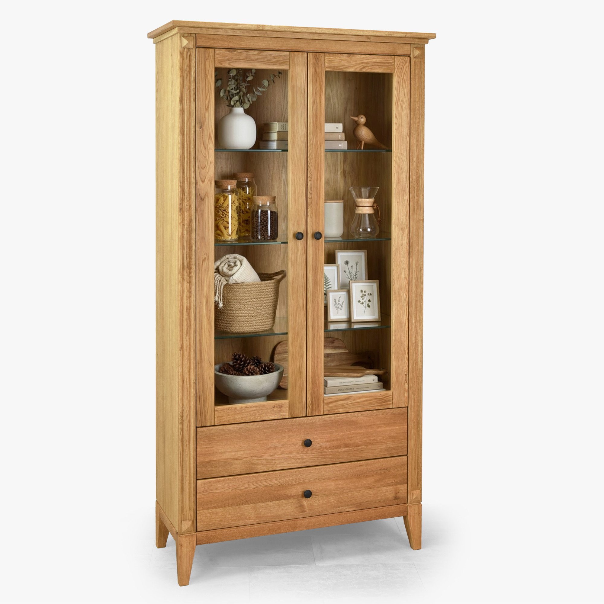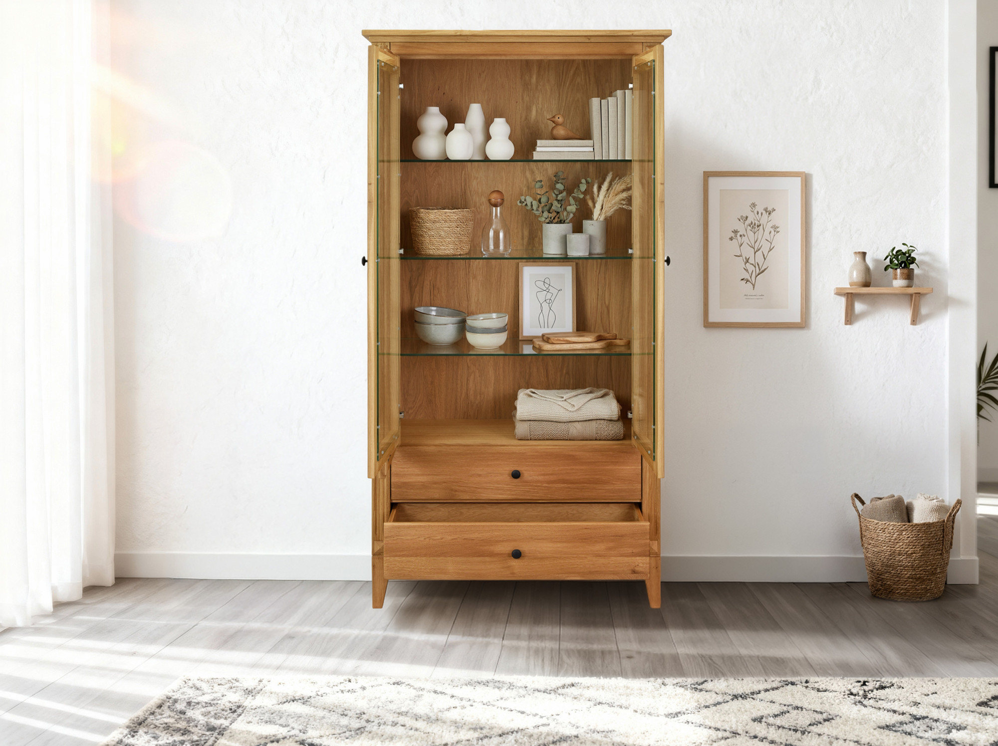 Eichenvitrine Gaja – Glastürvitrine mit Schubladen und Türen im rustikalen nordischen Stil
