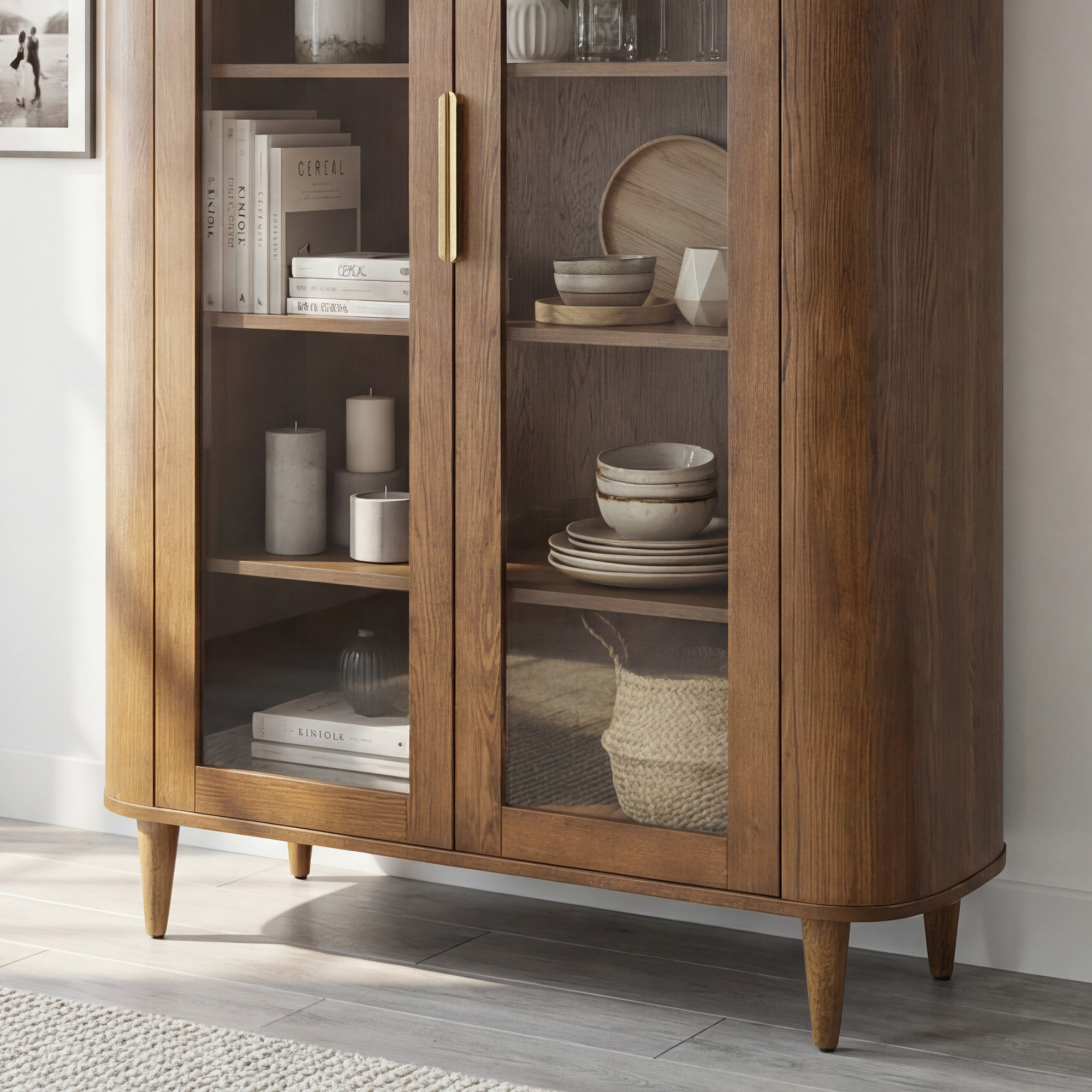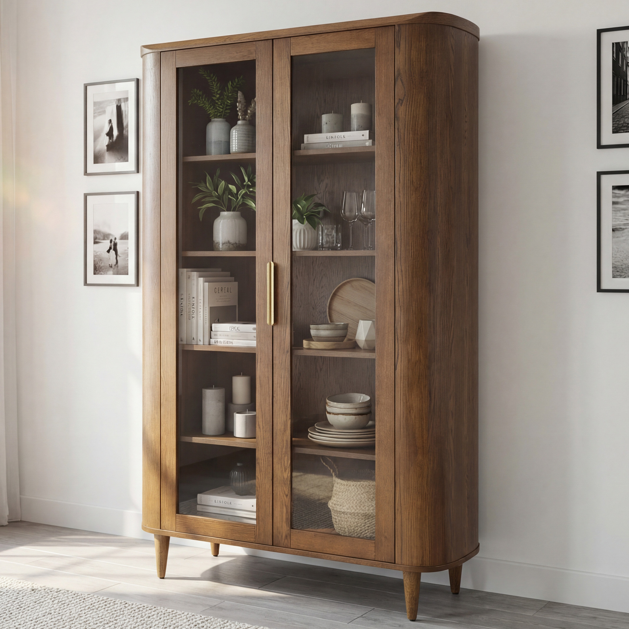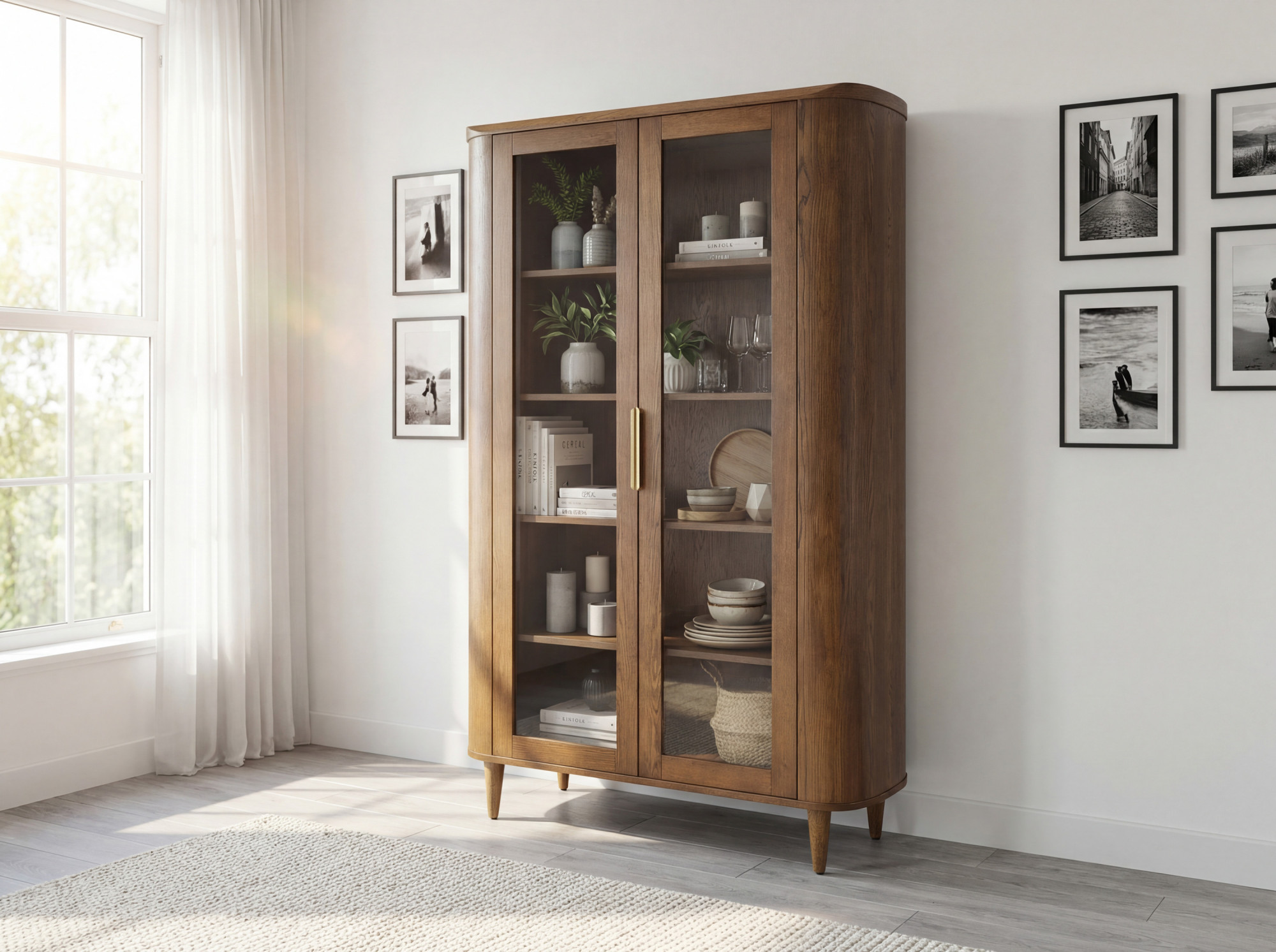 Suchen Sie eine stilvolle Vitrine, die zeitloses Design mit praktischem Stauraum verbindet? Diese zweiturige Glastürvitrine in Nussbaumfarbe ist die ideale Wahl für jedes moderne und klassische Interieur. Dank der abgerundeten Kanten und abgeschrägten Formen wirkt das Möbel elegant und harmonisch. Zwei gläserne Türen ermöglichen eine wirkungsvolle Präsentation Ihres Porzellans, Glases oder Dekors, während die inneren Holzregale genügend Platz zur Ordnung Ihrer Lieblingsstücke bieten.