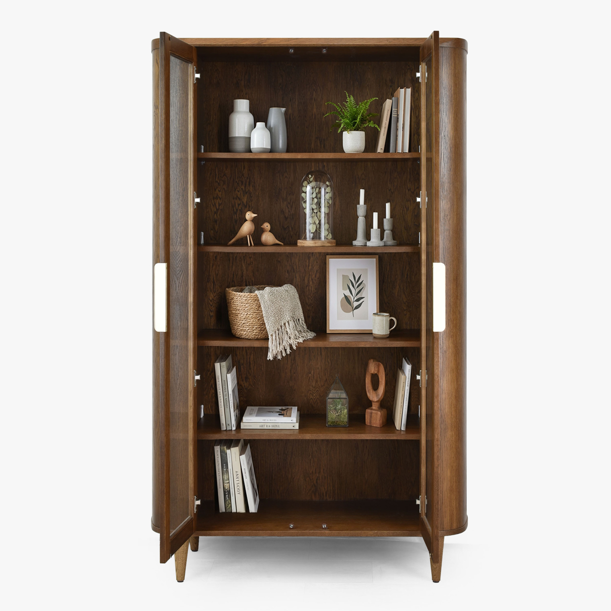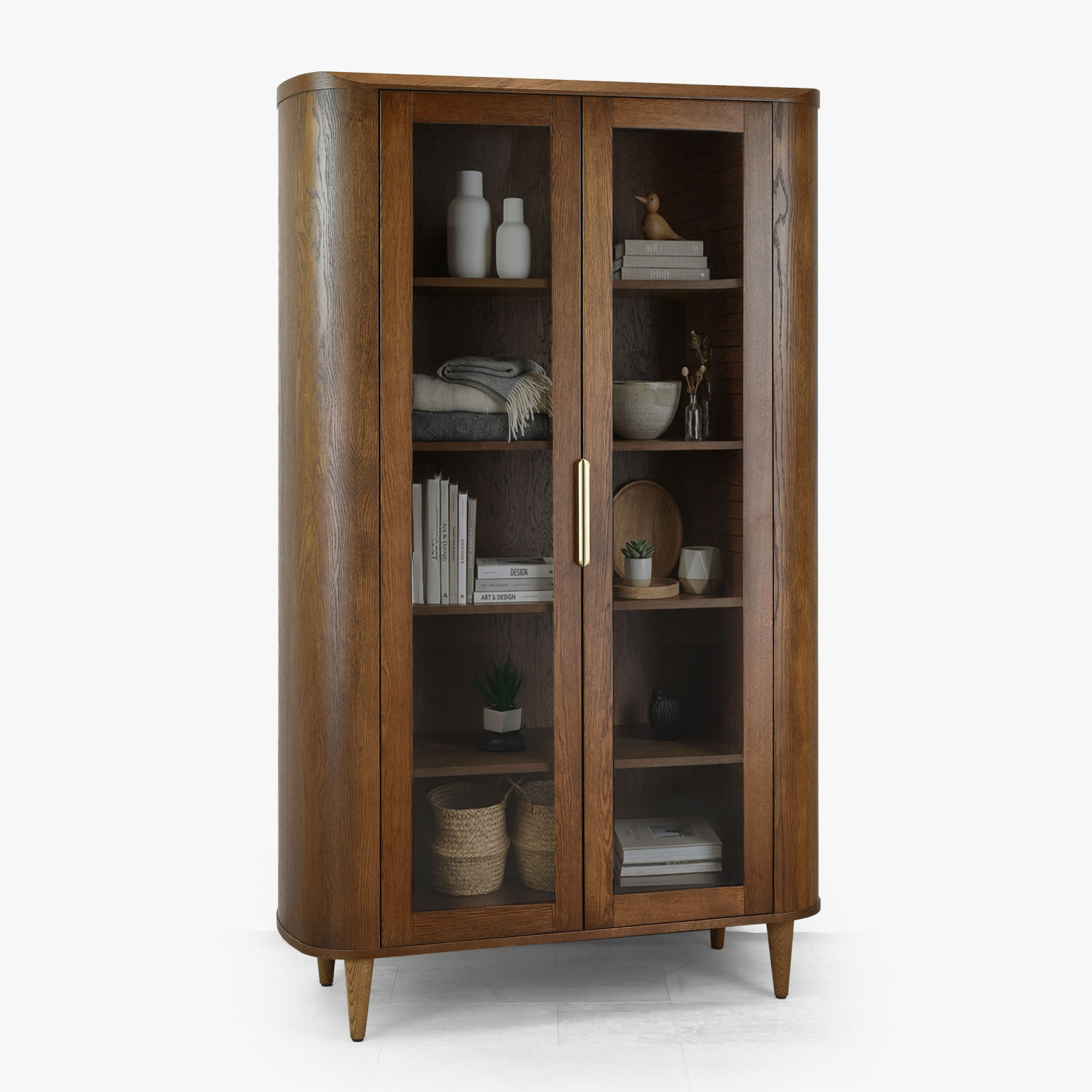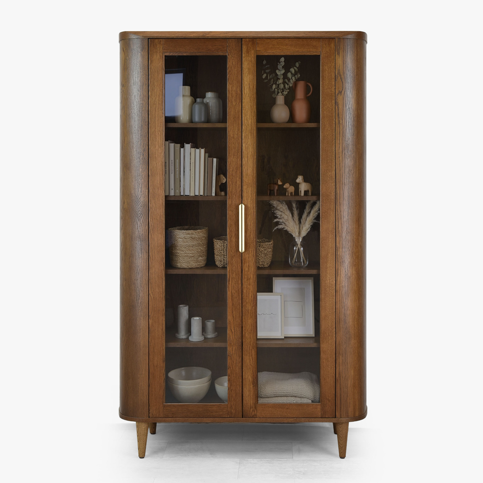 Suchen Sie eine stilvolle Vitrine, die zeitloses Design mit praktischem Stauraum verbindet? Diese zweiturige Glastürvitrine in Nussbaumfarbe ist die ideale Wahl für jedes moderne und klassische Interieur. Dank der abgerundeten Kanten und abgeschrägten Formen wirkt das Möbel elegant und harmonisch. Zwei gläserne Türen ermöglichen eine wirkungsvolle Präsentation Ihres Porzellans, Glases oder Dekors, während die inneren Holzregale genügend Platz zur Ordnung Ihrer Lieblingsstücke bieten.