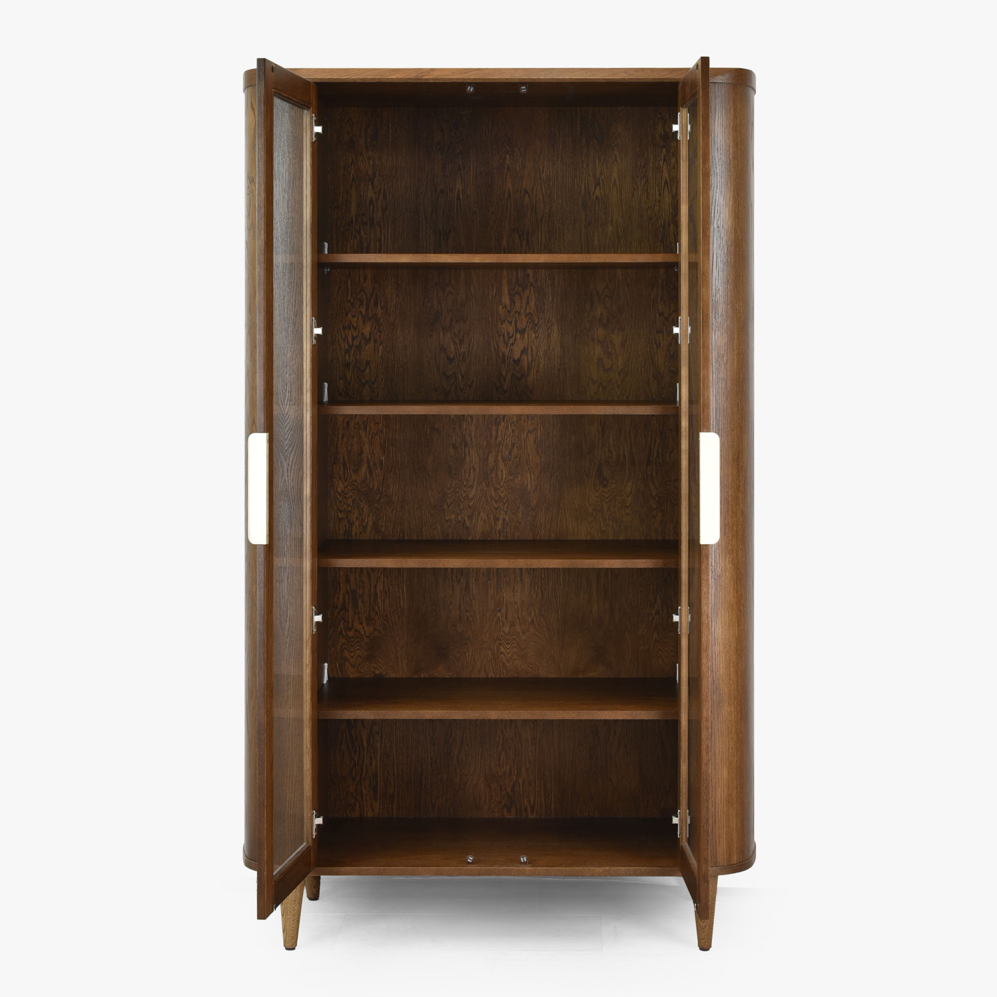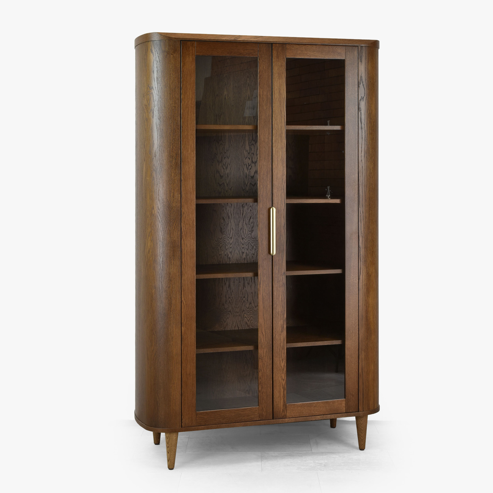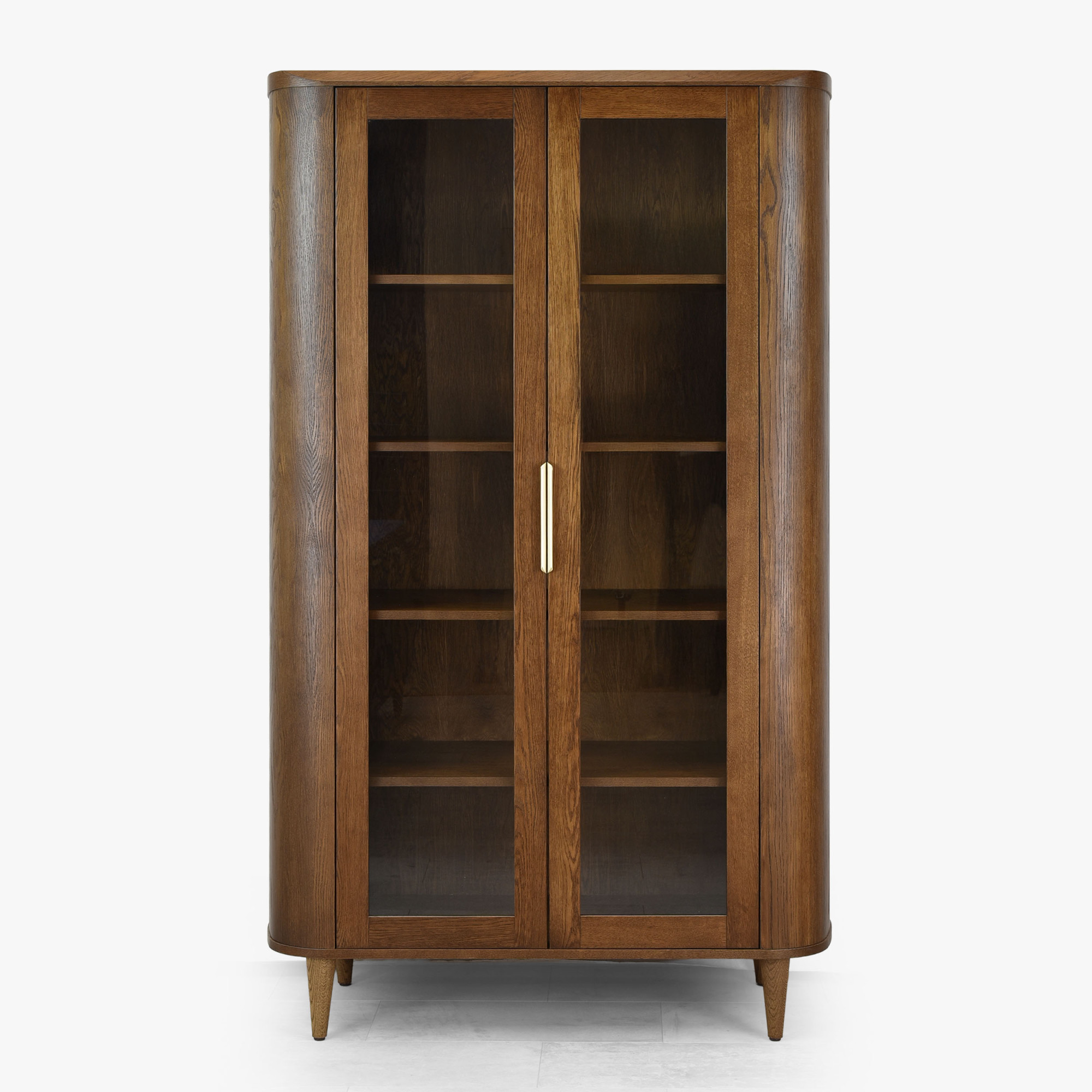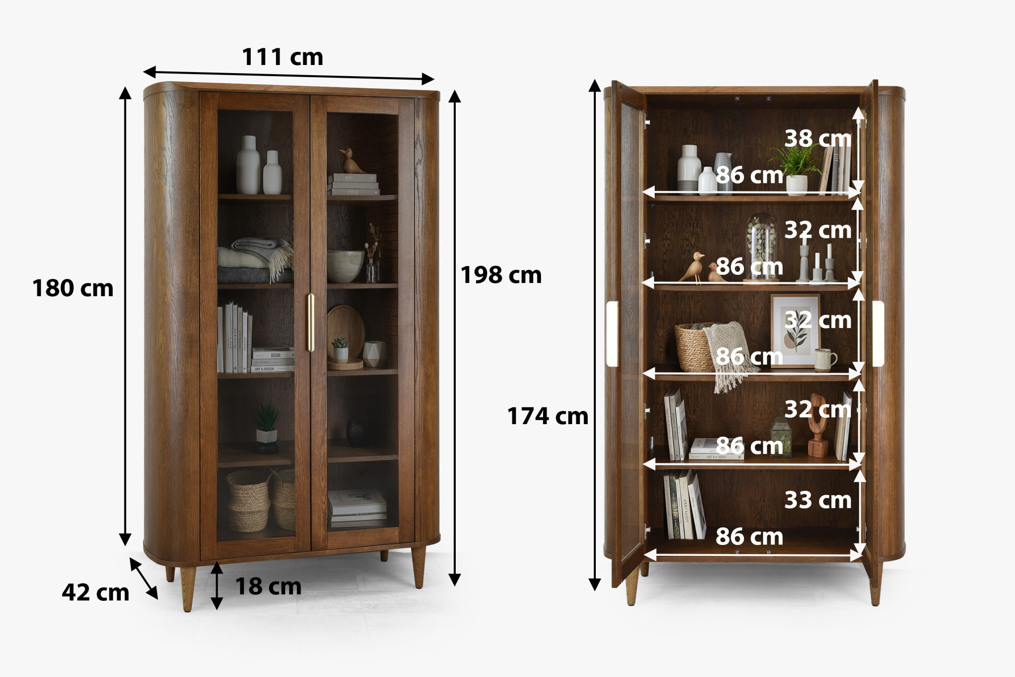 Die Vitrine ist aus Premiumfurnier mit einer tragenden Konstruktion aus Eichenholz und MDF gefertigt, was außergewöhnliche Stabilität und lange Lebensdauer gewährleistet. Die Oberfläche ist mit mattlackiertem Finish behandelt, das nicht nur das Möbel vor Beschädigungen schützt, sondern auch die natürliche Holzstruktur schön betont. Griffe in Goldfarbe verleihen dem Möbelstück einen Hauch von Luxus. Die Maße der Vitrine – Höhe 198 cm, Breite 111 cm und Tiefe 42 cm – machen sie zu einem dominanten, aber unaufdringlichen Element in jedem Raum. Das Möbel wird bereits komplett montiert geliefert, der Kunde befestigt nur die Beine.
