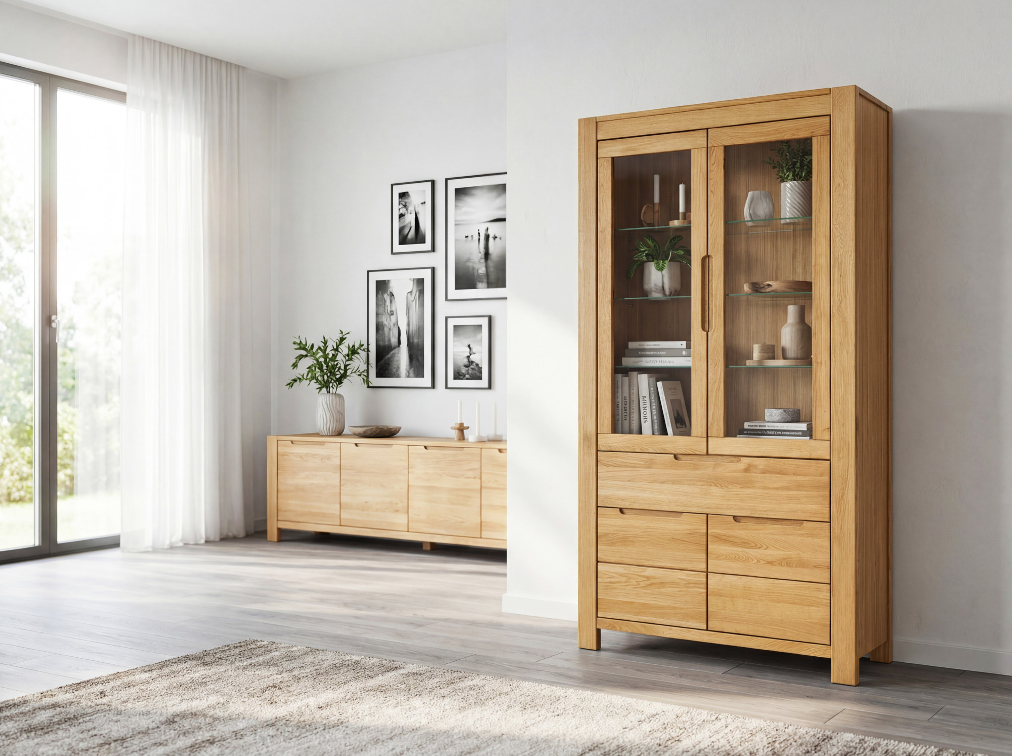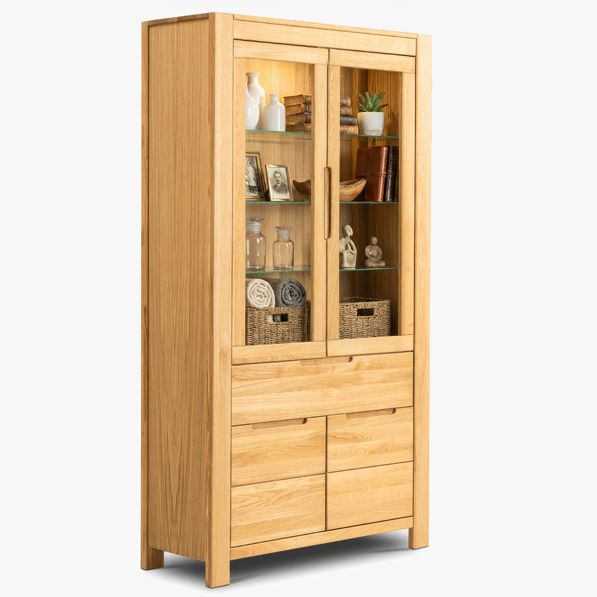 Gestalten Sie Ihr Interieur mit der Eiche Vitrine aus der Napoleon Kollektion und erhalten Sie funktionales Design und ein Stück Natur in einem. Massives Eichenholz, FSC-Zertifikat und präzise Soft-Close-Technologie bieten Komfort und lange Lebensdauer. Durch den Direktverkauf vom Hersteller erhalten Sie erstklassige Qualität zu einem erschwinglichen Preis und die Möglichkeit, Ihre gesamte Zusammenstellung abzustimmen. Unser Familienunternehmen ist seit 1993 tätig und bedient jährlich über 50.000 Kunden in der gesamten EU mit eigenem Transport.