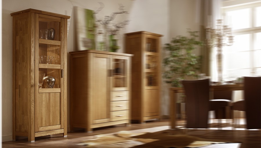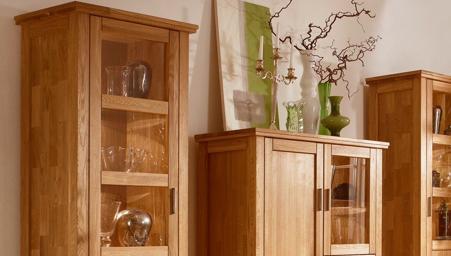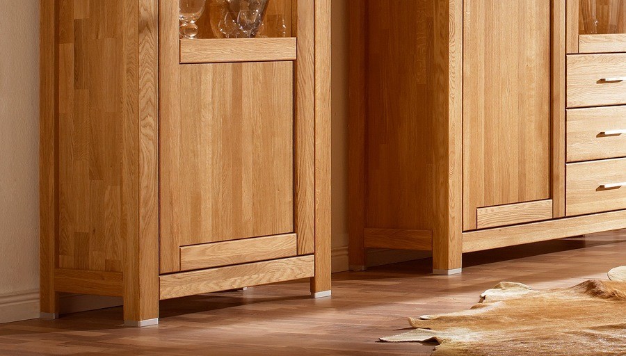 Die Vitrine ist aus 100% massivem Eichenholz gefertigt, das mit einem speziellen Öl einer deutschen Marke behandelt wurde. Dieses soll dem Holz höhere Widerstandskraft gegen mechanische Beschädigungen verleihen und die natürliche Maserung des Massivs betonen. Die Möbel werden weder gebeizt noch gebleicht. In der Variante Eiche geölt wirkt die Vitrine rein natürlich.