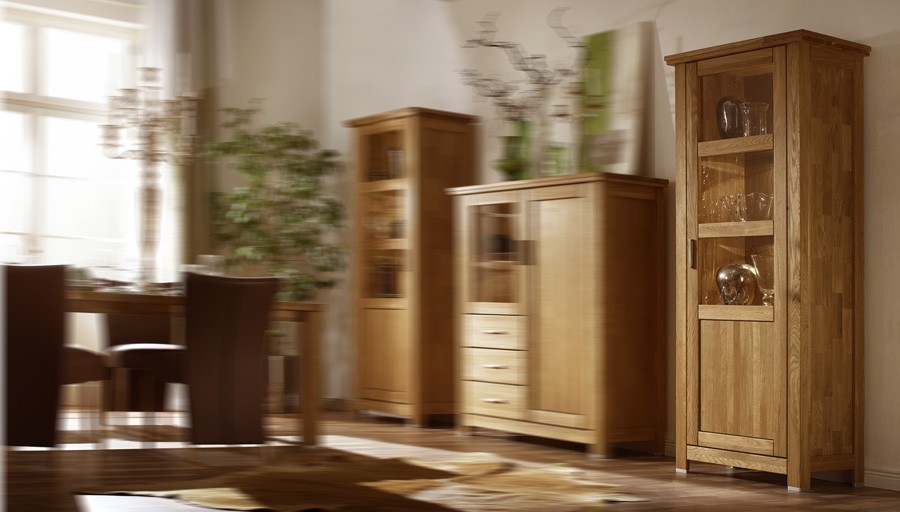Vitrine aus massivem Eichenholz wirkt in Ihrem Interieur wie ein Möbeltresor, egal ob Sie sie alleine platzieren oder mit weiteren Eichenmöbeln aus unserem Angebot kombinieren. Sie passt beispielsweise sehr gut zu einer massiven Eichen-Kommode oder einem großen Sekretär.