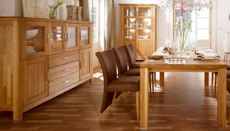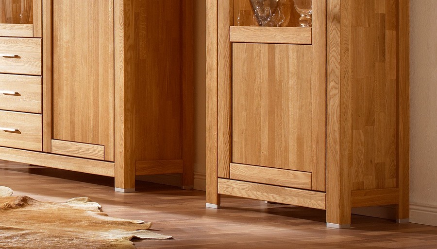 Das Eichenmassiv ist mit einem speziellen Öl einer deutschen Marke behandelt. Das Öl dient einerseits dazu, das Massivholz zu schützen und andererseits die natürliche Maserung des Holzes hervorzuheben. Die Möbel werden nicht zusätzlich gebeizt oder gebleicht. Die Variante Eiche geölt vermittelt einen rein natürlichen und ökologischen Eindruck.