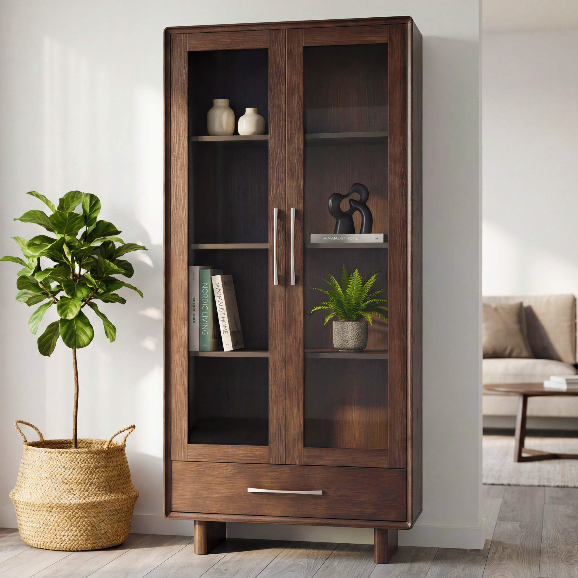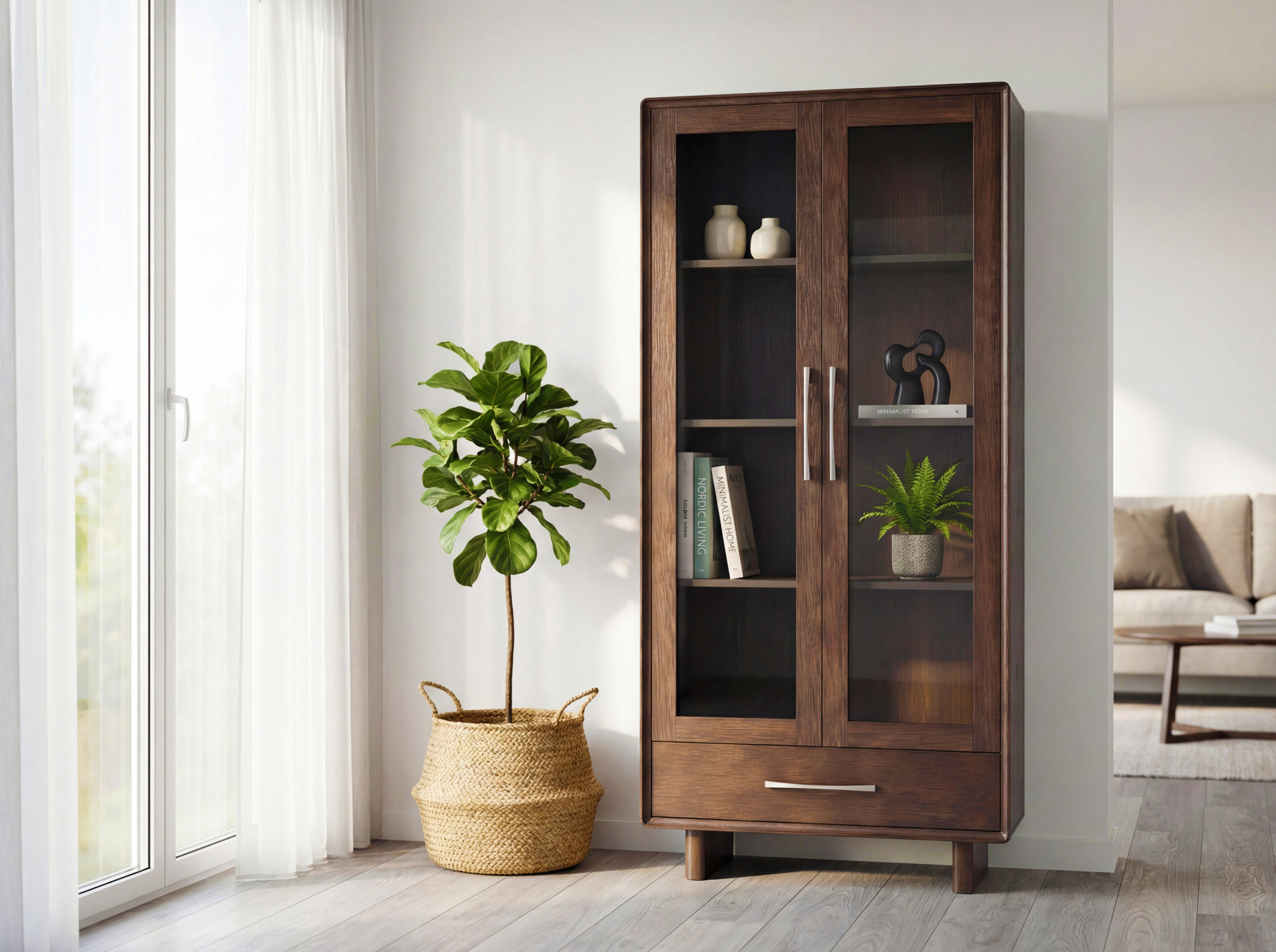 Wir präsentieren Ihnen die Design-Vitrine Koper, die elegante Präsentation Ihrer Lieblingsstücke mit praktischem Stauraum verbindet. Diese stilvolle zweitürige Vitrine in warmer Nussbaumfarbe ist ideal zur Ausstellung von Glas, Porzellan, Büchern oder Dekorationen. Der obere Teil mit Glasfronttüren ermöglicht eine effektvolle Präsentation, während die untere Schublade diskreten Stauraum bietet. Das gesamte Möbelstück ist aus premium Eichenfurnier mit massiven Eichenkanten gefertigt, was außergewöhnliche Stabilität und lange Lebensdauer garantiert. Abgerundete Kanten verleihen der Vitrine einen modernen Charakter und erhöhen gleichzeitig die Sicherheit im Haushalt.
