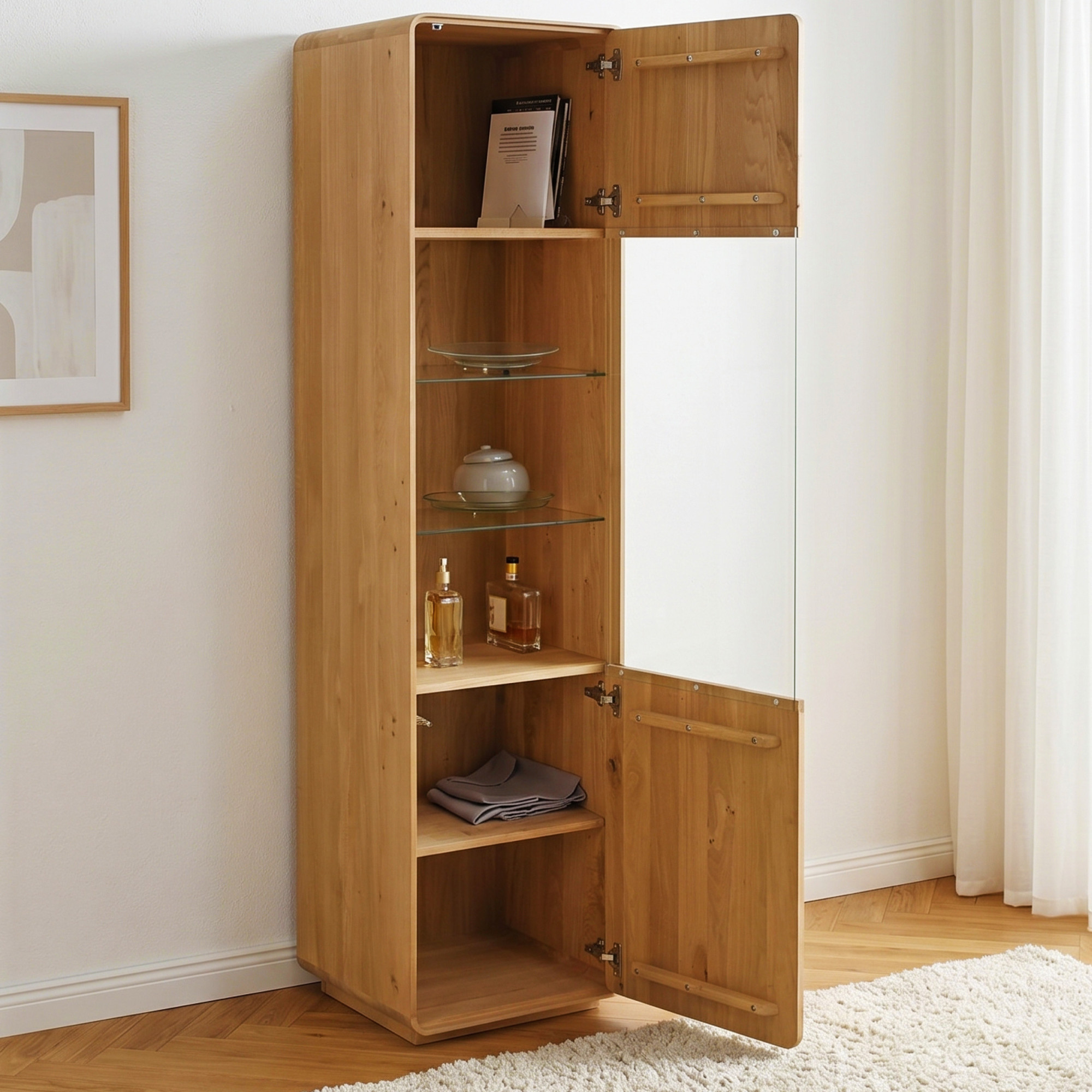 - Obere und untere geschlossene Türen aus massivem Eichenholz für diskreten Stauraum