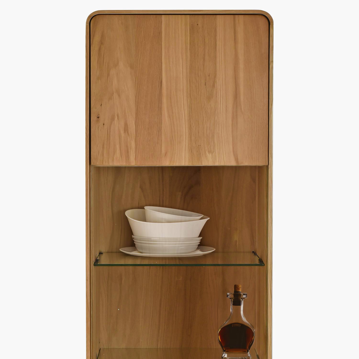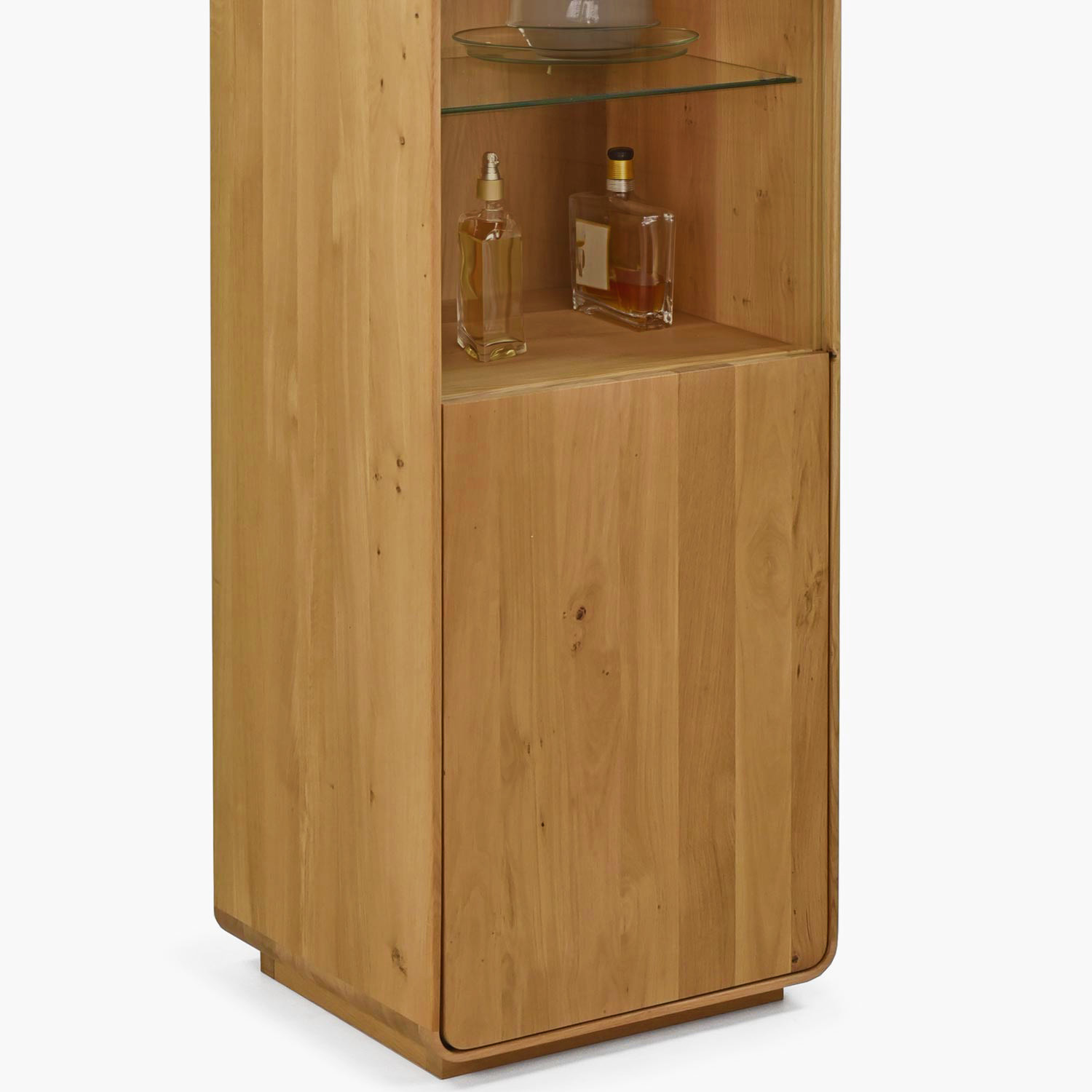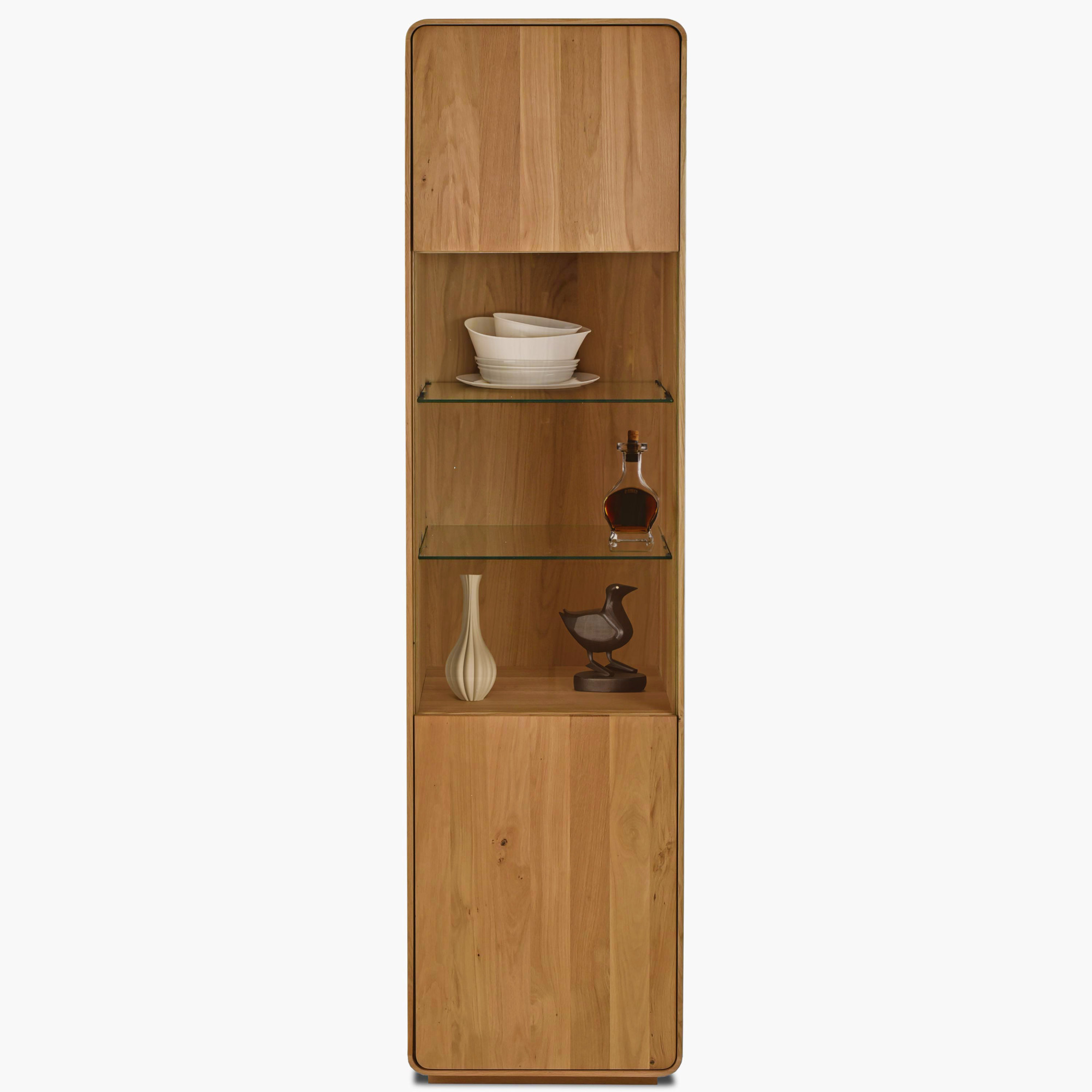Die Vitrine bietet eine wirklich vielseitige Aufbewahrungslösung. Der mittlere verglaste Bereich mit zwei Glasböden eignet sich ideal zur Präsentation Ihrer Lieblingssammlung, Porzellan, Glas oder Dekorationsgegenständen – durch das transparente Glas erhalten Ihre wertvollsten Sachen die verdiente Aufmerksamkeit. Die oberen und unteren geschlossenen Türen aus massivem Eichenholz verbergen dagegen diskret praktische Dinge, die Sie nicht sichtbar haben möchten. Alle Türen sind mit einem Soft-Close-System ausgestattet, welches ein leises und sanftes Schließen gewährleistet. Die Oberfläche ist mit naturbelassenem Öl behandelt, das die einzigartige Maserung des massiven Eichenholzes hervorhebt und gleichzeitig einen zuverlässigen Schutz gegen den täglichen Gebrauch bietet. Die geölte Oberfläche lässt das Holz atmen und kann bei Bedarf leicht renoviert werden. Die Vitrine wird schon komplett montiert geliefert und ist sofort einsatzbereit. Sie lässt sich hervorragend mit weiteren Stücken aus der Avalon Kollektion kombinieren und schafft so ein harmonisches Gesamtbild.