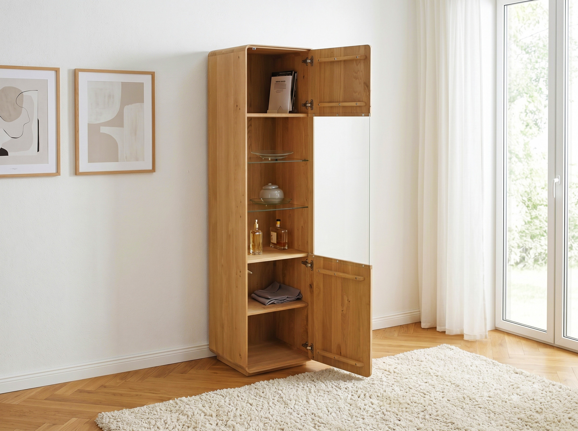 - Verglaster mittlerer Bereich mit 2 Glasböden zur Präsentation von Sammlungen und Dekorationen