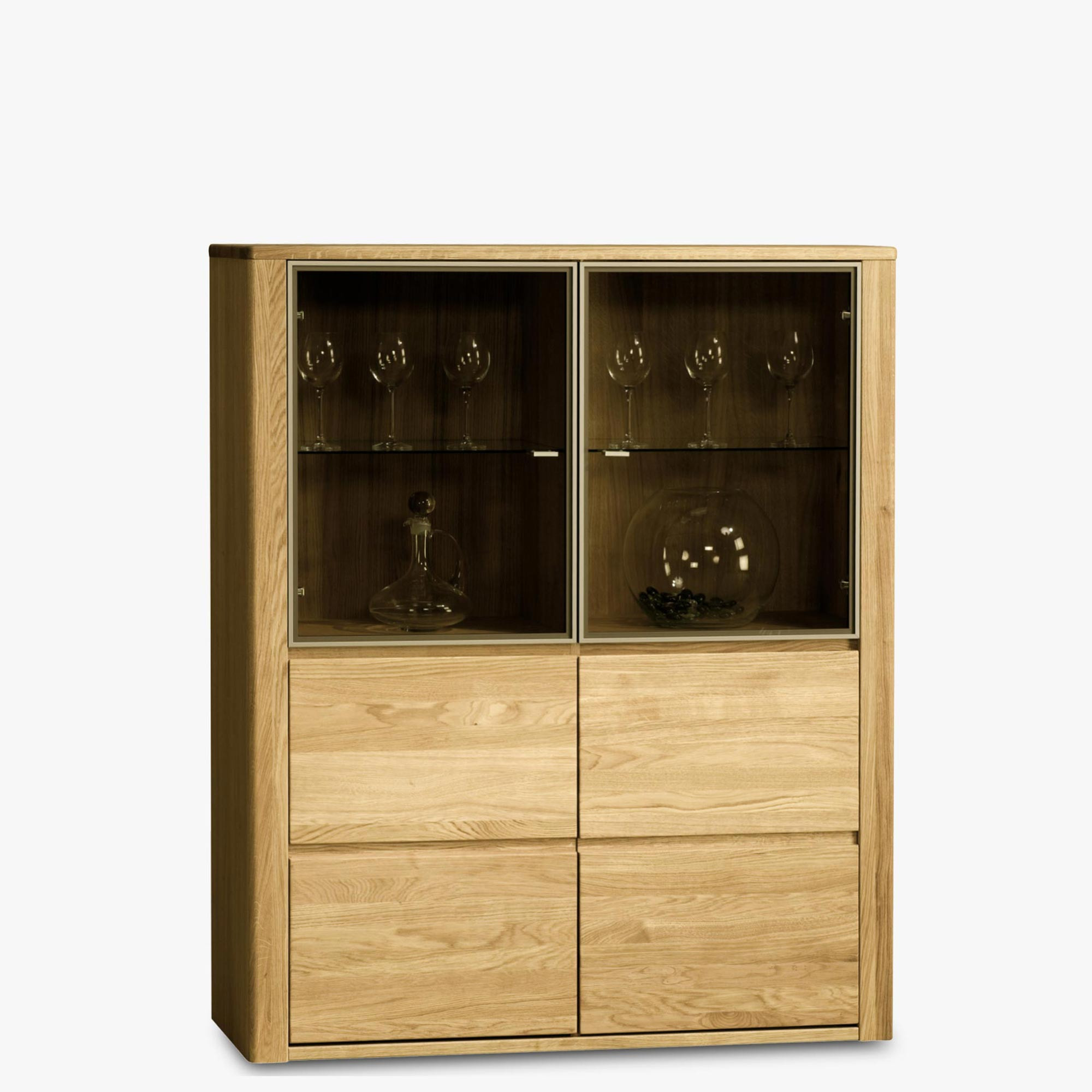 Luxuriöse Vitrine aus massiver Eiche in Kombination mit Eichenfurnier, die Sie mit ihrer präzise ausgearbeiteten und modernen Gestaltung verzaubert, die außerdem mit dem Diamanten des Möbelhandwerks 2013 ausgezeichnet wurde. Die Vitrine ist zur Hälfte mit Glastüren und zur anderen Hälfte mit Holztüren unterteilt.