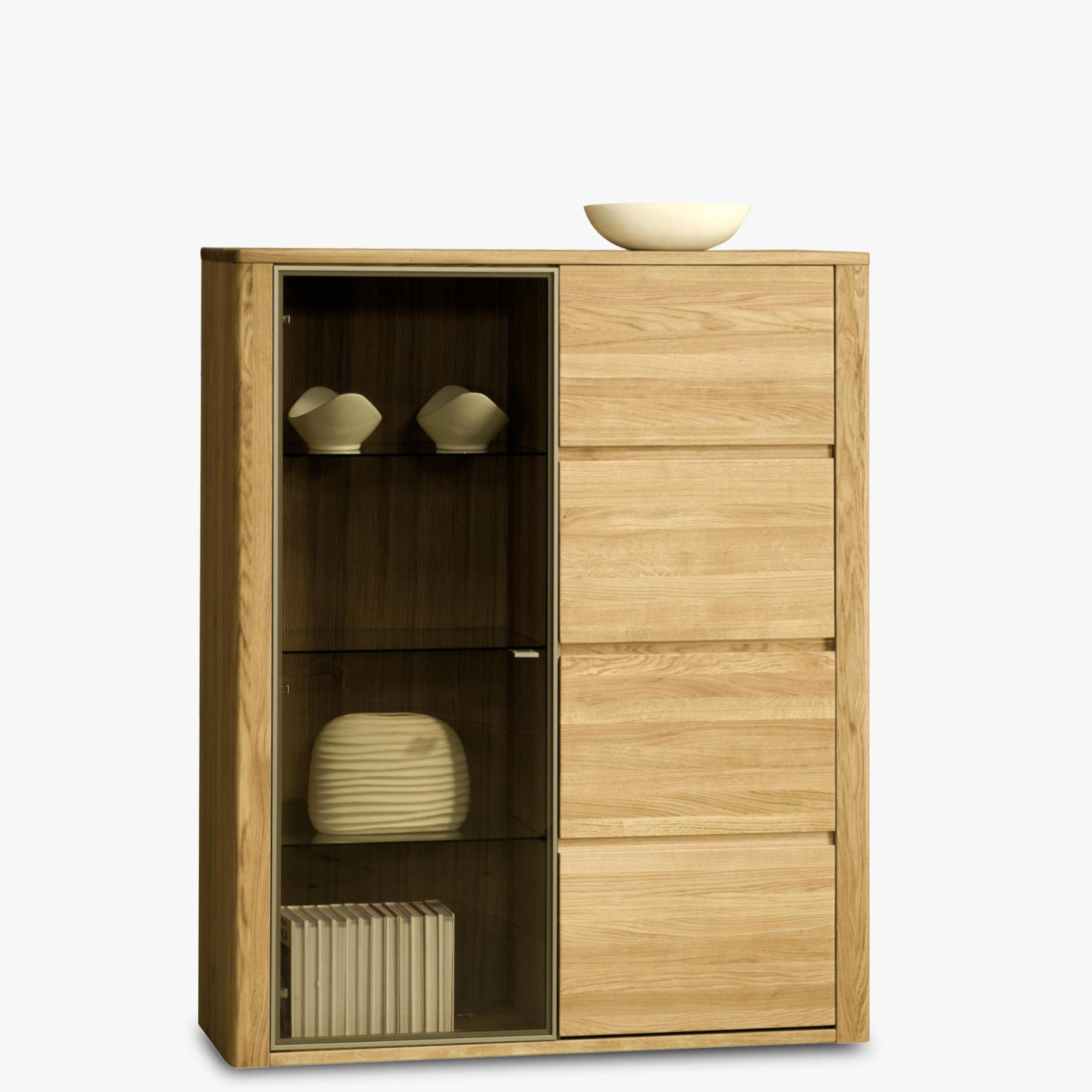 Moderne Vitrine aus massivem Eichenholz aus der Kollektion NICE, Eichenmöbel, die Vitrine ist in drei Teile unterteilt, die linke Seite hat Glastüren mit drei Glasschränken,