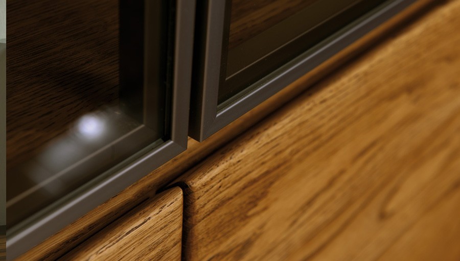 Der Innenraum der Vitrine ist geschickt in mehrere Sektionen unterteilt. Ein ¼ ist verglast und mit einem Glasboden ausgestattet, ideal zur Präsentation von Accessoires oder Souvenirs von Reisen. Unter den Glastüren befinden sich 3 Schubladen. Die gesamte rechte Seite der Vitrine besteht aus vollen Holztüren, hinter denen sich zwei innere Regalböden befinden. Alle Türen und Schubladen sind mit einem System der sanften Soft-Close-Selbstschließung ausgestattet. Das Öffnen der Volltüren und Schubladen erfolgt grifflose über eine 45° abgeschrägte obere Kante. Die Glastüren sind mit einem minimalistischen Griff versehen, der gut zum Gesamterscheinungsbild der Vitrine passt.