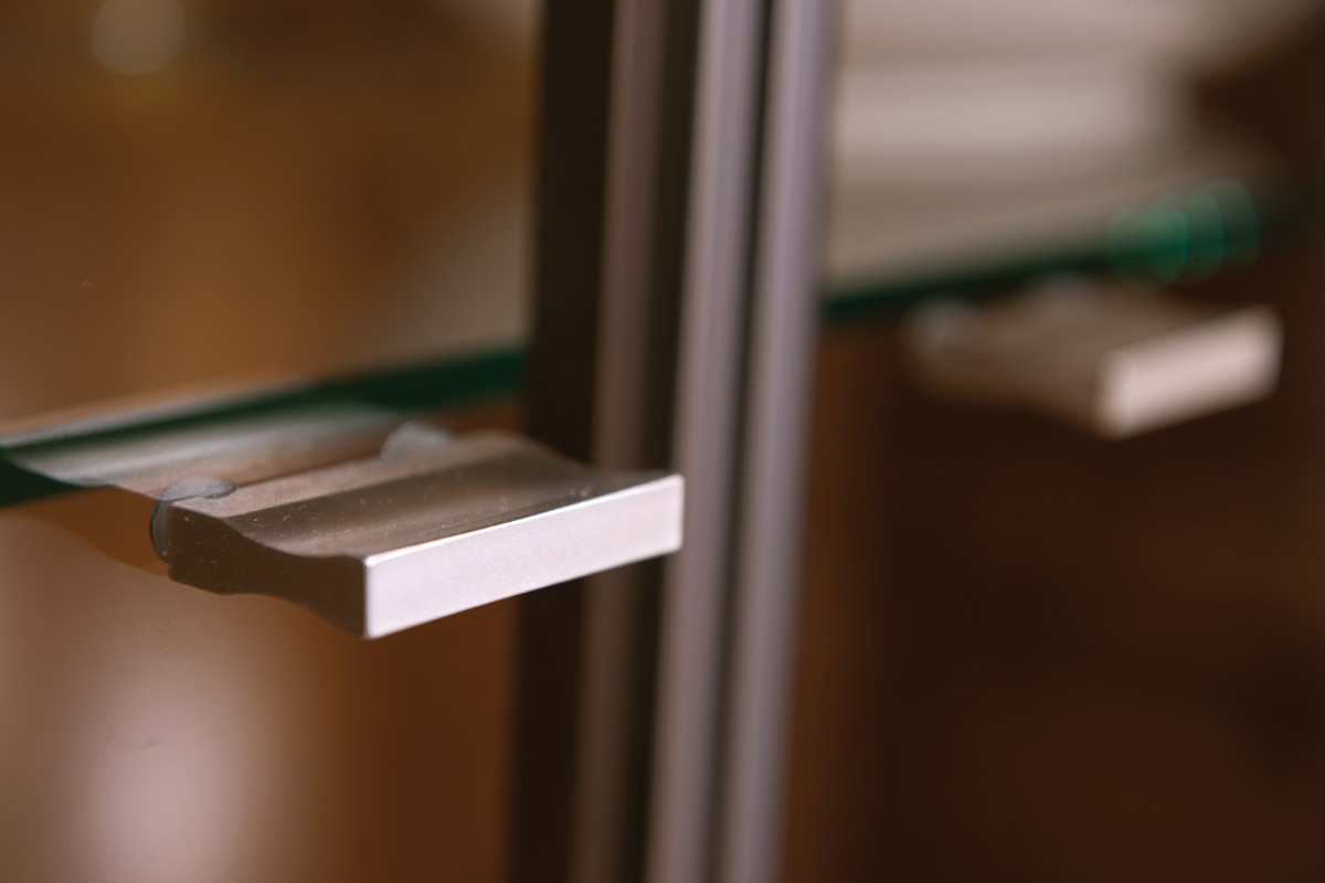 Die Vitrine ist zwei Meter hoch und ihr Inneres ist raffiniert unterteilt, so dass Sie wirklich viel Stauraum erhalten! Der obere Teil der Vitrine ist mit zwei Glasböden aus speziell gehärtetem Glas ausgestattet. Dieser Bereich ist mit verglasten Türen in einem eleganten Aluminiumrahmen und mit feinen Griffen versehen. Der untere Teil der Vitrine ist mit Holzböden ausgestattet und mit massiven Holztüren mit grifflosem Öffnungssystem versehen. Die einfache Öffnung wird durch die abgeschrägte obere Kante der Türen sichergestellt.