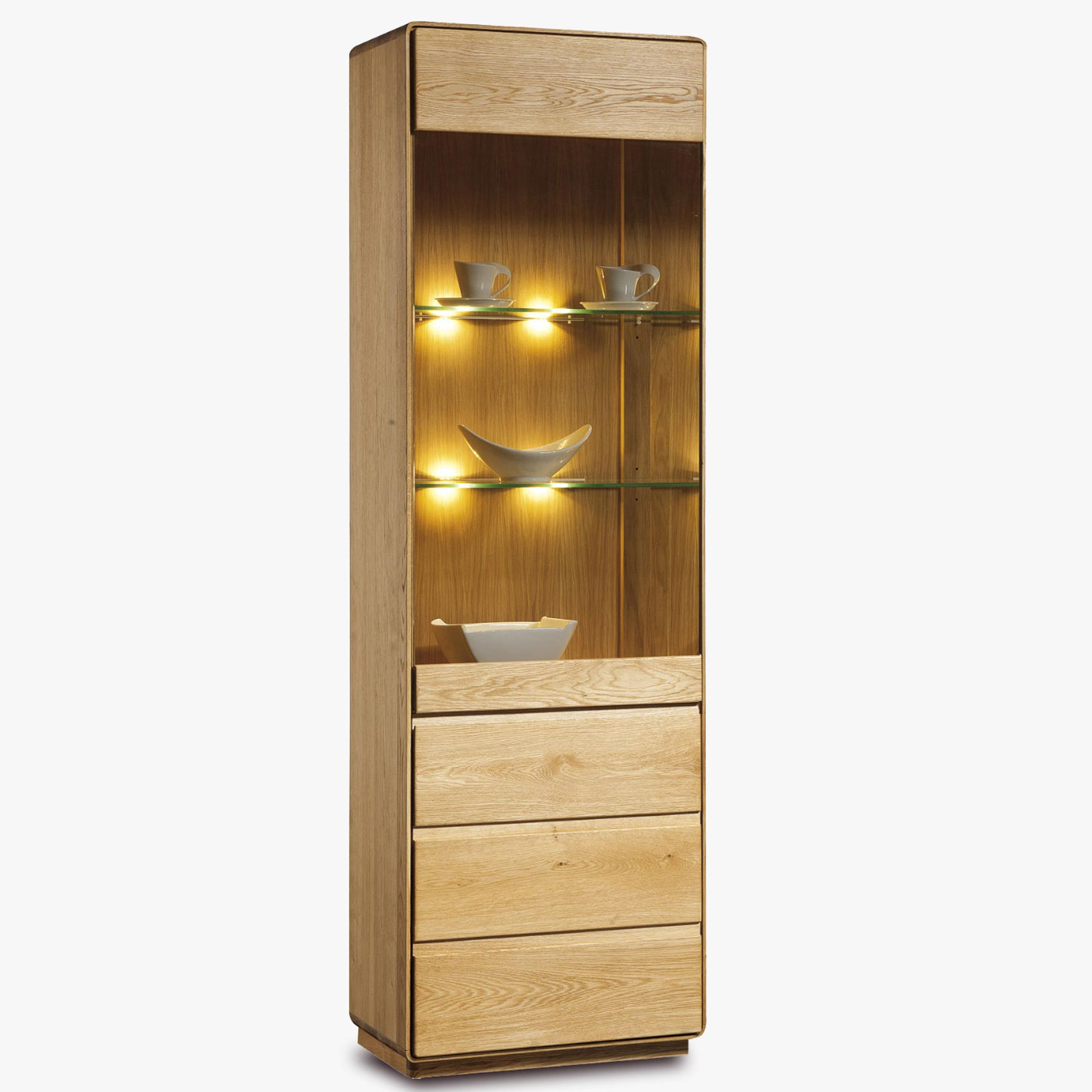 Einflügelige Vitrine Typ 10 aus Eiche natur, 2 Meter hoch, Wohnzimmermöbel
