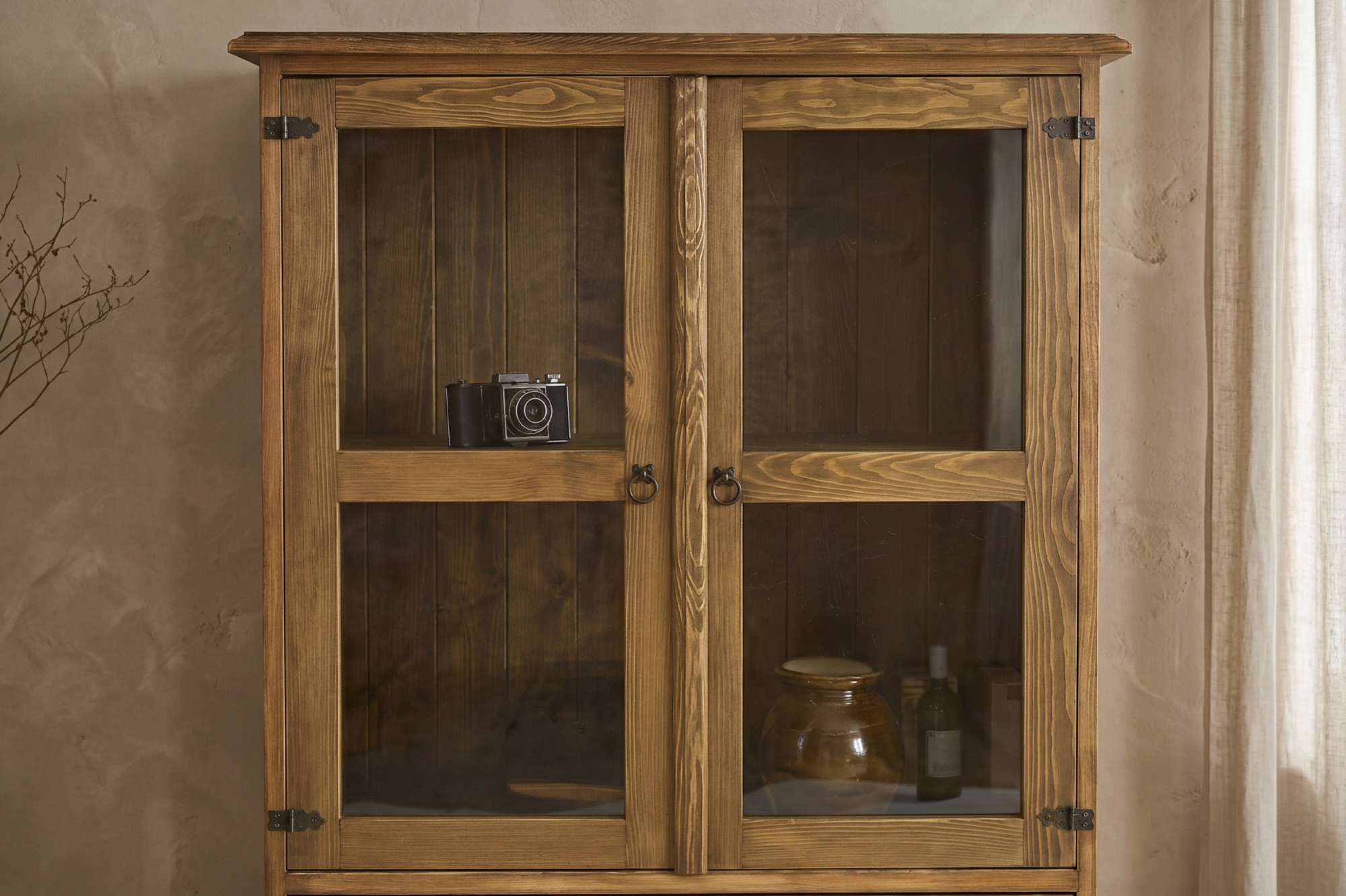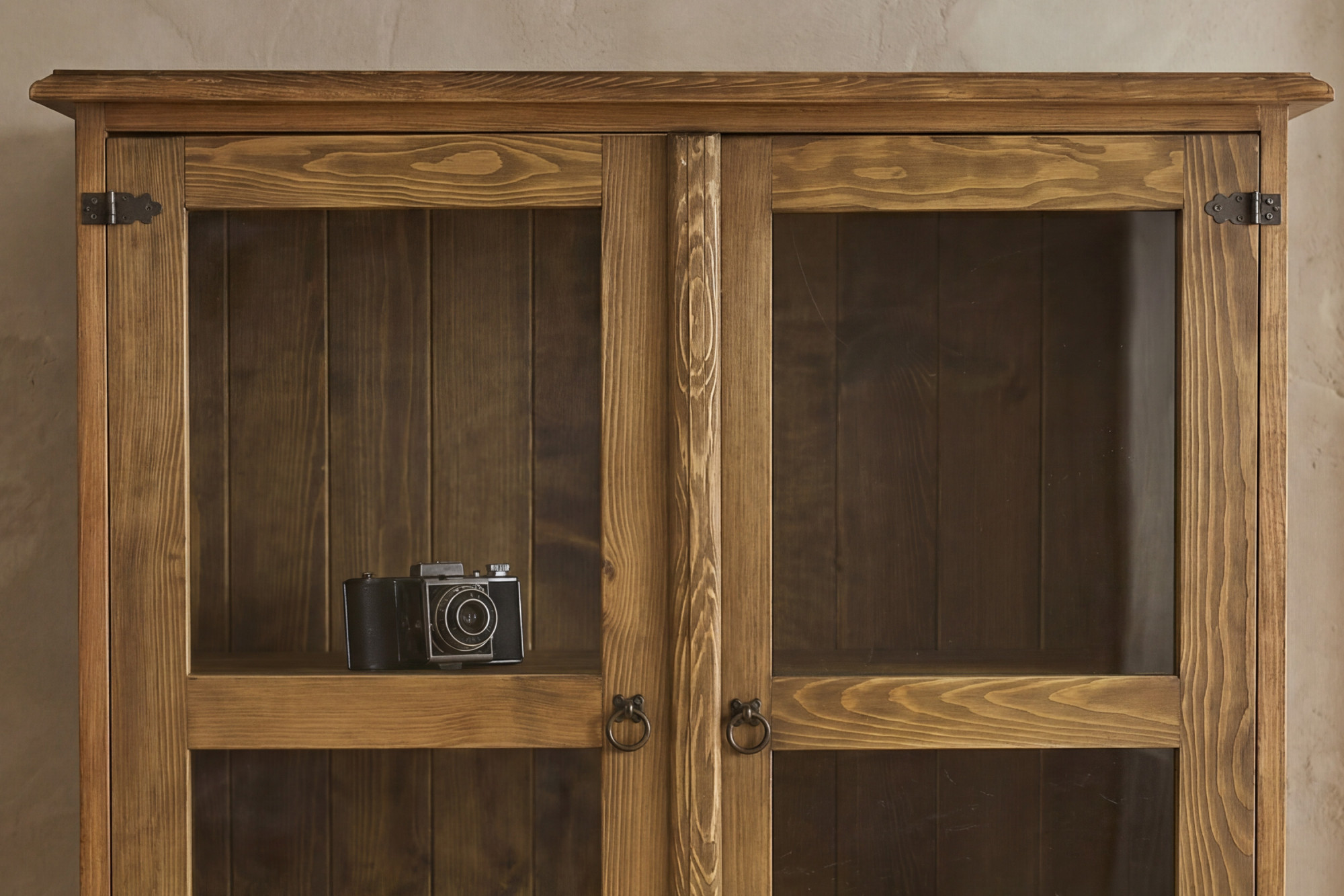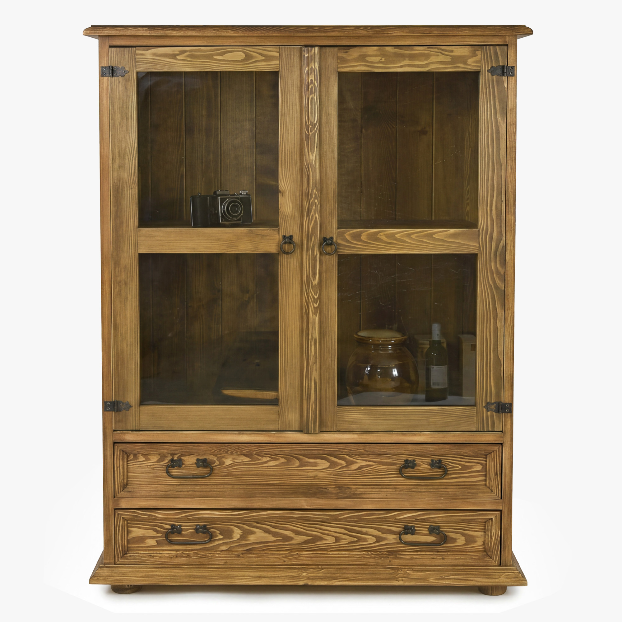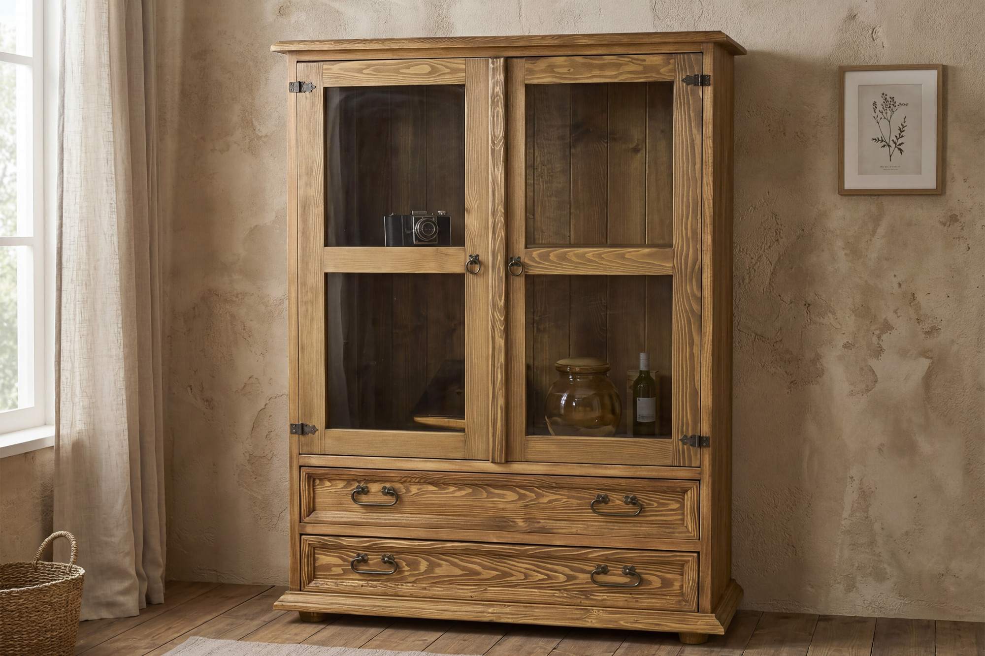 Die Vitrine ist aus hochwertigem massivem Kiefernholz gefertigt, das durch seine natürliche Maserung, Festigkeit und lange Lebensdauer besticht. Die Oberfläche ist mit Wachs behandelt, das den authentischen rustikalen Look unterstreicht und gleichzeitig das Holz im Alltag schützt. Im oberen Bereich befinden sich 2 verglaste Drehtüren mit innere Holzablage, sodass die Vitrine praktischen Raum für die Präsentation von Porzellan, Gläsern, Dekorationen oder Büchern bietet. Im unteren Teil sind 2 geräumige Schubladen eingebaut, die sich ideal zur Aufbewahrung von Kleinigkeiten, Tischdecken, Dokumenten oder weiteren Haushaltsgegenständen eignen.