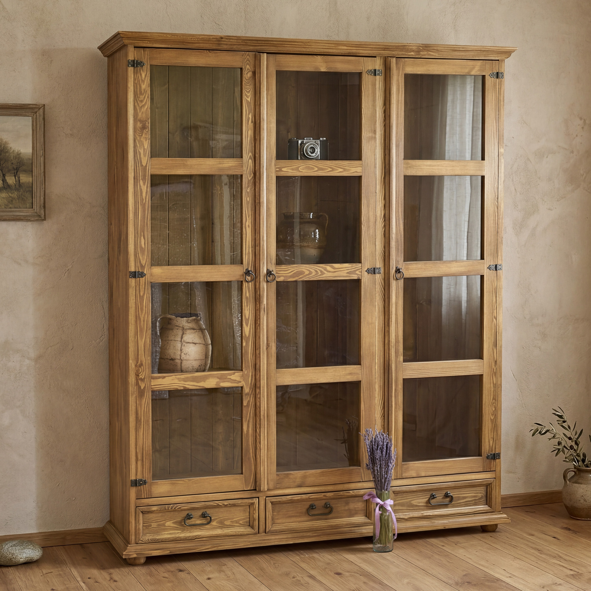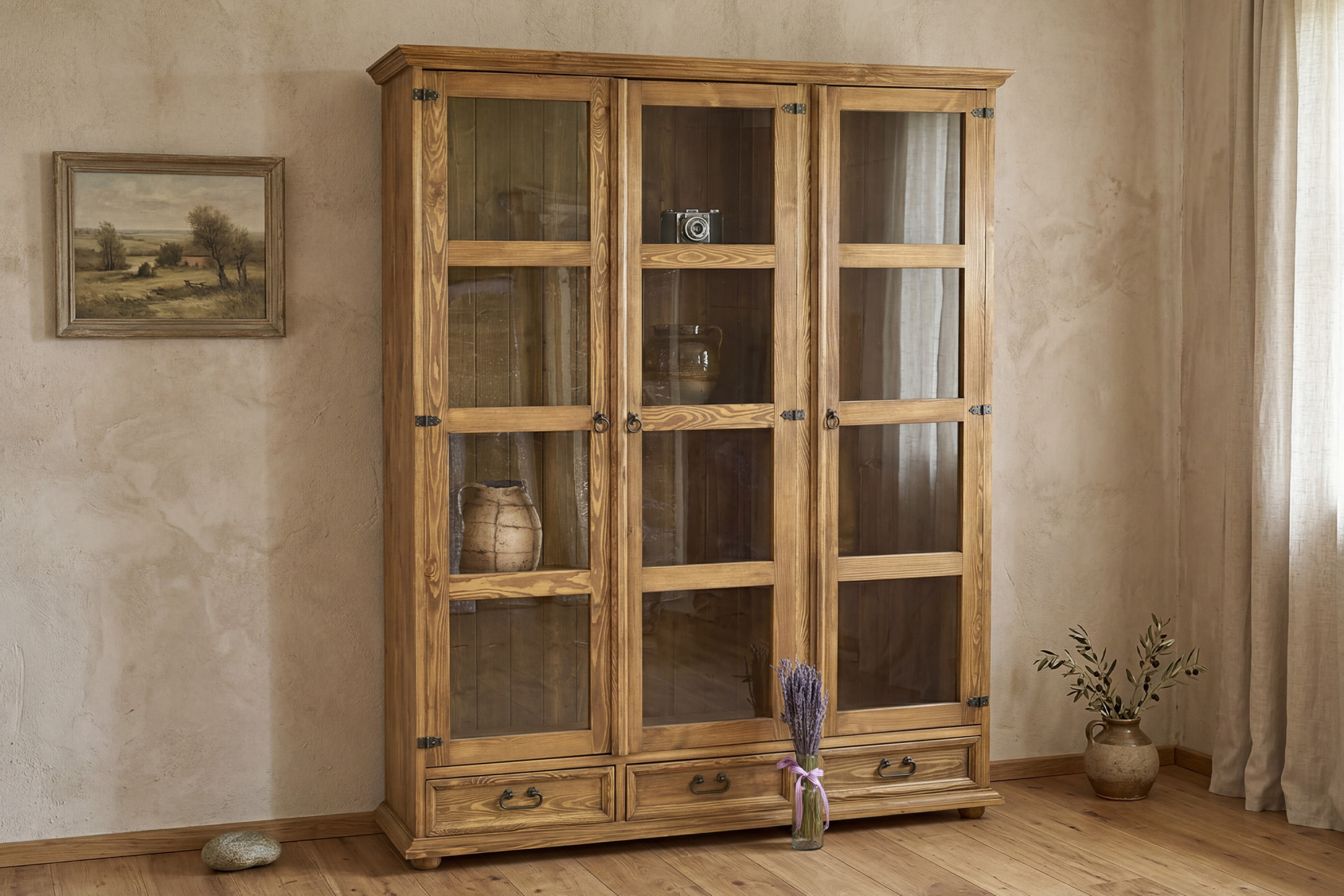 Suchen Sie eine große Vitrine im rustikalen Stil für das Esszimmer, die ausreichend Stauraum, ehrliche Handwerkskunst und ein zeitloses Design bietet? Diese rustikale Vitrine aus der Serie Venkov ist aus hochwertigem Kiefernholz gefertigt und besticht nicht nur durch ihre elegante Verarbeitung, sondern auch durch ihre praktische innere Aufteilung. Durch die Kombination aus verglastem Oberteil, Holzböden und unteren Schubladen eignet sie sich hervorragend für das Esszimmer, Wohnzimmer, Galerie sowie stilvoll eingerichtete Räume.