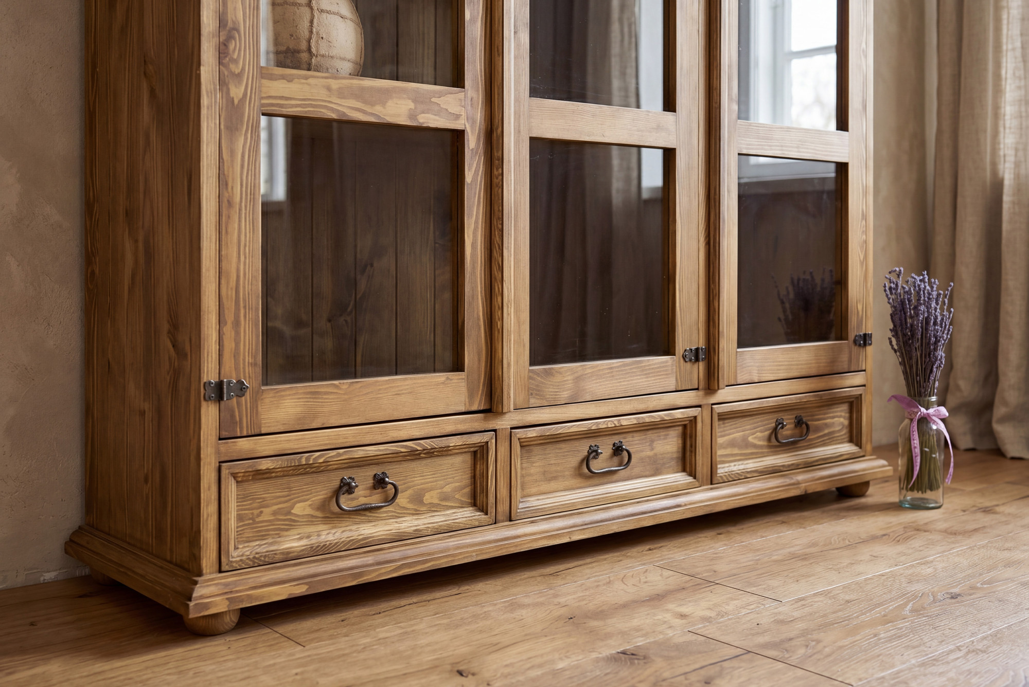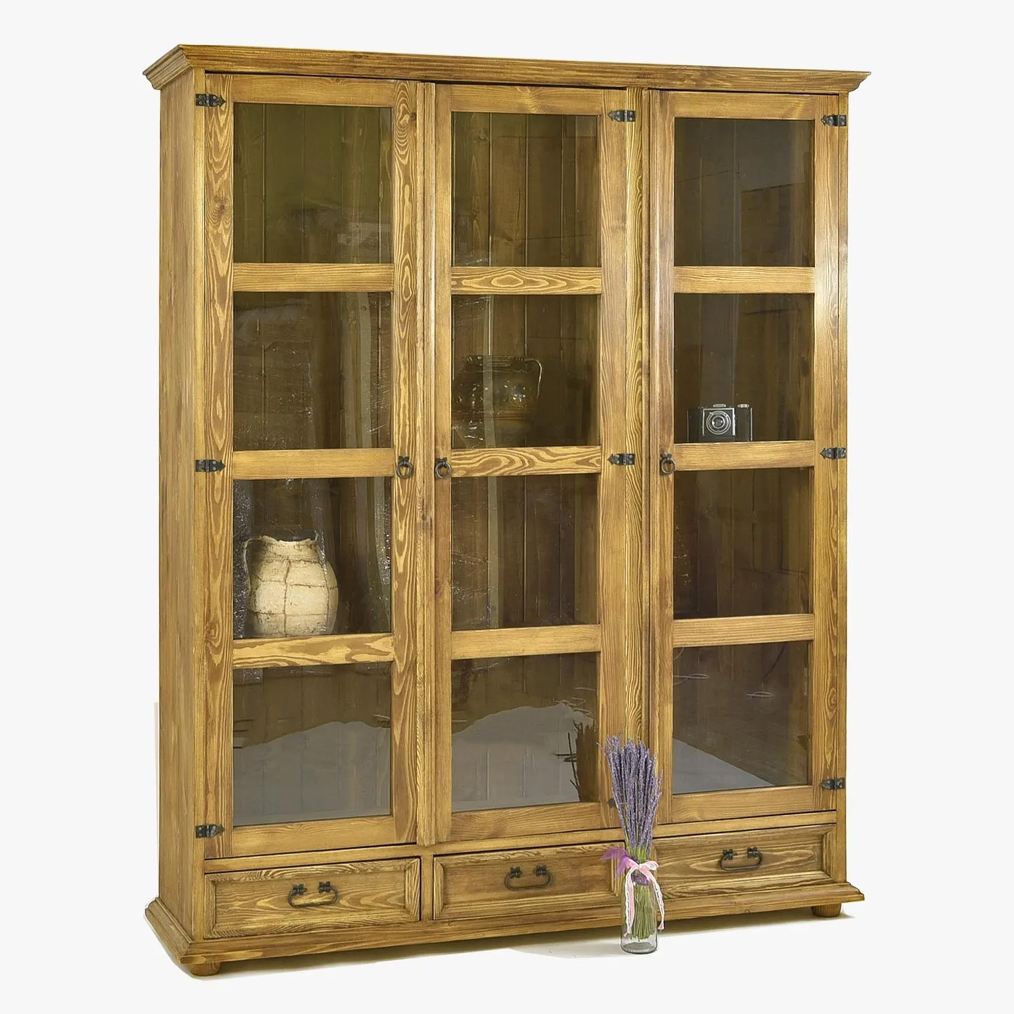 Diese dreitürige Massivholzvitrine wird bereits montiert geliefert, sodass Sie sich keine Sorgen um eine aufwendige Montage machen müssen. Im Inneren finden Sie 3 Holzböden, die ausreichend Platz bieten, um Porzellan, Glas, Dekorationen oder Sammlerstücke auszustellen. Im unteren Bereich befinden sich 3 voll funktionsfähige Schubladen, ideal zur Aufbewahrung von Kleinigkeiten, Tischdecken, Besteck oder weiteren Haushaltsutensilien. Die Oberfläche der Vitrine ist mit hochwertigem Supreme Max Wachs im Farbton Ruggeri Brown behandelt, bekannt auch als dunkel honigbraun, welches die natürliche Maserung der Kiefer hervorhebt und den authentischen rustikalen Charakter des Möbels unterstreicht.