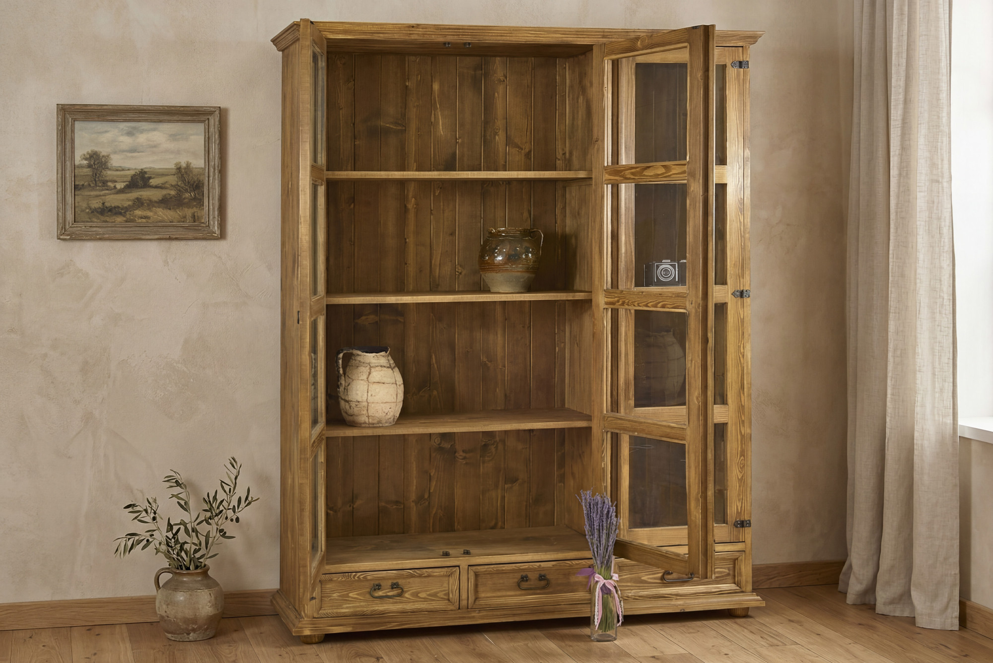 Große rustikale Vitrine für das Esszimmer ist die ideale Wahl für alle, die Ästhetik mit Funktionalität verbinden möchten. Der verglaste Teil ermöglicht es, Lieblingsgeschirr, Gläser oder Dekorationen elegant zu präsentieren, während die Schubladen ausreichend versteckten Stauraum bieten. Dank der robusten Massivholzkonstruktion und der gewachsten Oberfläche erhalten Sie ein Möbelstück, das Ihnen viele Jahre dienen wird und dabei seinen schönen Look bewahrt. Die Vitrine eignet sich nicht nur für Haushalte, sondern auch für repräsentative Räume, stilvolle Pensionen oder Galerien.