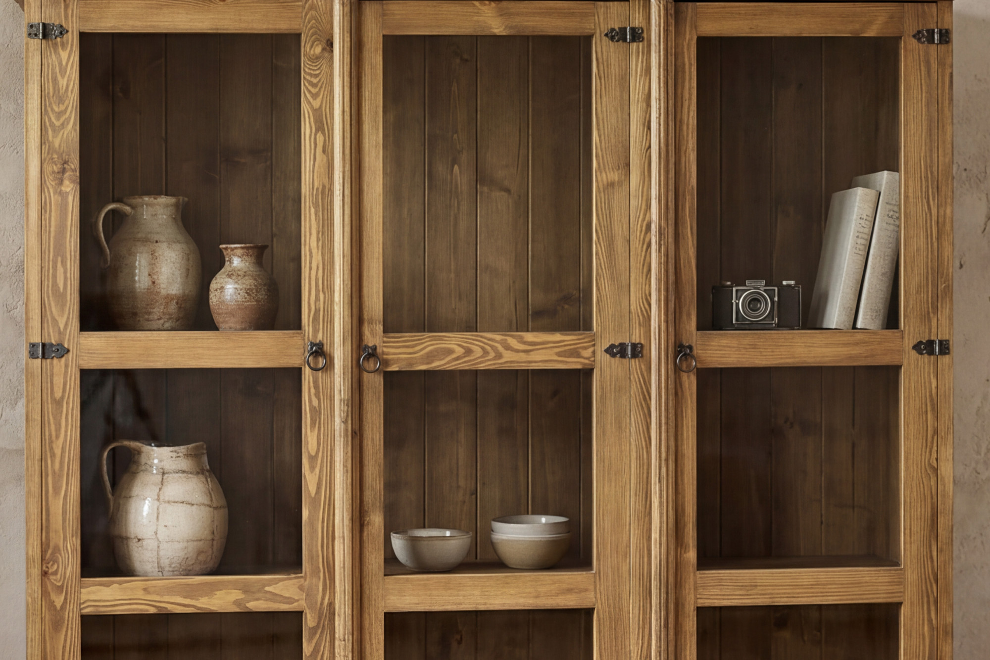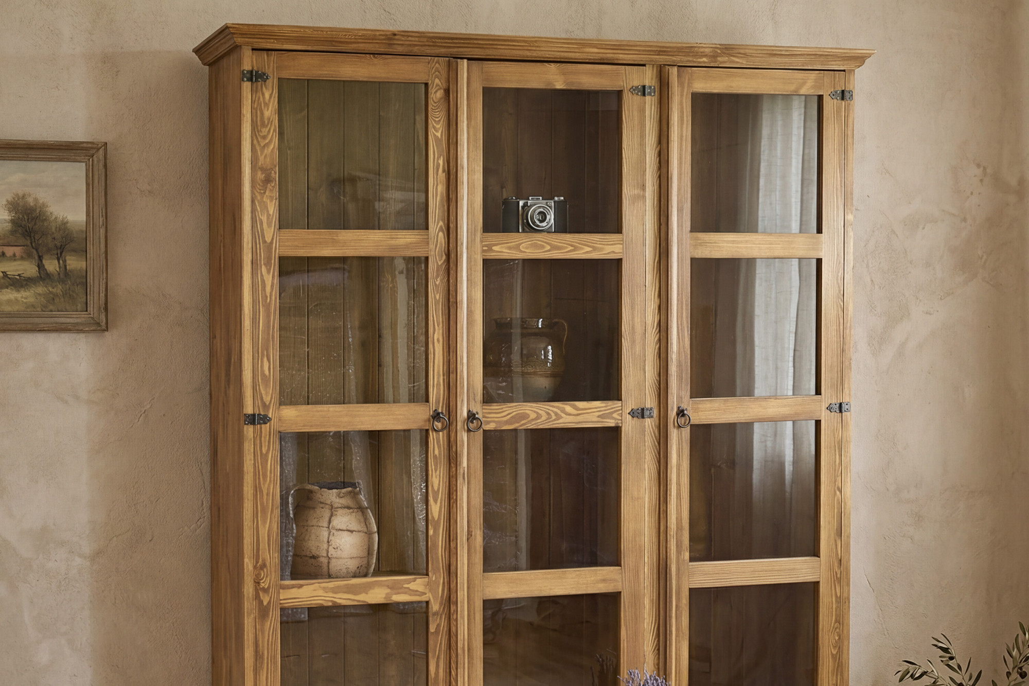 Die Vitrine ist aus hochwertigem massivem Kiefernholz gefertigt, das für seine Festigkeit, Beständigkeit und schöne natürliche Maserung beliebt ist.