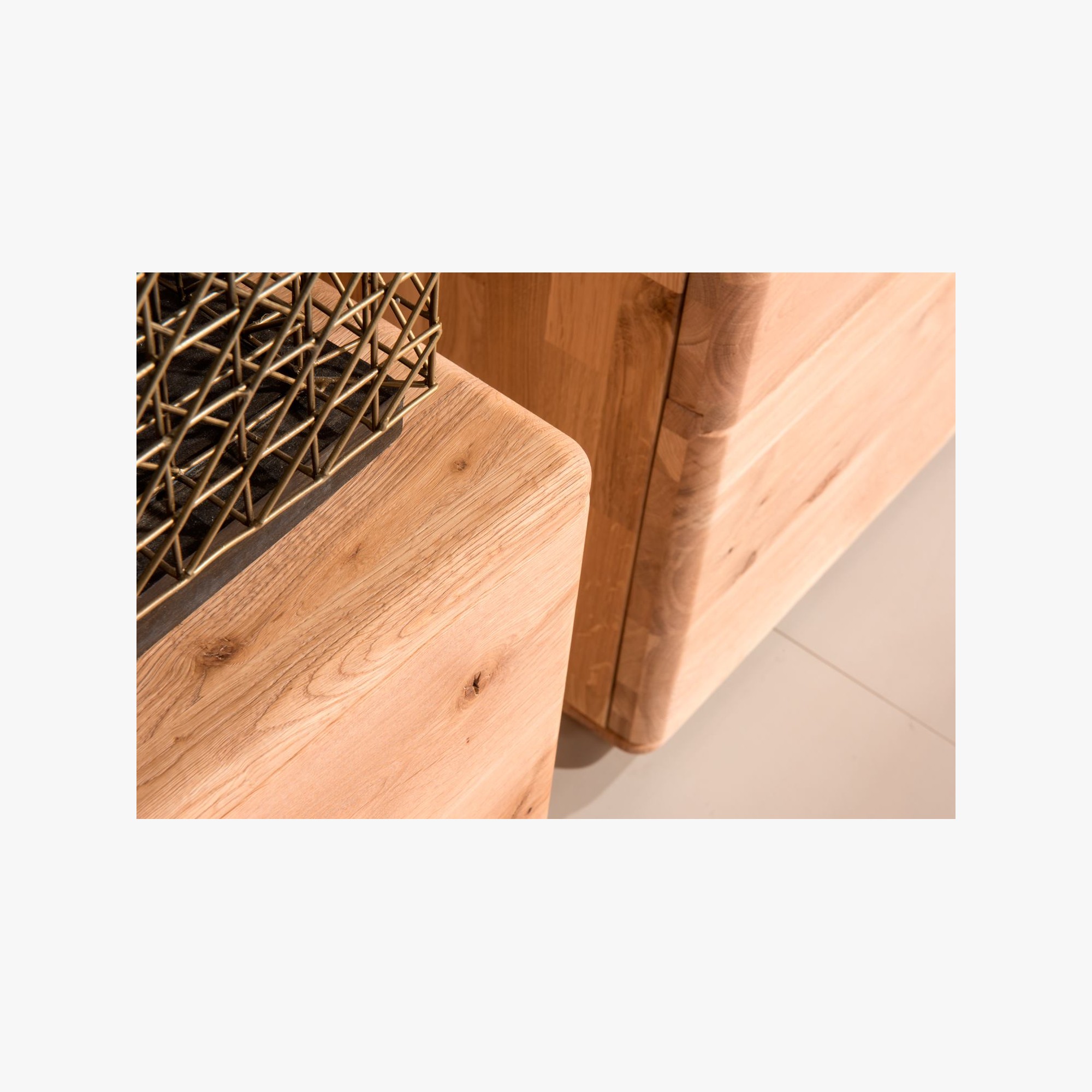 Die Möbel haben schön abgerundete Kanten und Ecken, was einen minimalistischen Eindruck schafft, gleichzeitig sind die Möbel aus echtem Holz gefertigt. Die Füße sind ebenfalls massiv und 15 cm hoch.