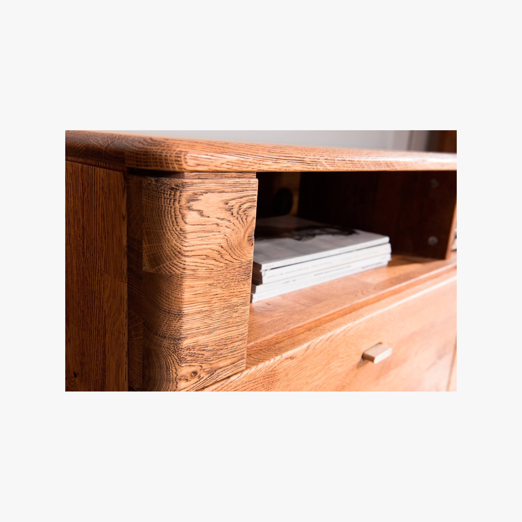 Die Wohnwand ist aus echtem massivem Eichenholz im Retro-Stil auf Füßen der Möbelserie Texas gefertigt. Das Set enthält eine TV-Kommode, eine Vitrine und eine niedrige Kommode. Das Set können Sie auch nach eigenem Ermessen zusammenstellen. Wunderschöne Möbel, die für Generationen bestimmt sind und mit der Zeit an einmaliger Schönheit gewinnen.
