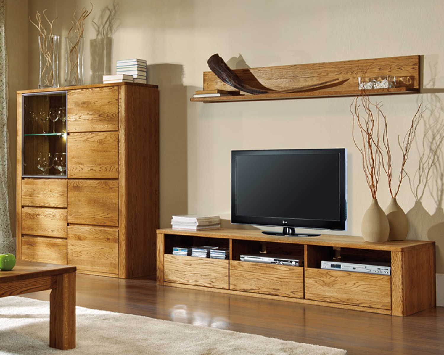 Moderne Wohnzimmerwand aus Eichenholz gefertigt. Die Möbel stammen aus der Möbelkollektion Nice. Die Wohnzimmerwand besteht aus drei Teilen, Sie können sie auch aus einzelnen Elementen zusammenstellen. Die Hauptvorteile sind hohe Qualität und präzise Verarbeitung jedes Möbelstücks.