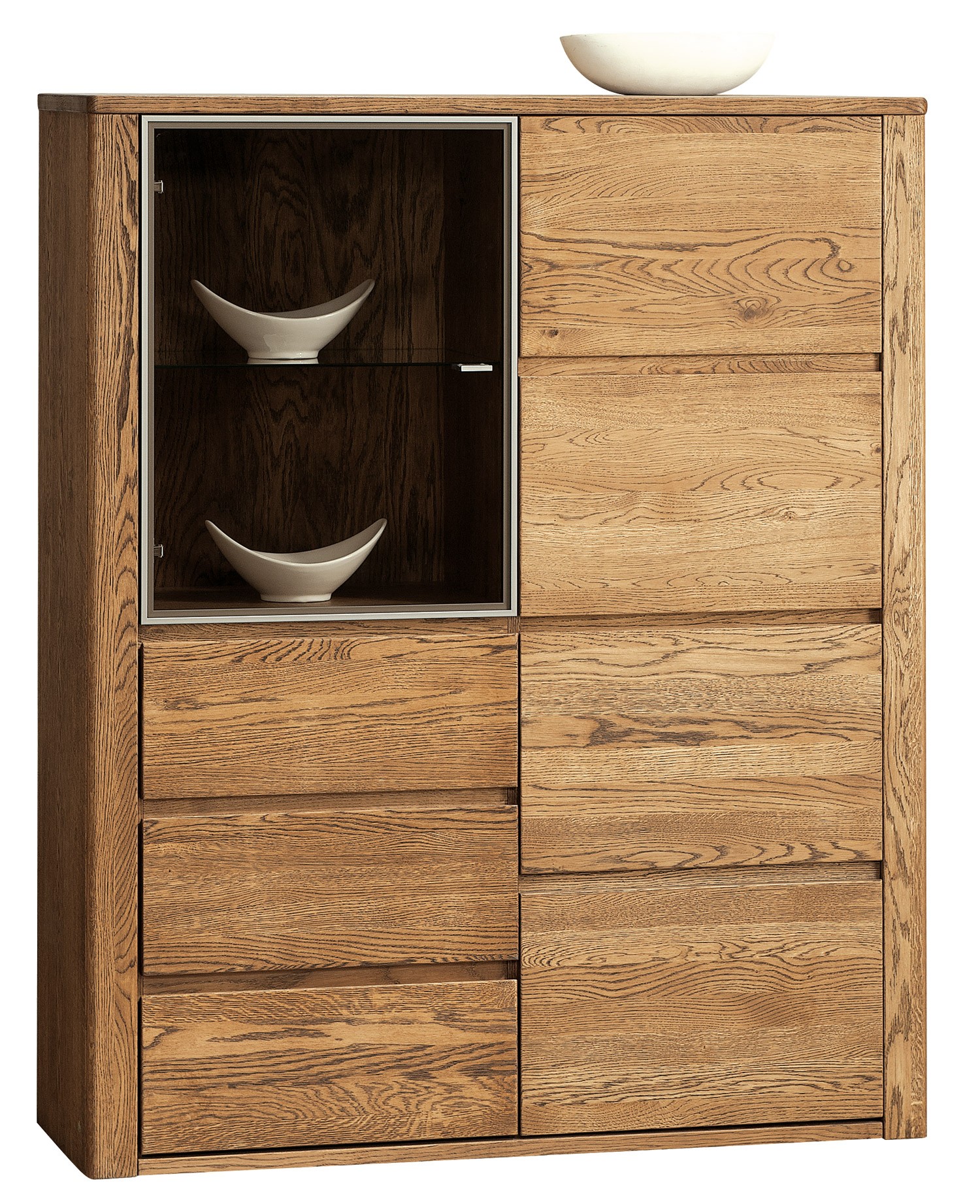 Die Vorderseite jedes Möbelstücks, einschließlich der oberen Platte, ist massive Eiche, die Seiten sind aus Holz-Eichenfurnier gefertigt. Somit ist es die ideale Verbindung zweier hochwertigster Materialien mit langer Lebensdauer und wunderschönem natürlichem Aussehen. Die Wohnwand können Sie in drei Farbvarianten auswählen.