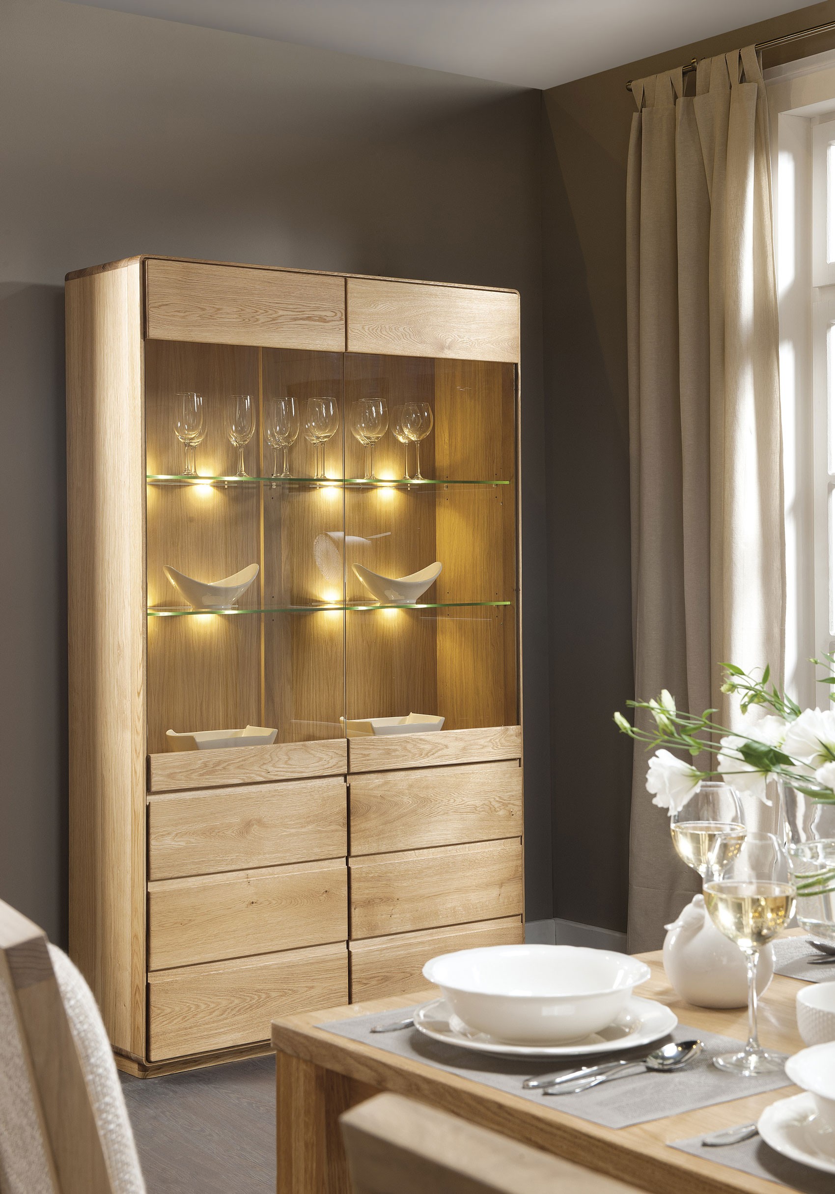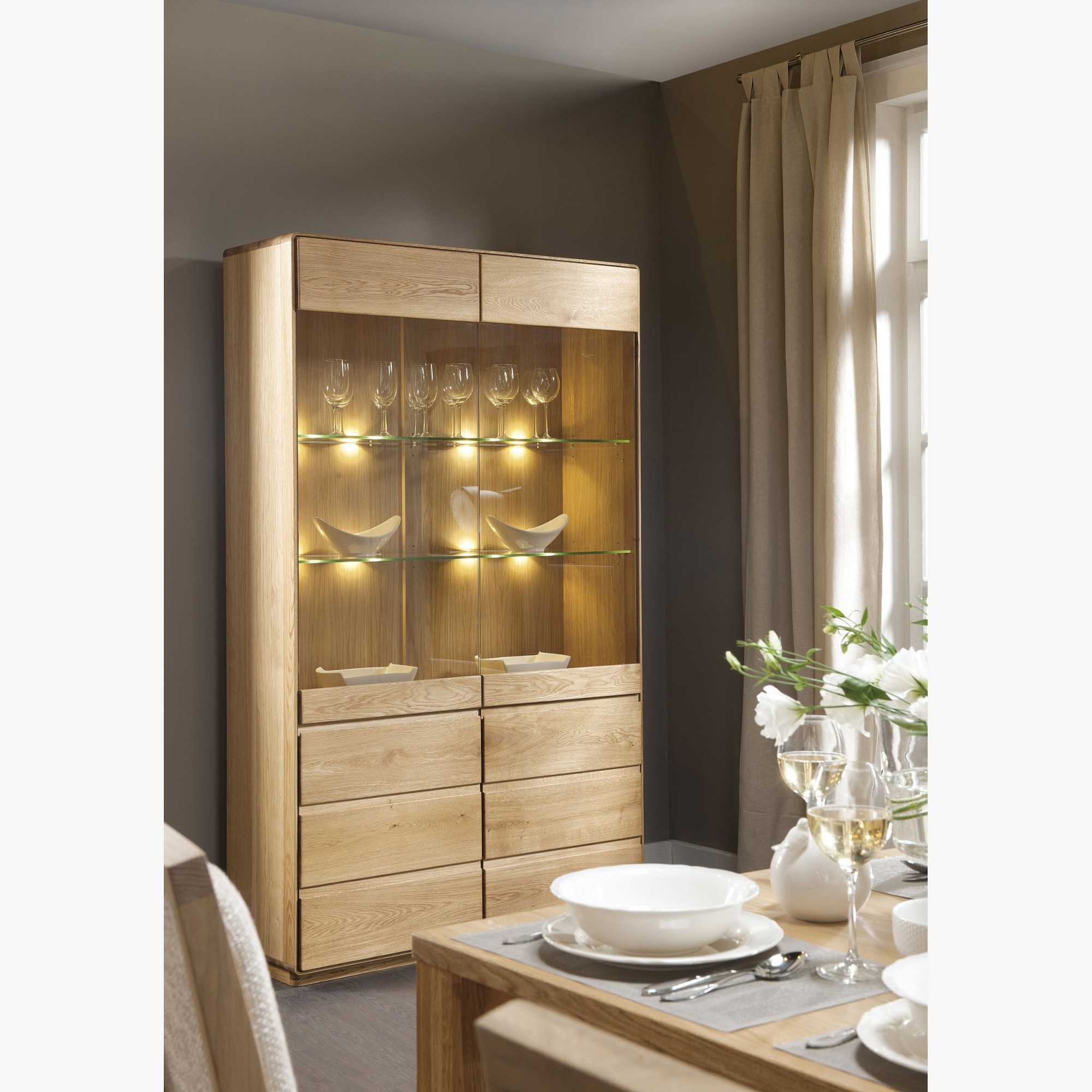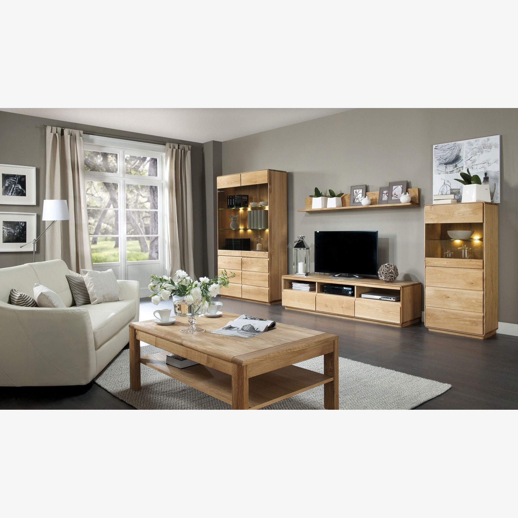 Bevorzugen Sie helle Möbel? Dann wählen Sie die Wohnwand in der Ausführung Eiche Öl! Sie hat einen natürlichen Charakter und eine ökologische Ausstrahlung. Sie hellt auch Räume mit wenig Tageslicht angenehm auf. Wenn Sie dunklere Möbel bevorzugen, entscheiden Sie sich für die Version gebrannte Eiche. Die natürliche Holzstruktur bleibt erhalten und der dunkle Farbton wirkt zusätzlich sehr elegant. Das Möbel wird ohne Beleuchtung geliefert, eine Nachbestellung gegen Aufpreis ist möglich.