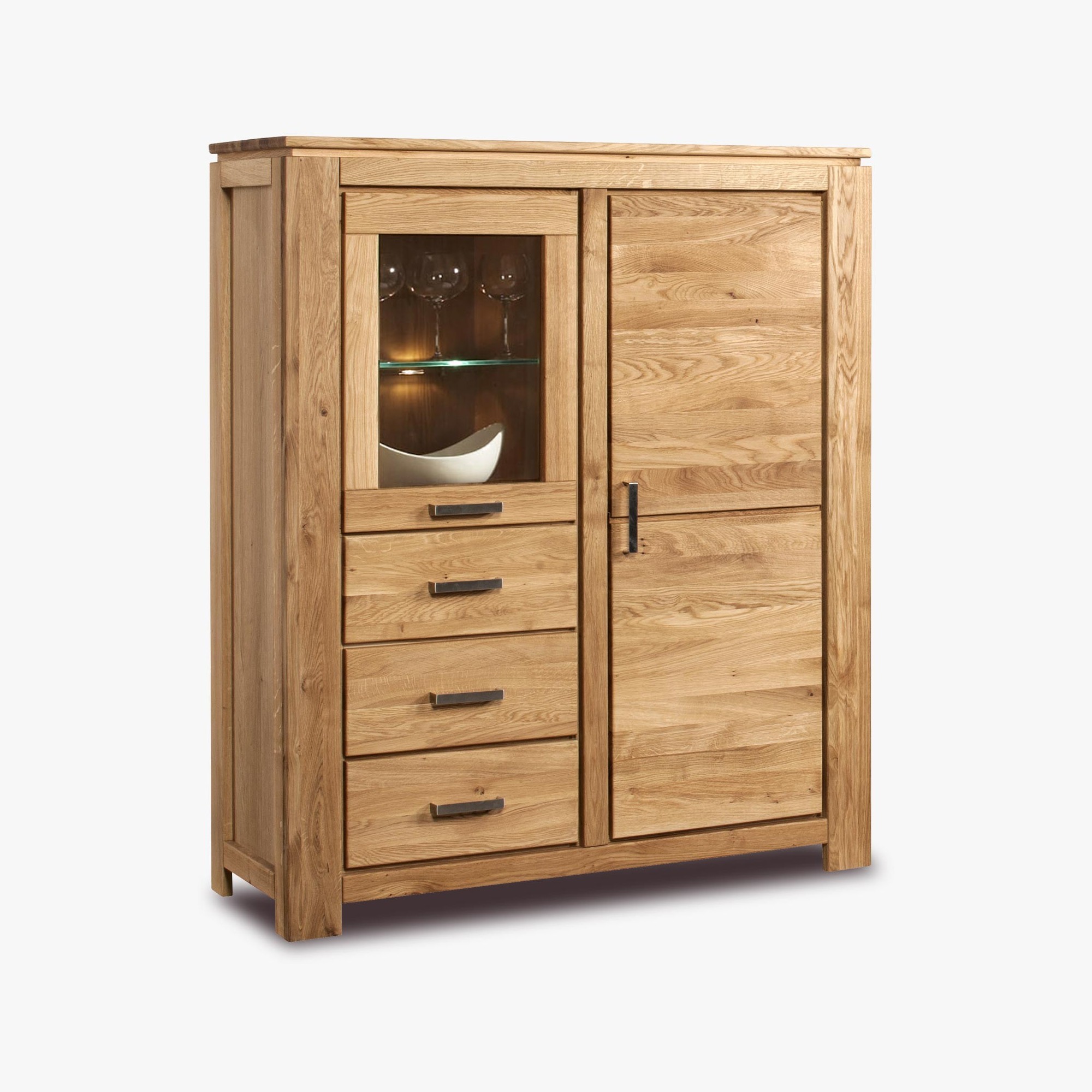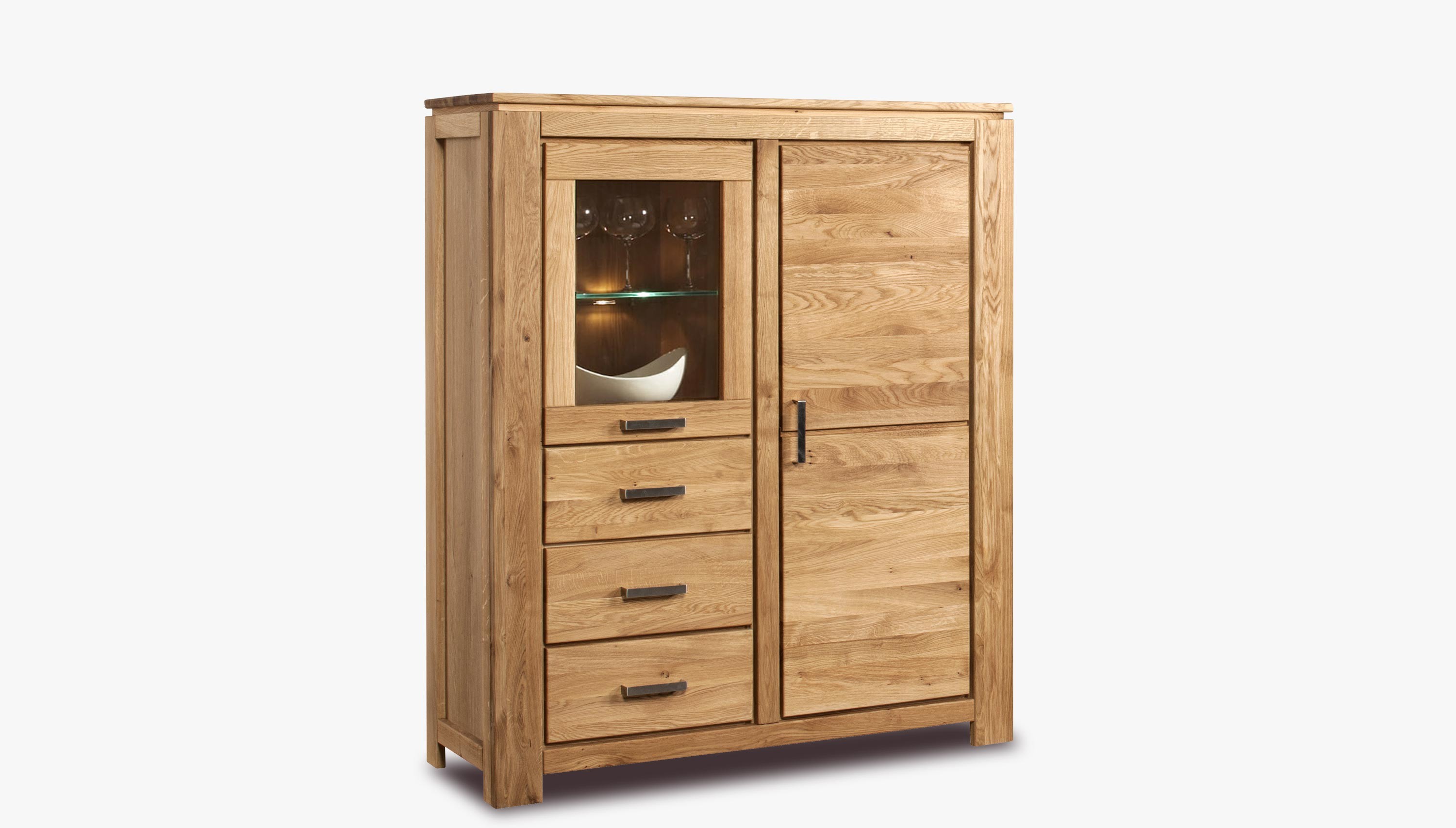 Sie können Ihre Wohnwand nach Ihren Vorstellungen zusammenstellen. Die Türen und Oberplatten sind aus massiver Eiche gefertigt, die Seiten und Regale aus hochwertiger Eichenfurnier. Hochwertige Metallgriffe, das Set ist inklusive eines leisen Selbstschließmechanismus für Schubladen und Türen.