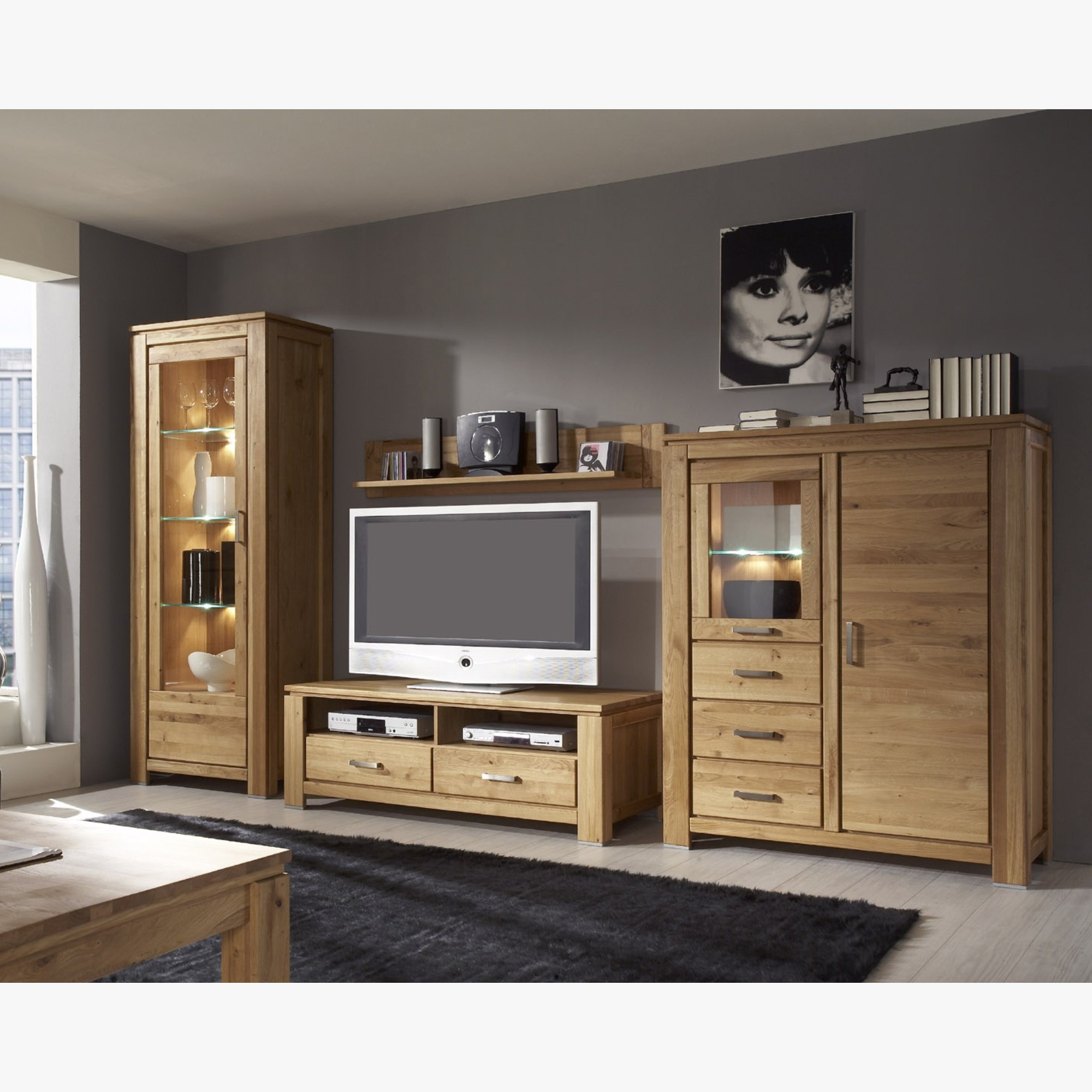 Wohnwand Set Eiche massiv und Furnier, 4-teilig, 343 cm