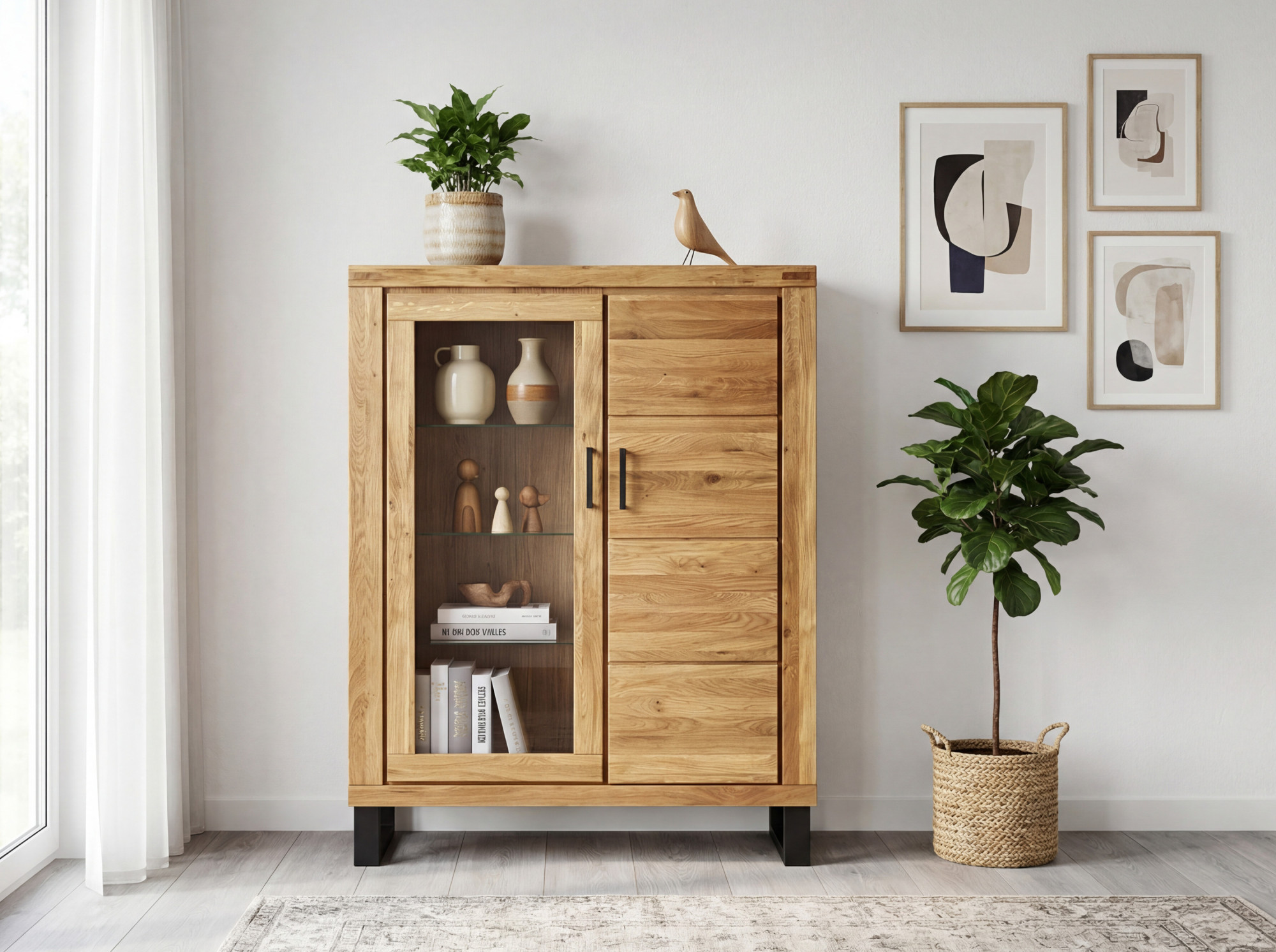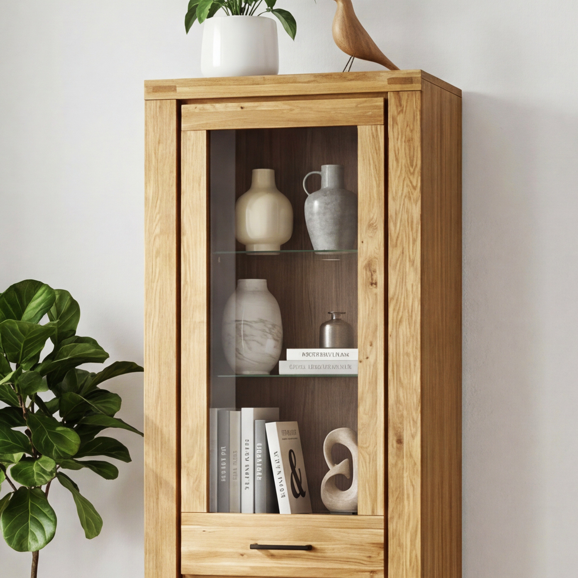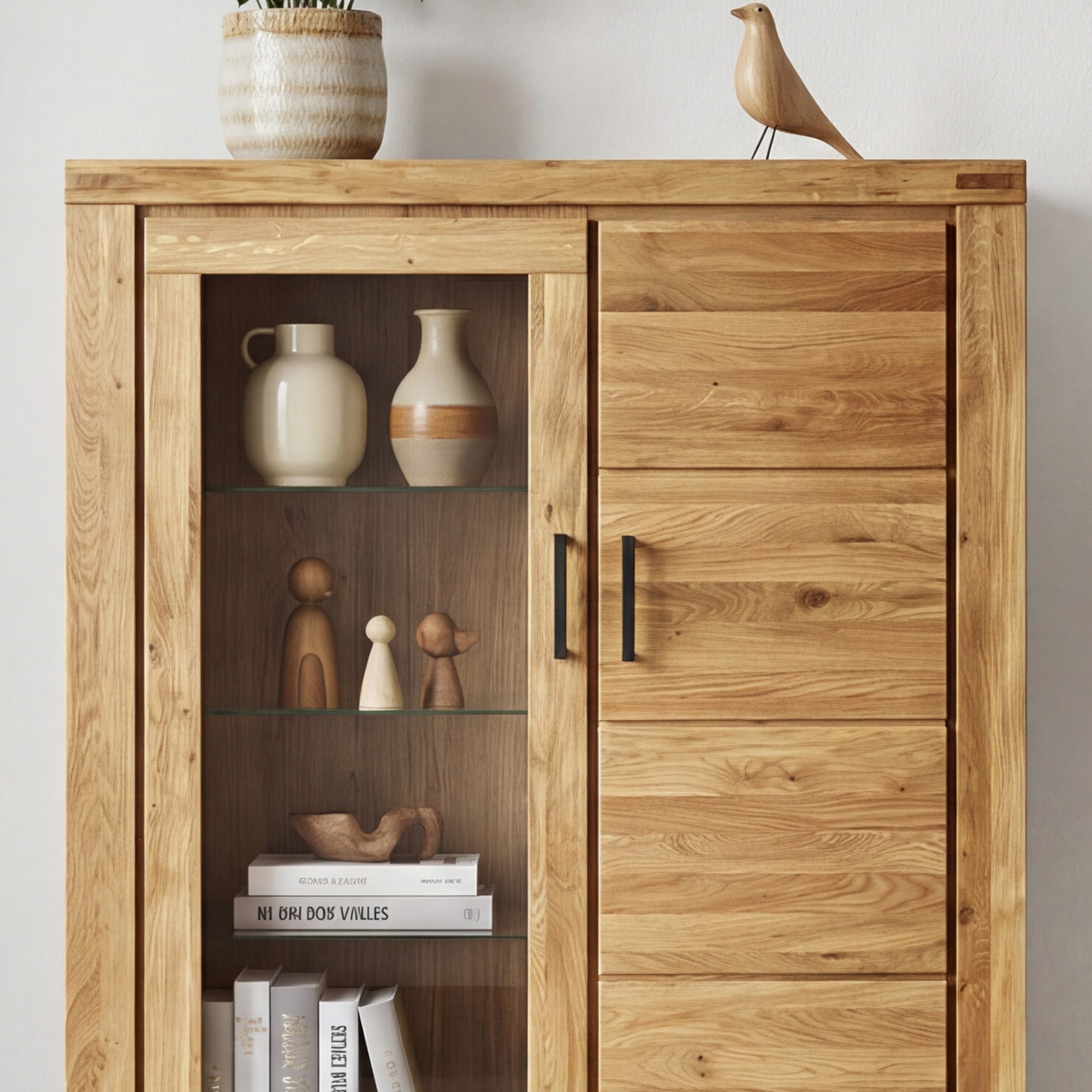 Eichenmöbel für das Wohnzimmer Martina – Massivholz- und Furnierkombination mit Vitrinen