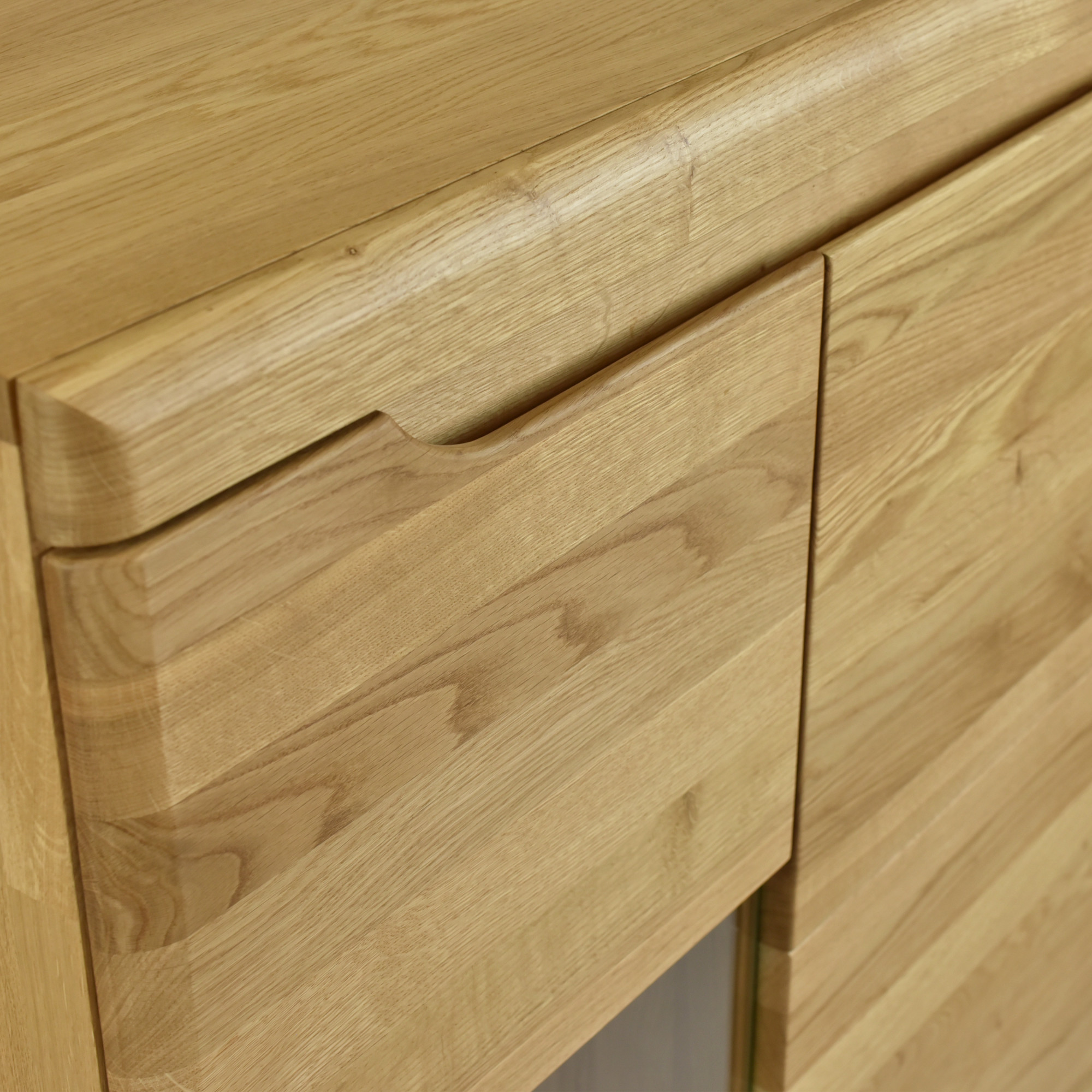 Eichenmöbel Praha im modernen skandinavischen Stil gefertigt. Diese Möbel zeichnen sich durch einfache Formen und ein luftiges Design aus, das auf den ersten Blick durch Eleganz und Minimalismus besticht. Schlanke Holzfüße verleihen den Möbeln nicht nur Leichtigkeit, sondern sorgen auch für Stabilität und Haltbarkeit. Jedes Stück dieser Kollektion ist aus Eichenholz gefertigt, behandelt mit italienischem ökologischem Öl der Marke Borma Wachs, das das Holz nicht nur schützt, sondern auch seine natürliche Schönheit und Textur betont. Besonderheit der Kollektion sind die Griffe, die direkt ins Holz gefräst sind, wodurch ein glattes und integrales Erscheinungsbild entsteht und zugleich Funktionalität gewährleistet wird.