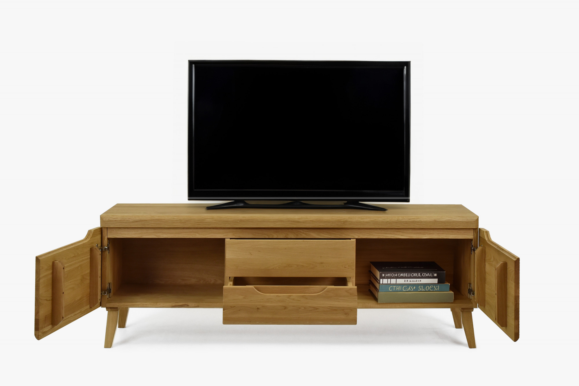 Eiche Wohnwand aus unserer Kollektion Praha ist ein perfektes Beispiel dafür, wie man Praktikabilität und minimalistisches skandinavisches Design verbindet. Hergestellt aus hochwertigem Eichenholz bringt diese Wohnwand nicht nur Funktionalität, sondern auch Wärme und natürliche Schönheit des Holzes in Ihr Wohnzimmer. Jedes Möbelstück dieses Sets – Zweiturige Vitrine, TV-Kommode und kleineres Highboard – steht auf eleganten Füßen, was dem gesamten Möbel Leichtigkeit und Luftigkeit verleiht. Die Oberflächenbehandlung mit dem Markenöl Borma Wachs aus Italien garantiert eine lange Lebensdauer und einfache Pflege.