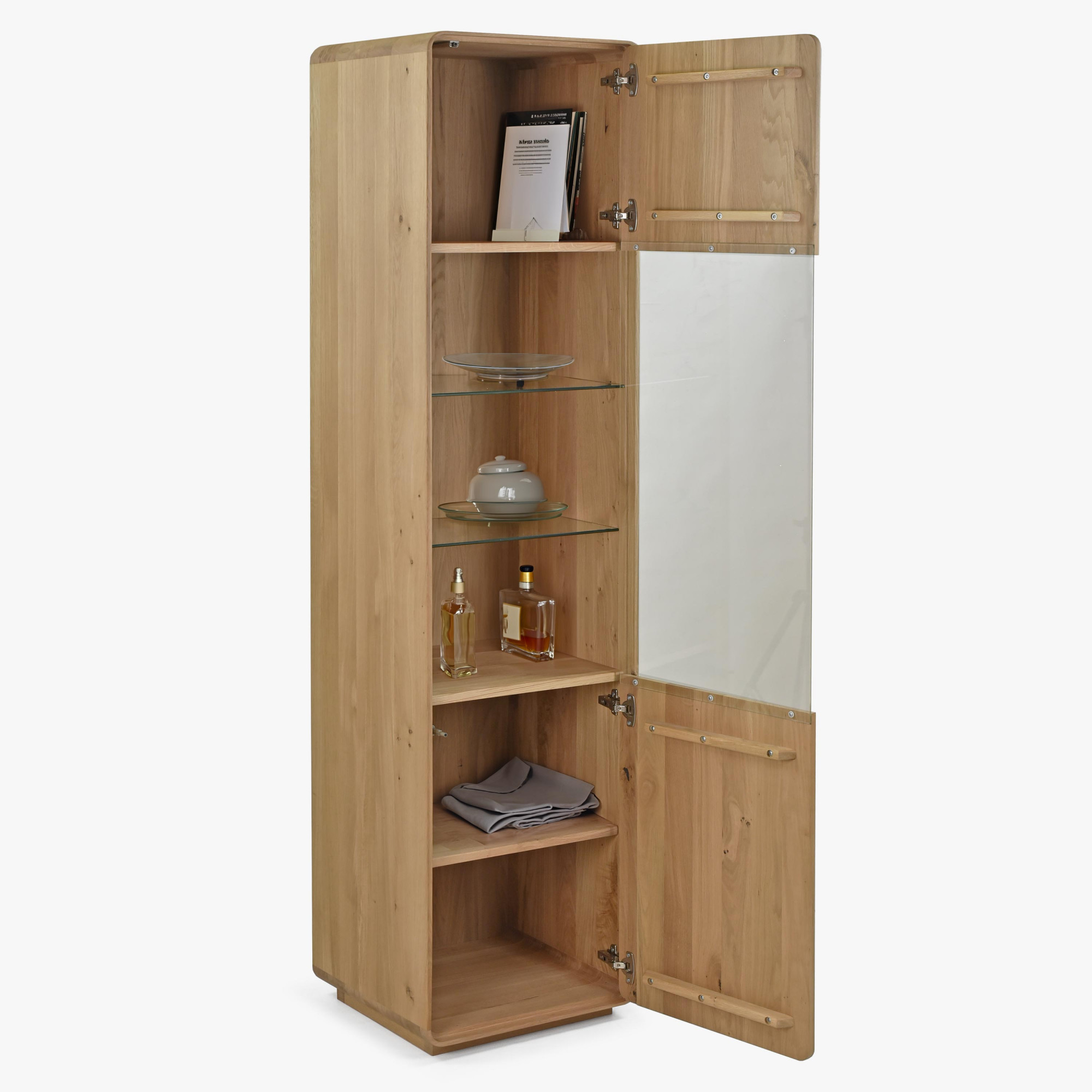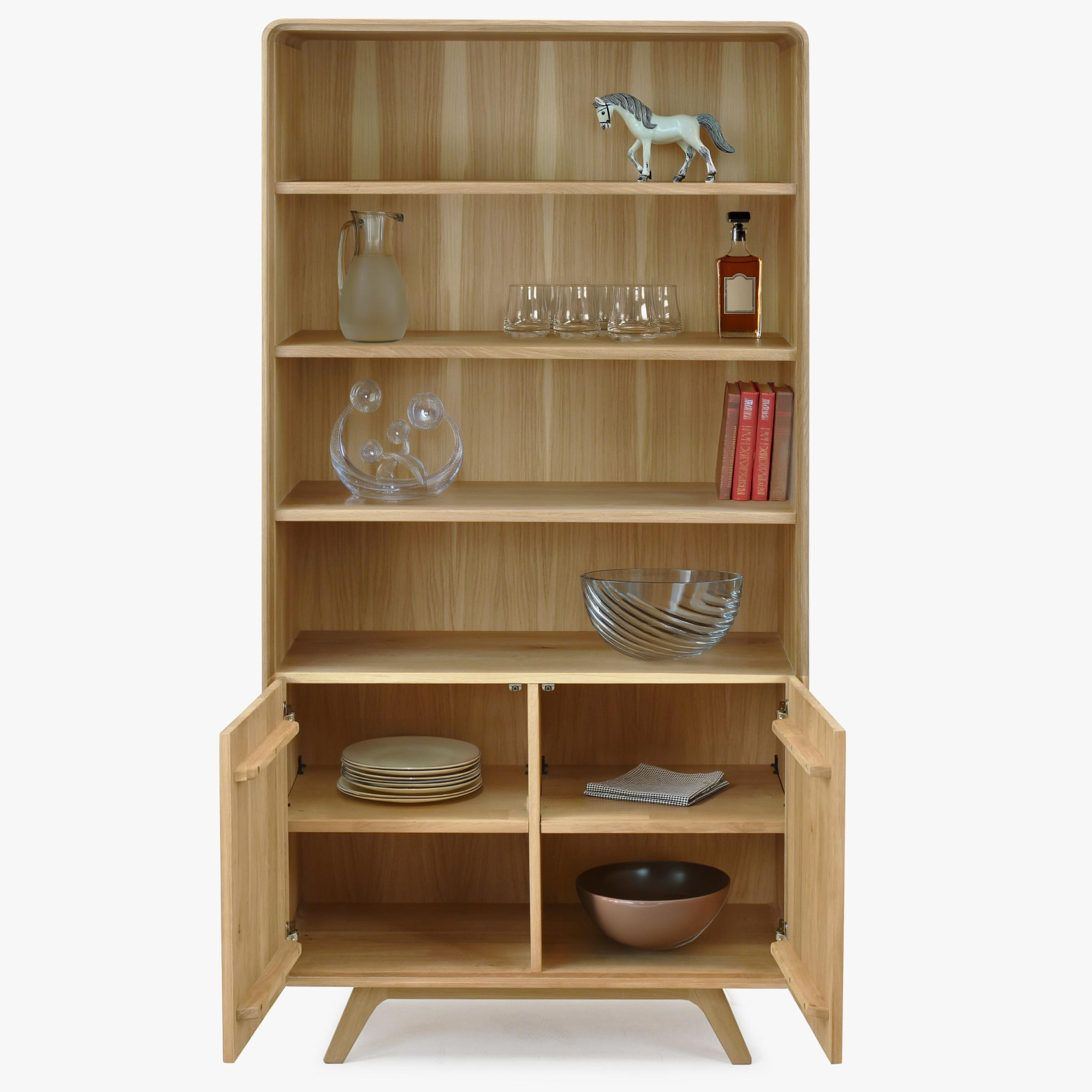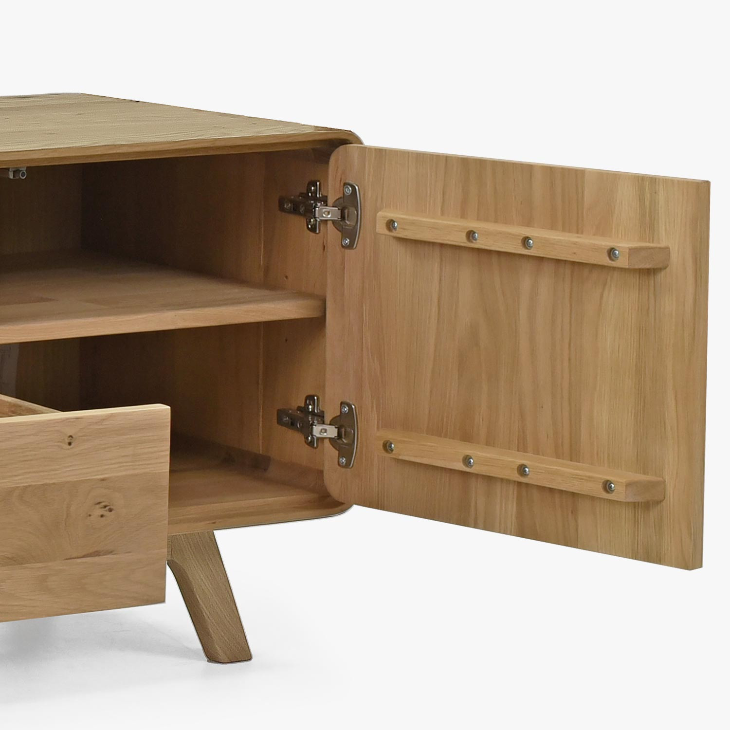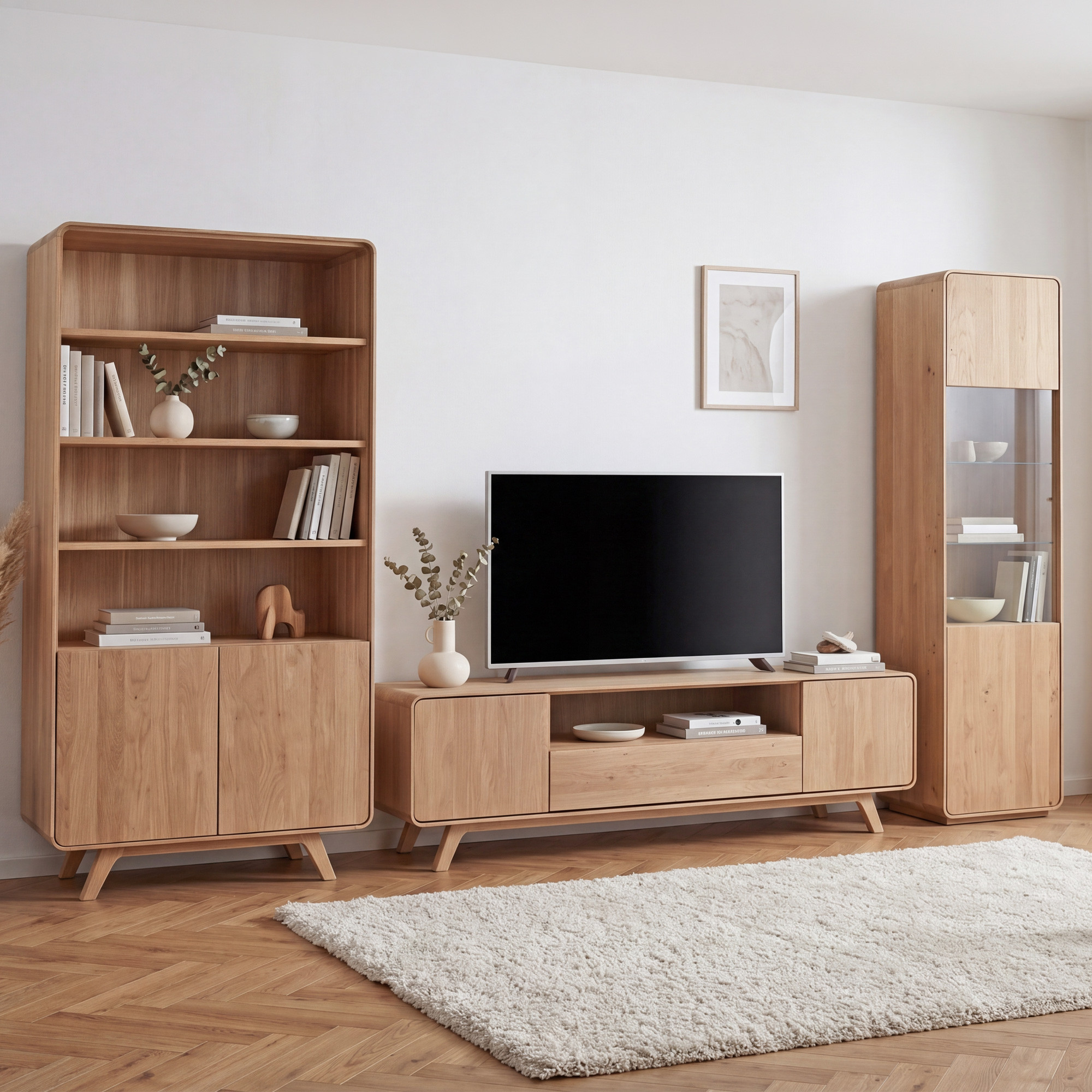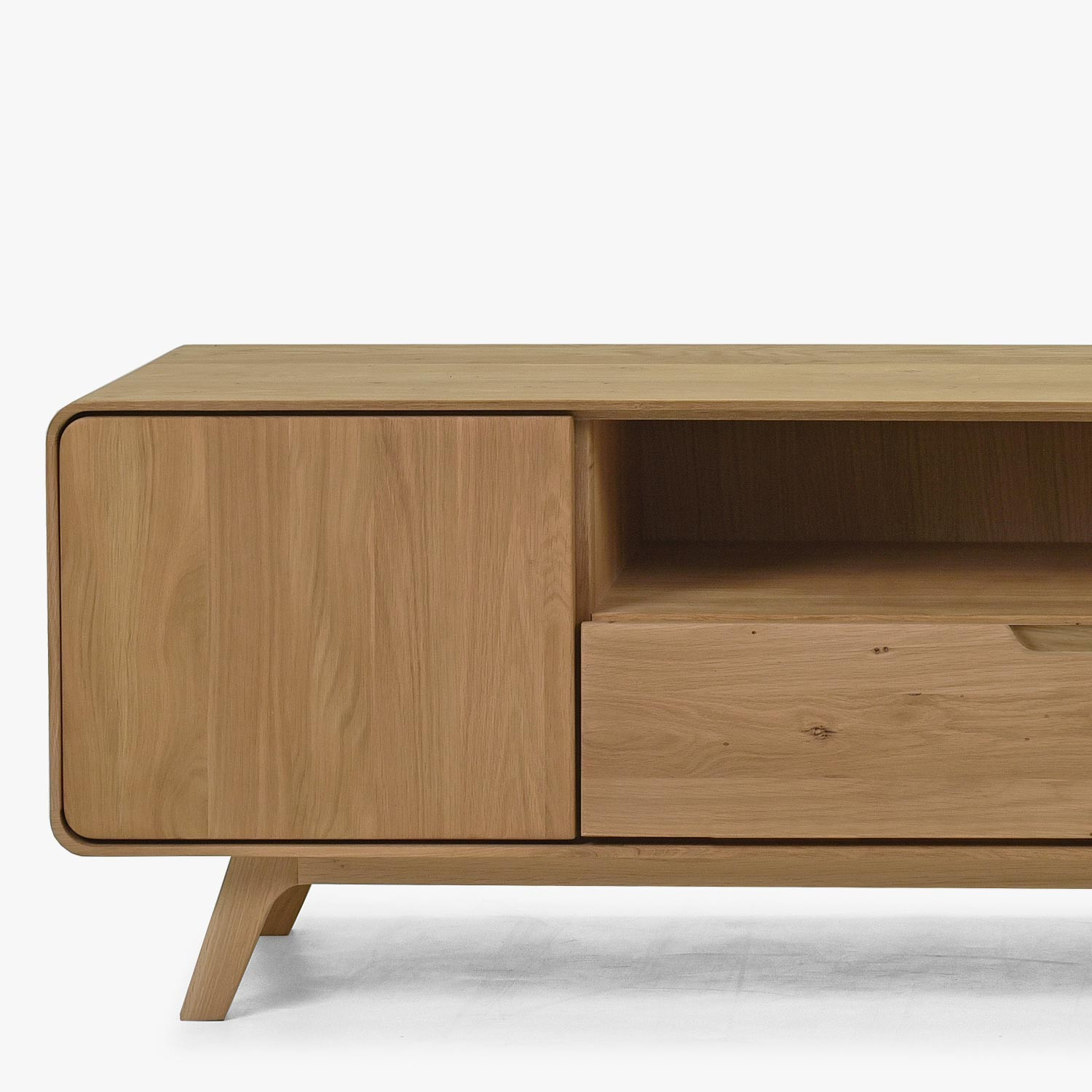 Holzwohnwand in der Farbe massiv weißer Eiche auf Füßen – abgerundet