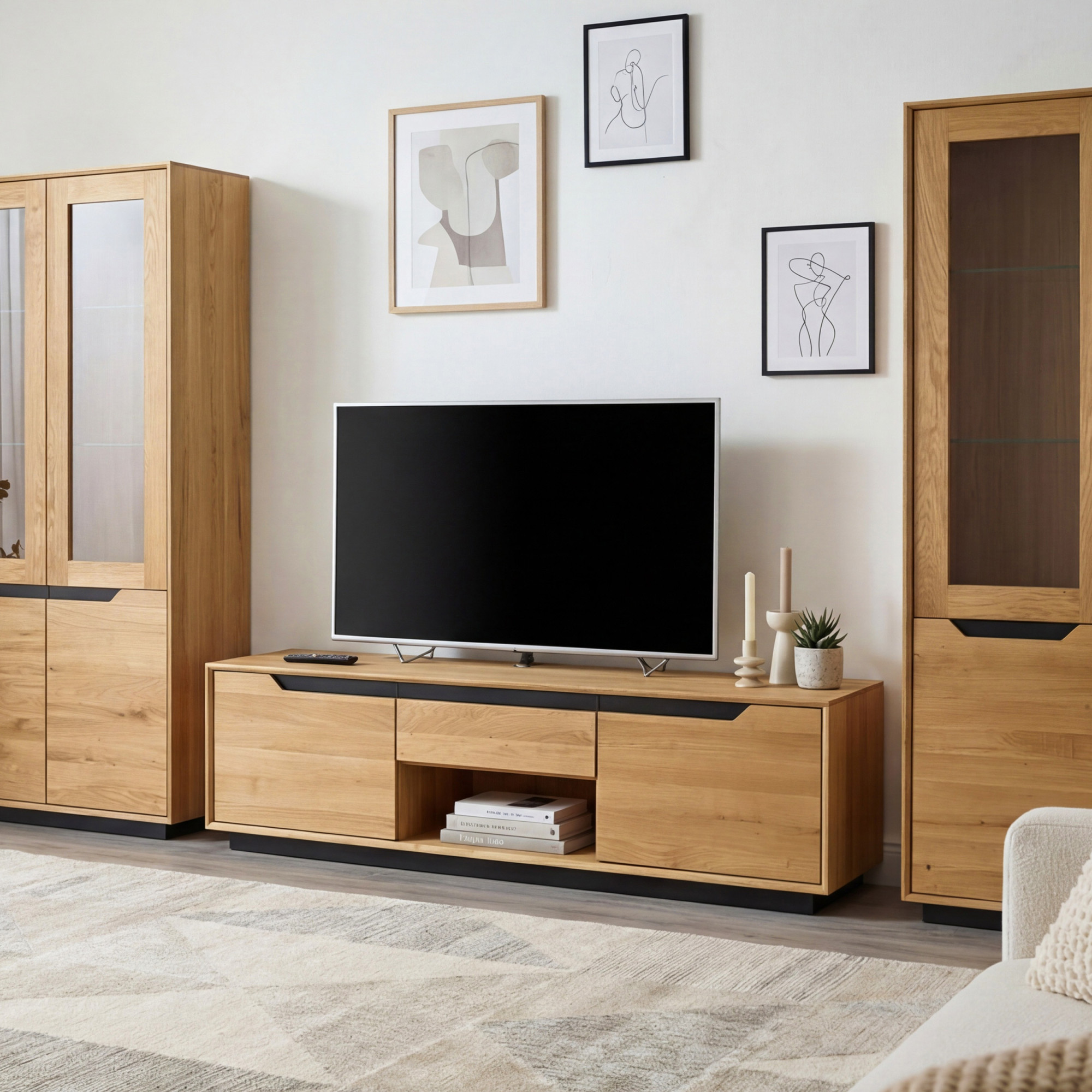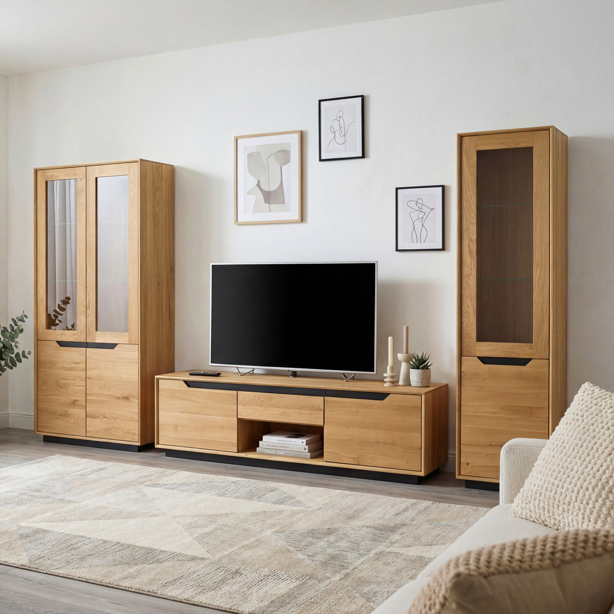 Diese Wohnwand besteht aus mehreren durchdacht gestalteten Teilen, die zusammen die perfekte Lösung für Ihr Wohnzimmer bilden. Das Set umfasst 1x zweiflügelige Vitrine, 1x TV-Kommode und 1x einflügelige Vitrine. Jedes Stück ist aus massivem Eichenholz gefertigt, das Ihrem Interieur ein natürliches, modernes und zeitloses Aussehen verleiht.