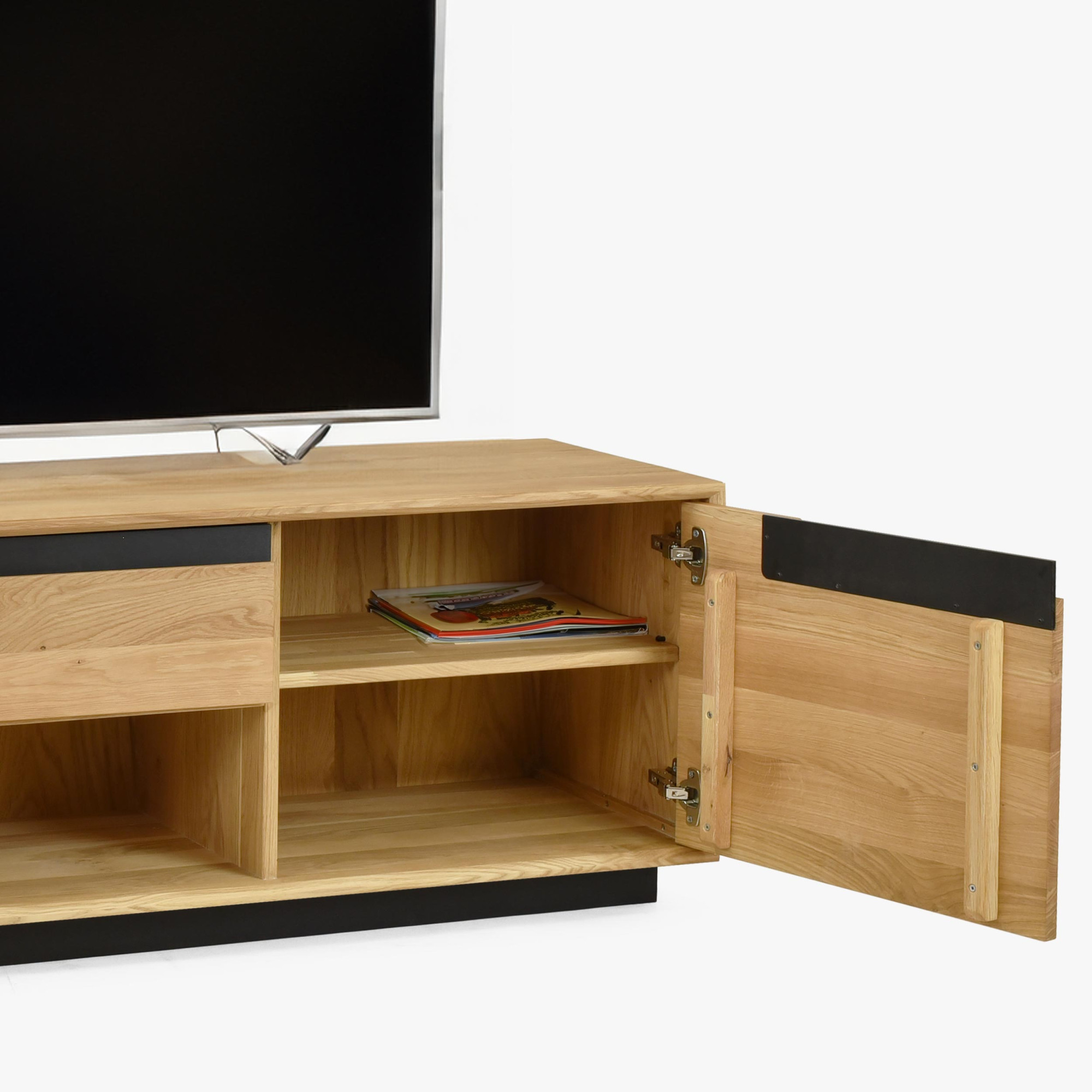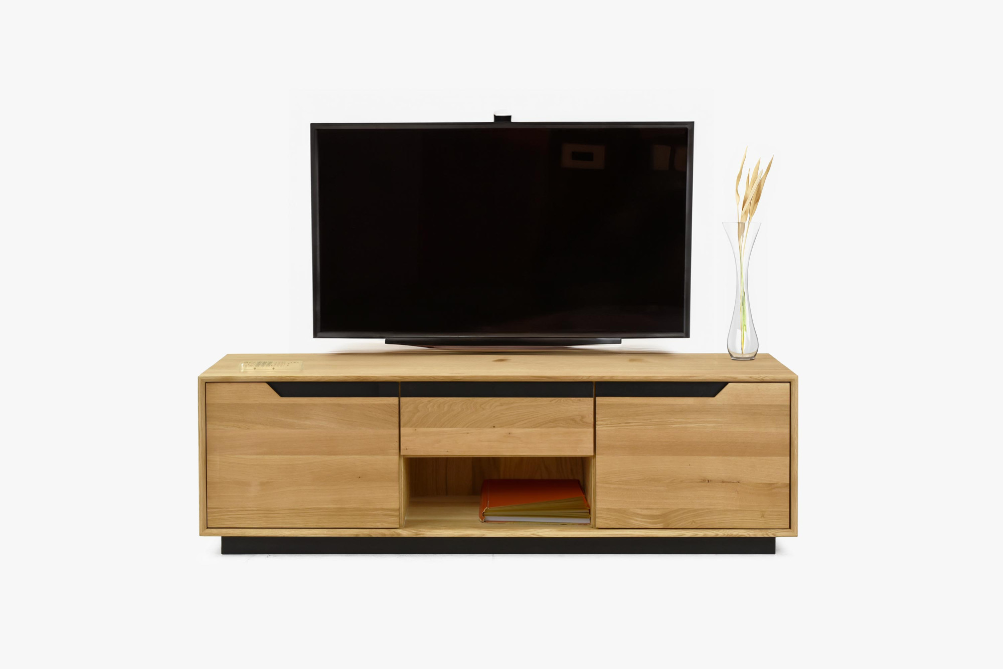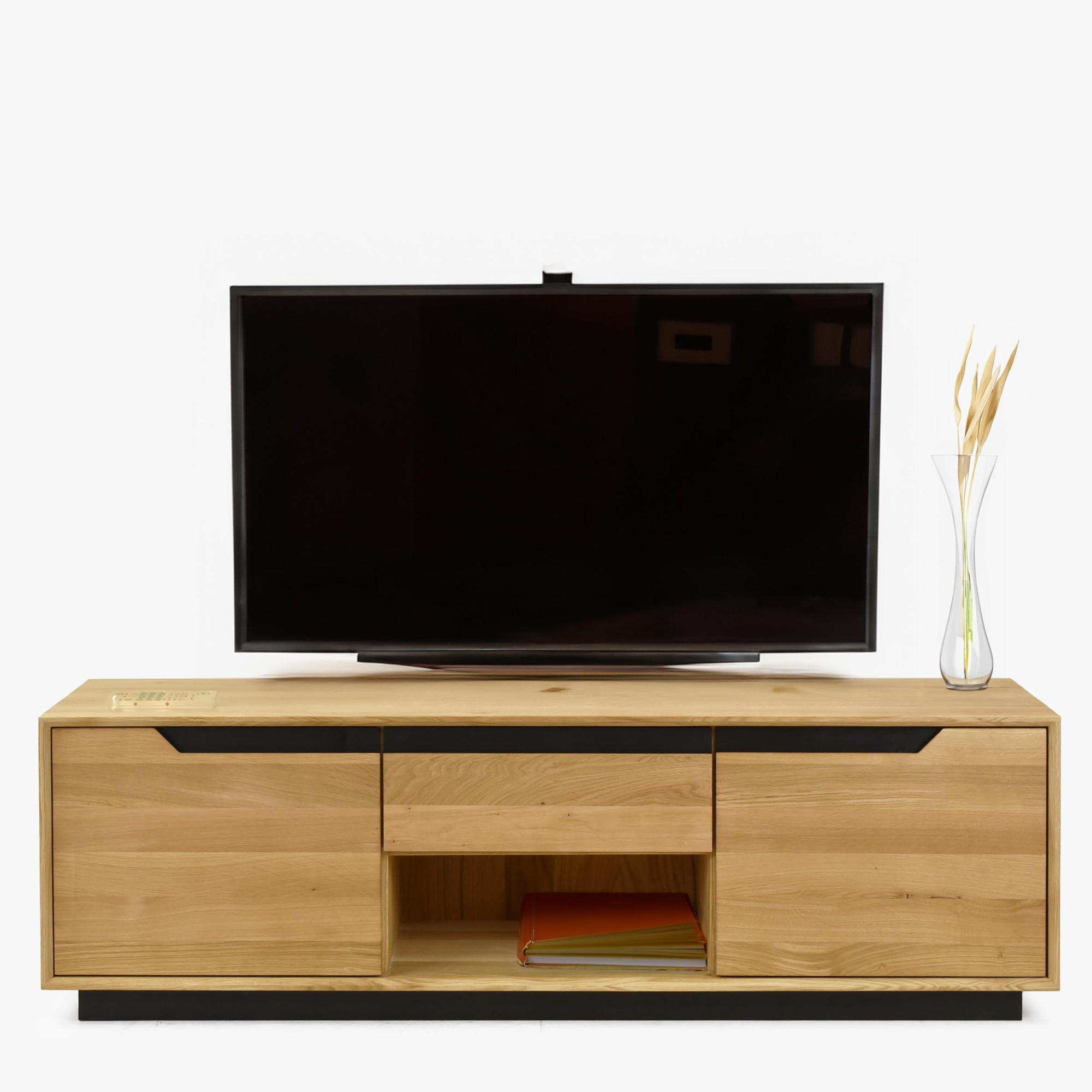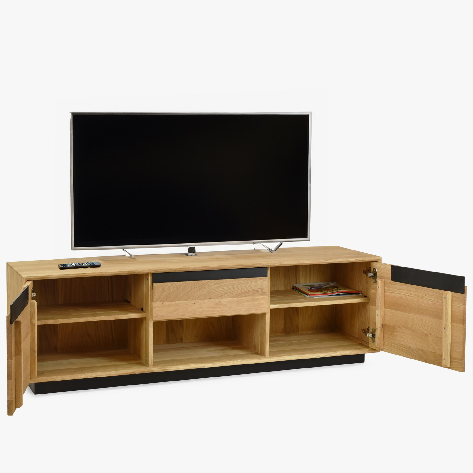 Dieses Möbelstück zeichnet sich nicht nur durch sein modernes minimalistisches Design aus, sondern auch durch durchdachte Details wie gefräste Kanten für einfaches Öffnen ohne Griffe und ein Soft-Close-System, das ein leises und sanftes Schließen der Türen gewährleistet. Die Oberfläche des Möbels ist mit natürlichem Öl der Marke Woca behandelt, das das Holz schützt und seine Schönheit betont. Die Farbe Eiche natural, ergänzt durch schwarze Details, verleiht der Wohnwand ein modernes Aussehen, das sich leicht in jedes Interieur einfügt.