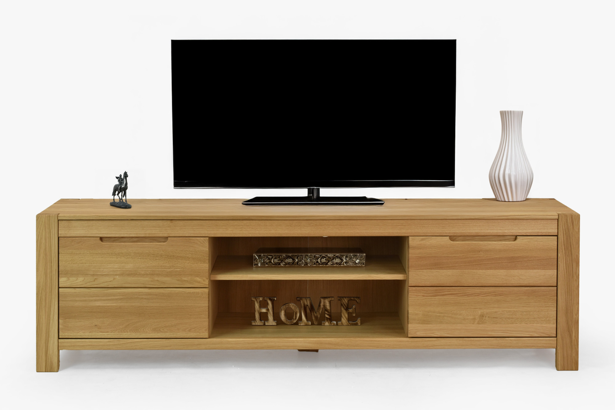 Eiche Möbel für das Wohnzimmer aus der Kollektion Napolen bieten eine harmonische Verbindung von natürlichem Aussehen, langer Lebensdauer und clevere Praktikabilität. Das Set besteht aus einer eichen TV-Kommode mit einer Breite von 200 cm und einer eichen Vitrine mit Glastüren – zusammen bilden sie ein einheitliches, zeitloses Ensemble für moderne als auch klassische Innenräume. Fronten, Oberplatten und stabile Beine sind aus massiver Eiche, die Seiten und sichtbaren Innenflächen aus hochwertigem Eichfurnier; verdeckte Konstruktionsbestandteile sind aus widerstandsfähigem Material in Eiche-Dekor zur Steigerung der Stabilität gefertigt. Die Oberfläche im Farbton Eiche Natural ist mit natürlichem Öl behandelt, das die Holzmaserung hervorhebt und eine einfache lokale Auffrischung ermöglicht.