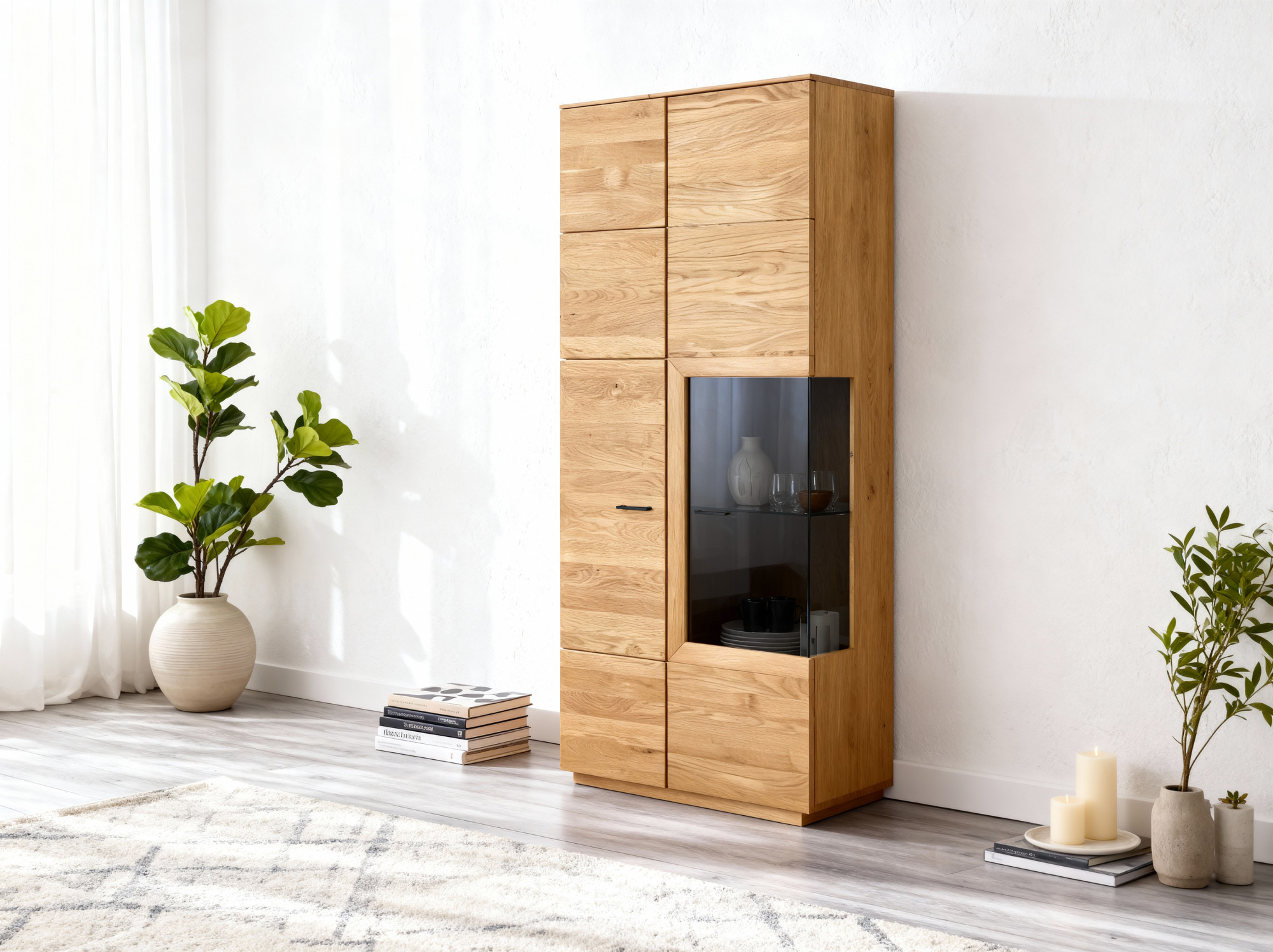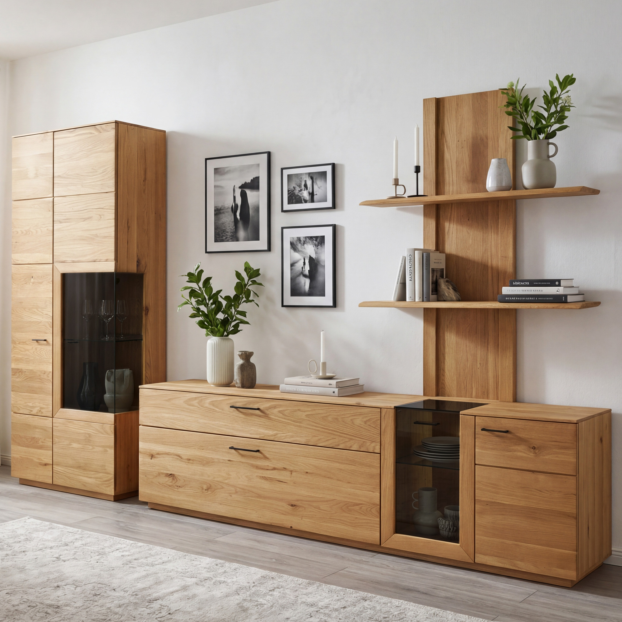 Eichenwohnwand mit Vitrine, Regalen und TV-Kommode – komplette Möbel für das Wohnzimmer