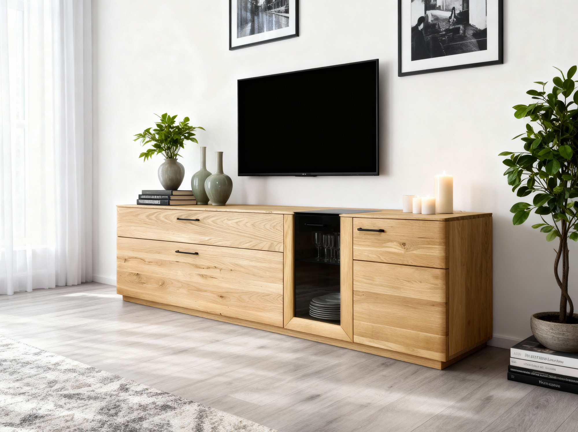 Eichenwohnwand mit Vitrine, TV-Kommode und Regalen, natur