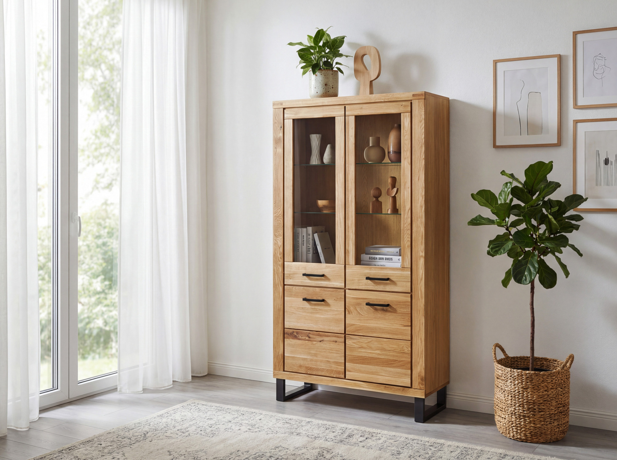 Suchen Sie eine komplette Lösung für Ihr Wohnzimmer, die modernes Design mit hochwertiger Verarbeitung und günstigen Preis verbindet? Wir präsentieren Ihnen die Eiche Wohnwand Martina, bestehend aus einer langen TV-Kommode und zwei eleganten verglasten Vitrinen. Dieses zeitlose Set ist entworfen für Liebhaber minimalistischer Interieurs, die das natürliche und klare Erscheinungsbild von Holz schätzen. Die Fronttüren sind aus massivem Eichenholz gefertigt und mit natürlichem Öl behandelt, das die Holzmaserung hervorhebt und dem Möbelstück einen authentischen Charakter verleiht. Die Oberplatten und Seiten bestehen aus natürlichem Eichenfurnier, der Innenkorpus ist aus Eichenlaminat.