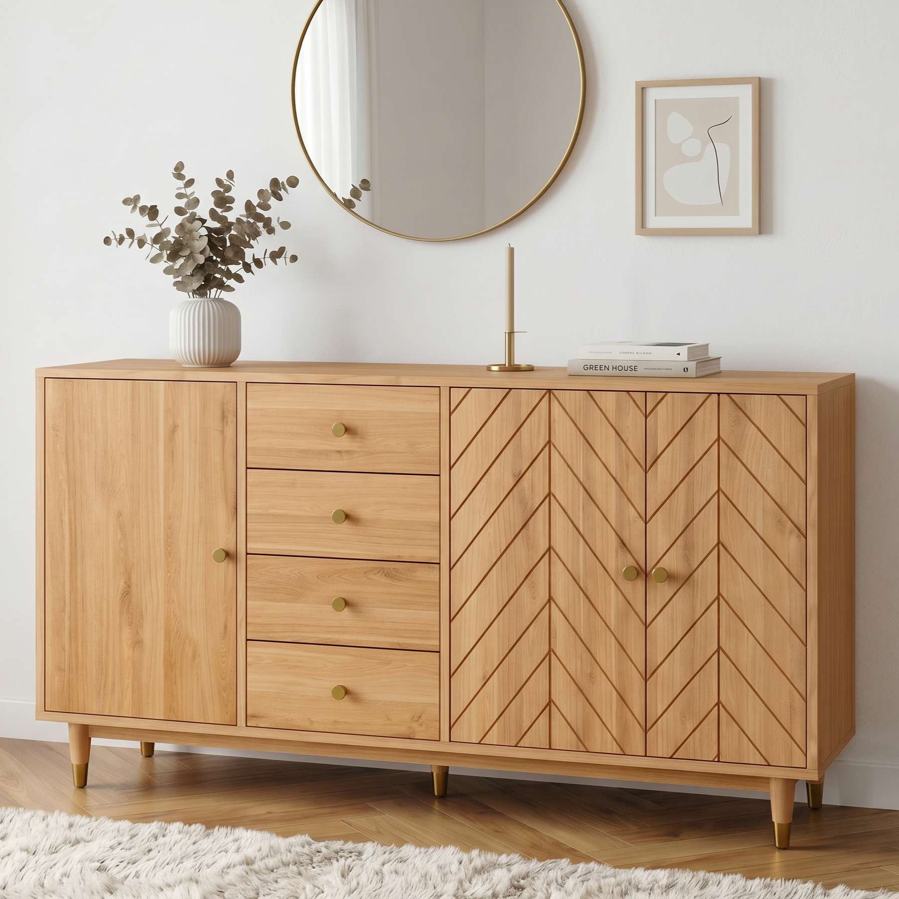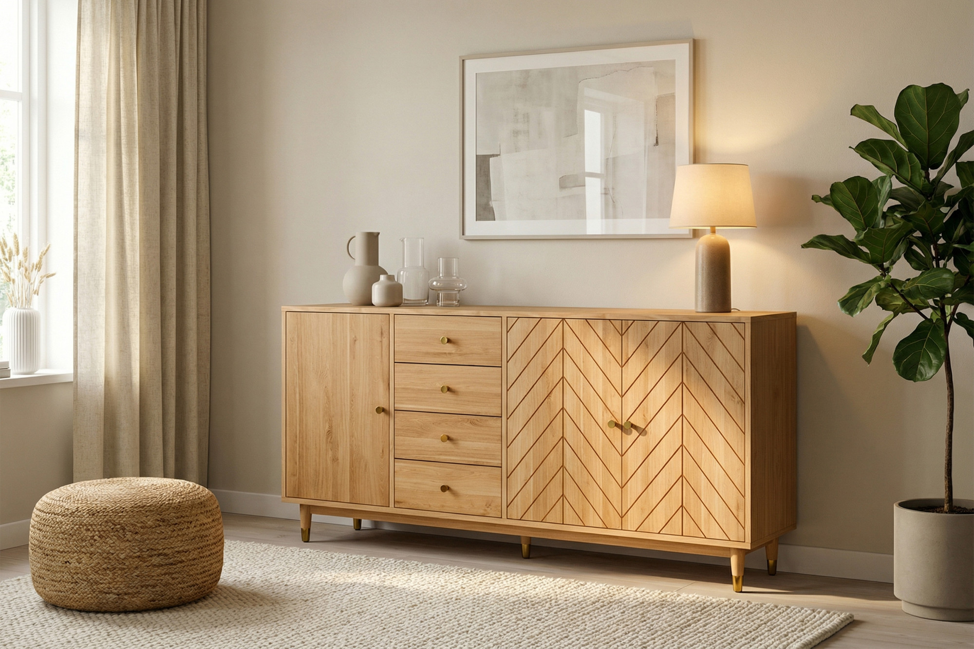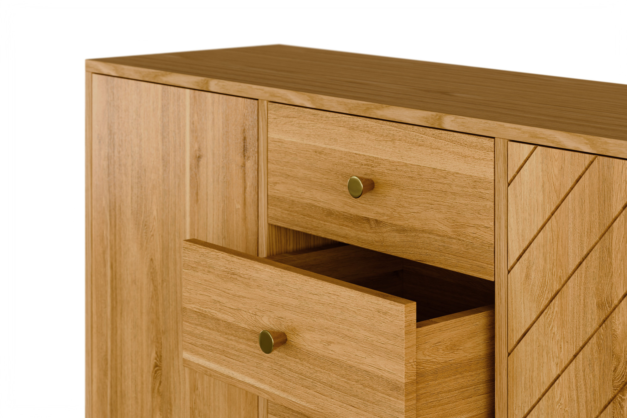 Massive Eichenkommode Jessica 190 cm mit gefrästem Fischgrätmuster – elegante Kommode für das Wohnzimmer