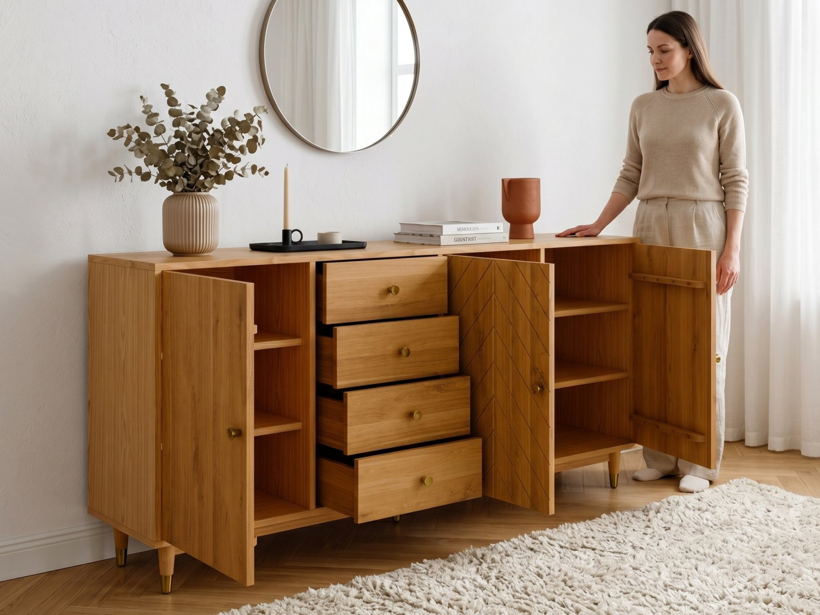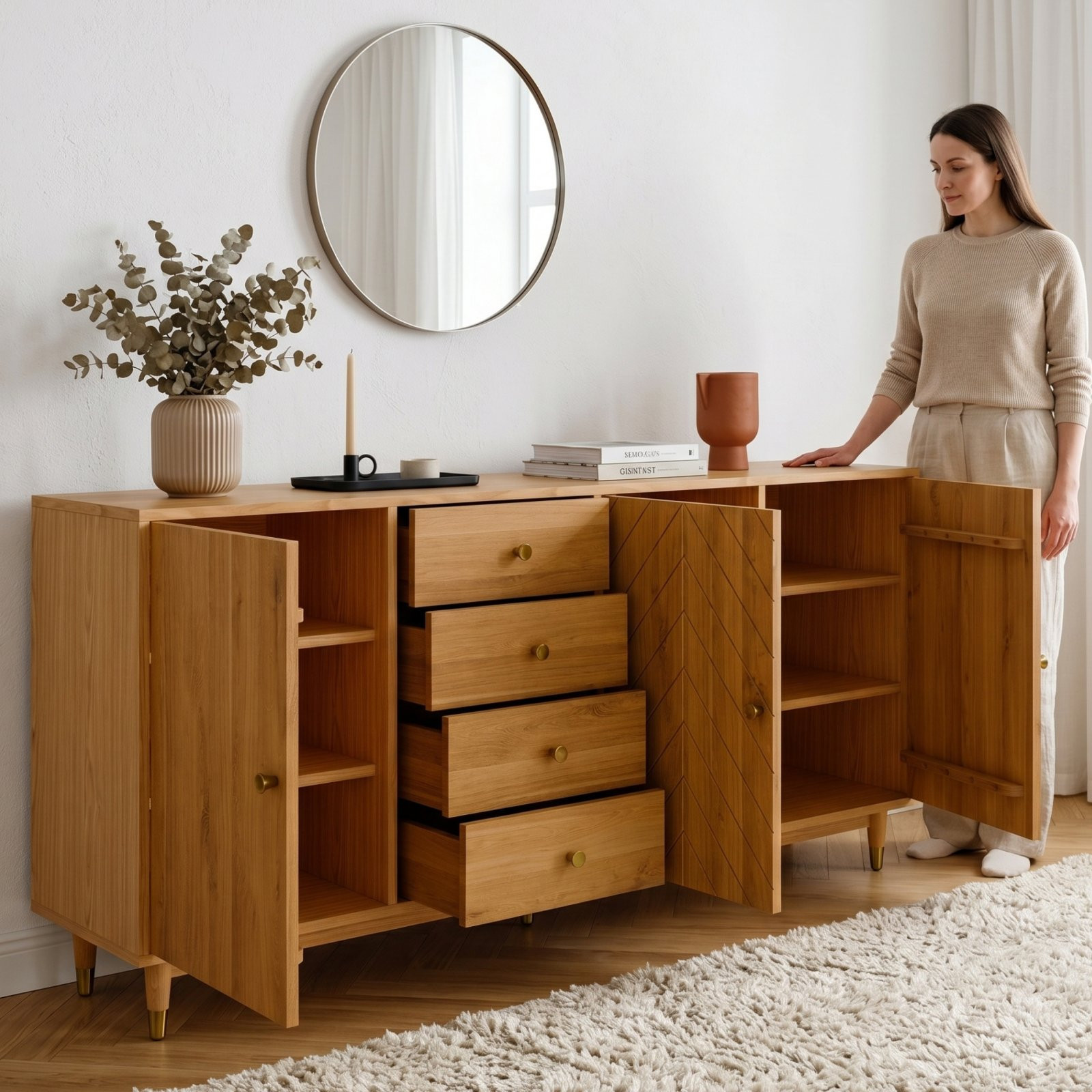 Ja, im Inneren befinden sich 6 Regalböden, die genügend Platz für Geschirr, Dokumente, Wohntextilien und weitere Haushaltsgegenstände bieten. - Was sind die wichtigsten Designelemente dieser Kommode?
