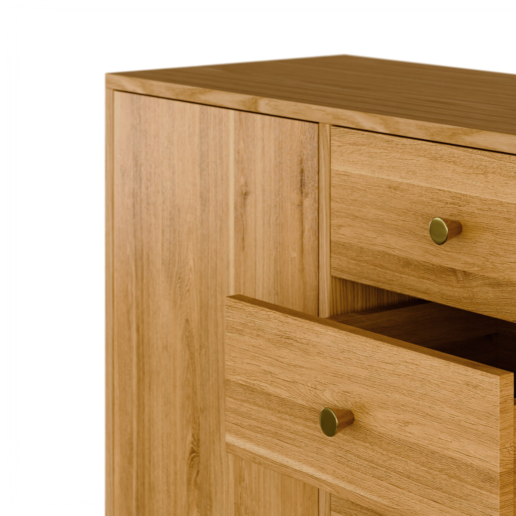 Die Kommode aus der Kollektion Jessica bietet nicht nur ein raffiniertes Aussehen, sondern auch durchdachte Funktionalität für den täglichen Gebrauch. Innen finden Sie 6 Regalböden aus beschichteter Platte, die ausreichend Platz für Geschirr, Dokumente, Textilien und Dekoration bieten. Der luxuriöse Charakter wird durch Messingknöpfe und goldfarbene Metallakzente an den Beinen unterstrichen. Den Komfort beim Gebrauch erhöhen Schaniere und Schubladenauszugsführungen mit Soft-Close-Funktion. Die Kommode wird zerlegt mit Anleitung geliefert, sodass sie sich leicht zu Hause zusammenbauen lässt. Wenn Sie eine Designkommode aus Naturholz zu einem erschwinglichen Preis suchen, ist das Modell Jessica eine ausgezeichnete Wahl.