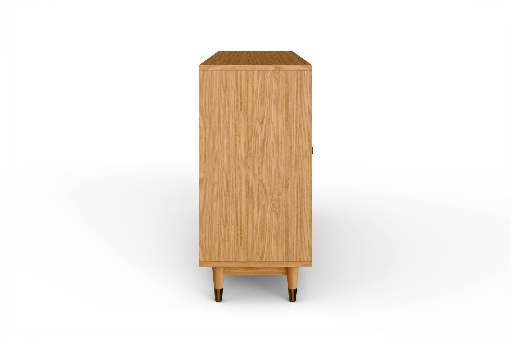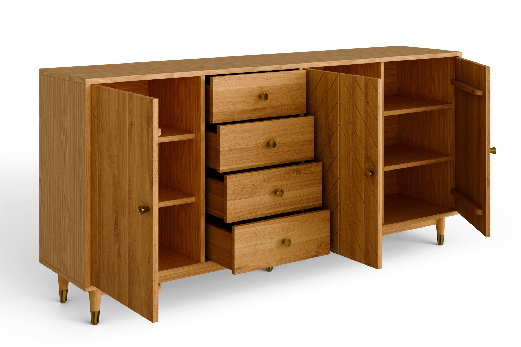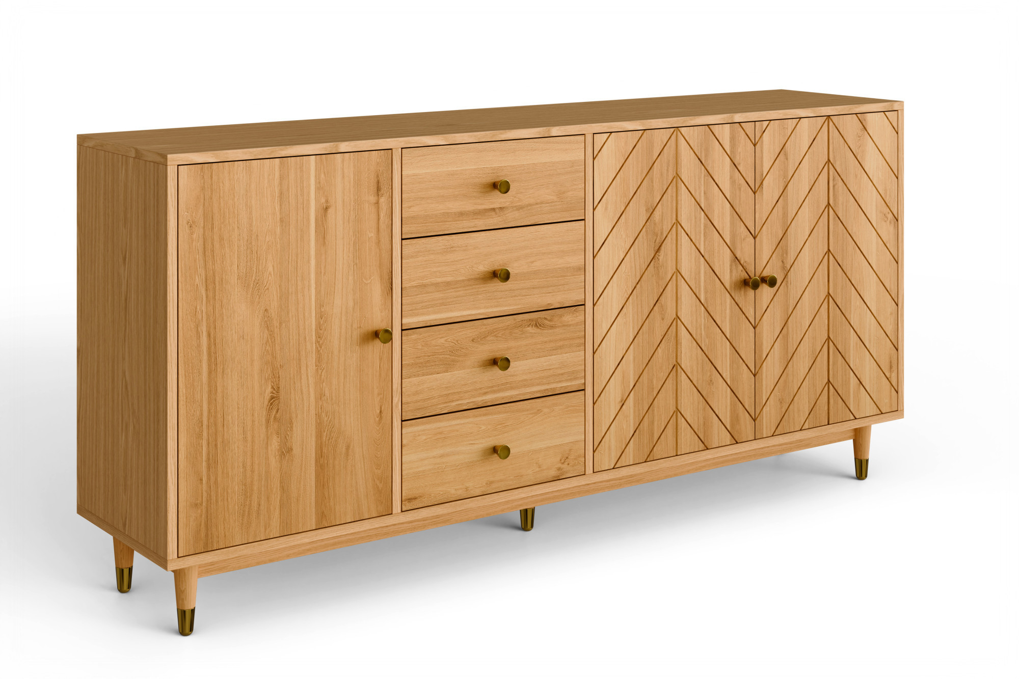 Suchen Sie eine massive Eichenkommode, die natürliche Materialien, zeitloses Design und praktische Aufbewahrungslösungen verbindet? Die Kommode Jessica mit einer Breite von 190 cm besticht auf den ersten Blick durch das markante gefräste Fischgrätmuster an den rechten Türen, das dem Möbelstück ein luxuriöses und originelles Aussehen verleiht. Die Front, die Beine und die Stützleiste sind aus massivem Eichenholz gefertigt, während die Oberplatte und die Seiten mit Eichenfurnier bezogen sind. Alle Holzelemente sind mit farblosem Öl-Wachs behandelt, das die Oberfläche schützt und gleichzeitig die natürliche Maserung des Eichenholzes zur Geltung bringt. Dank seiner Verarbeitung passt diese Eichenkommode fürs Wohnzimmer in moderne, skandinavische sowie elegante Interieurs.