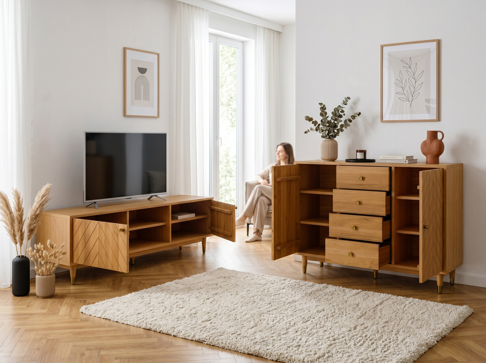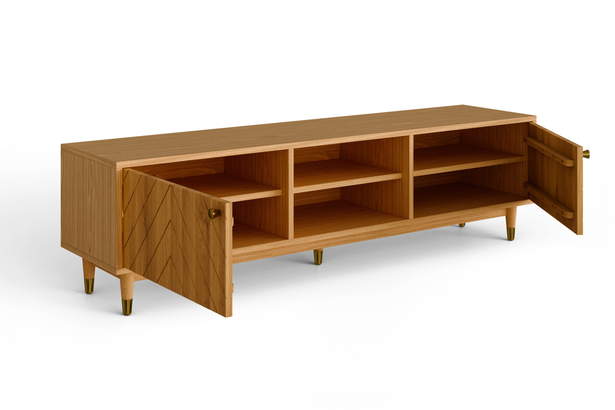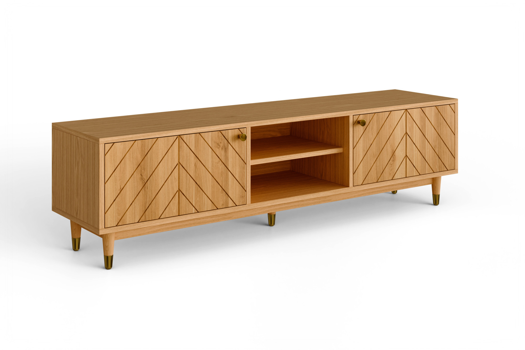 Suchen Sie eine elegante und praktische TV-Kommode aus Naturholz, die durch Design und Verarbeitungsqualität überzeugt? Die massive TV-Kommode Jessica mit einer Breite von 179 cm ist die ideale Wahl für das Wohnzimmer, wo ihr gefrästes Fischgrätmuster an den Türen sowie elegante goldfarbene Details besonders zur Geltung kommen. Die Fronten, Beine und Stützleiste sind aus massivem Eichenholz gefertigt, während das sichtbare Fach, die Oberplatte und die Seiten mit hochwertigem Furnier beschichtet sind. Dadurch erhalten Sie eine Eichen-TV-Kommode, die natürlichen Look, Stabilität und einen günstigeren Preis direkt vom Hersteller verbindet. Farbloser Öl-Wachs hebt zudem die Holzmaserung hervor und schützt die Oberfläche bei der täglichen Nutzung.